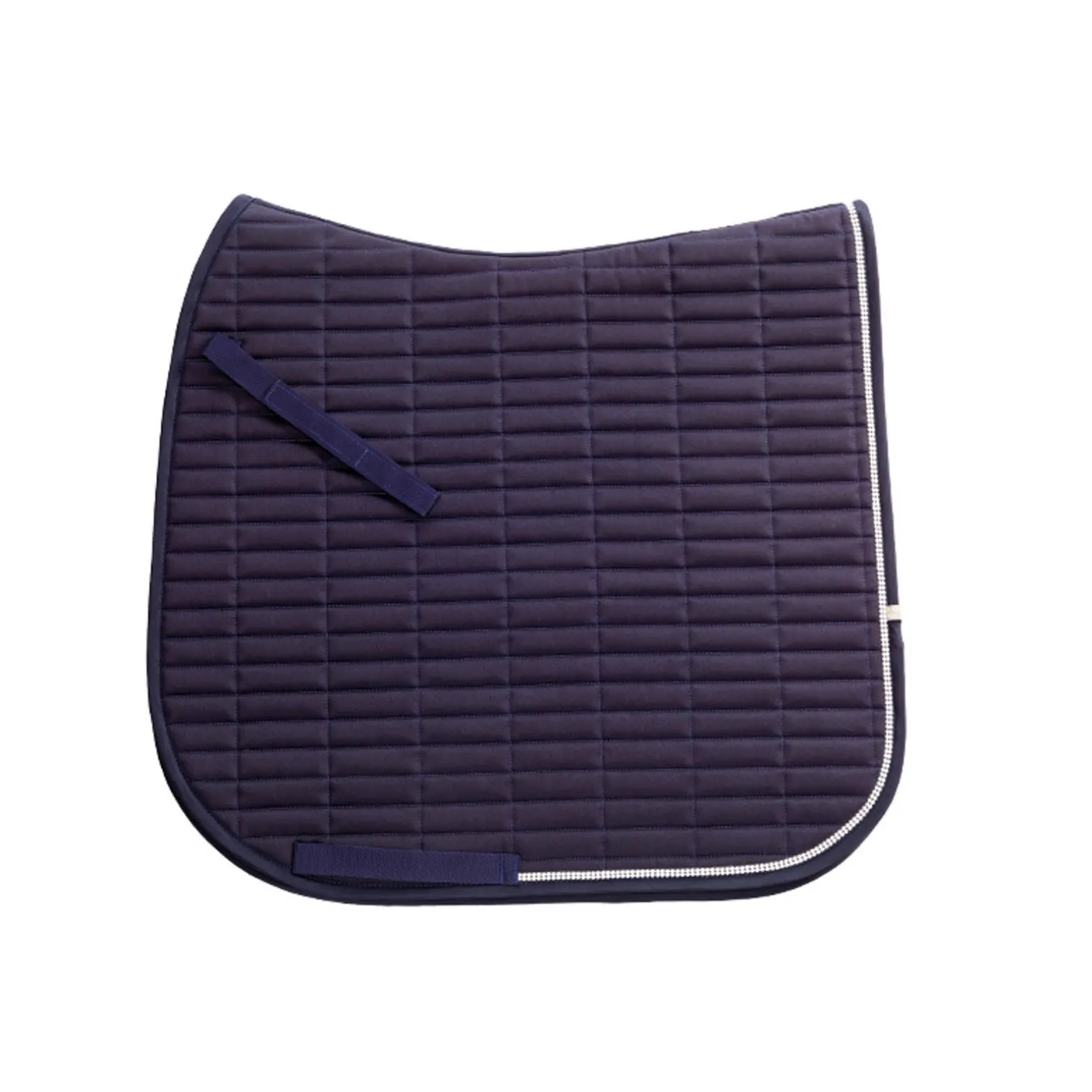 Strasssteine und ein Einfass in Satin verzieren den Rand der gesteppten Schabracke. Die feste Füllung und der geschwungende Rückenbereich bieten einen optimalen Sitz. Schweißaufsaugendes Untermaterial.