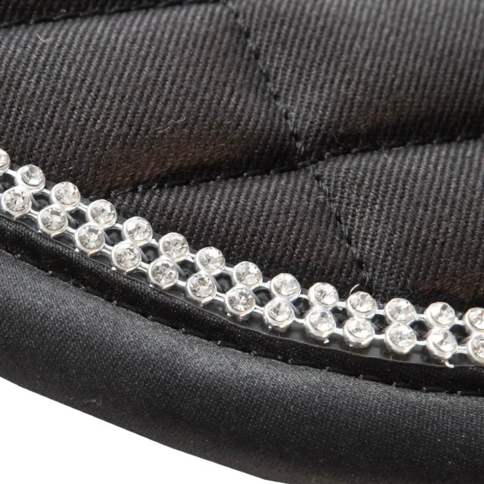 Strasssteine und ein Einfass in Satin verzieren den Rand der gesteppten Schabracke. Die feste Füllung und der geschwungende Rückenbereich bieten einen optimalen Sitz. Schweißaufsaugendes Untermaterial.
