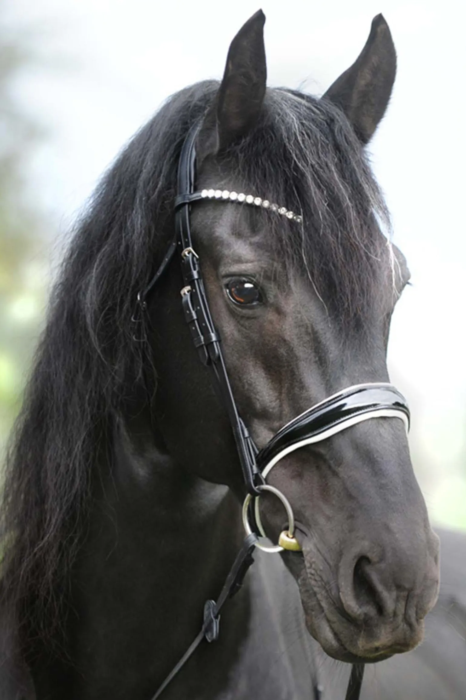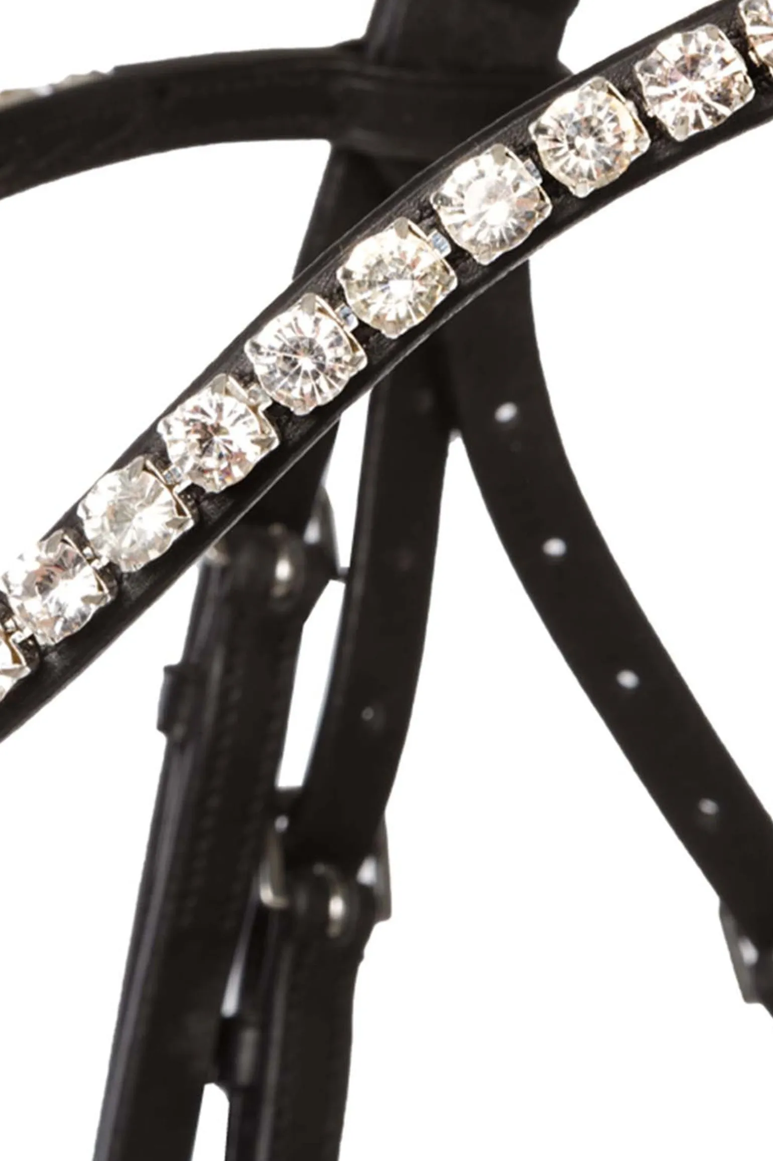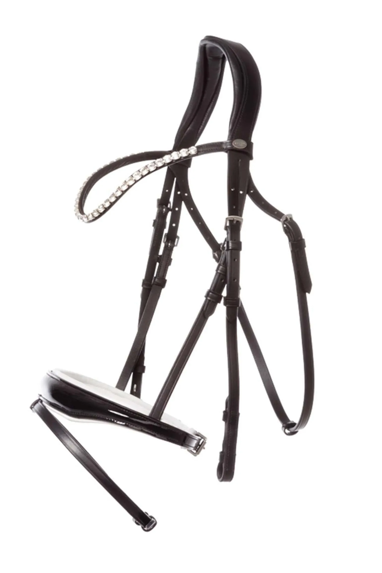 Die englisch-kombinierte Dressurtrense „Juliana“ KavalSH4 überzeugt nicht nur durch ihr schickes Aussehen, sondern auch durch höchsten Tragekomfort: Das Genickstück hat im Ohrenbereich ein Gelpadding, das besonders weich und anschmiegsam ist. Durch das weiche Padding wird der Druck im empfindlichen Ohrenbereich gedämpft. Zusätzlich hat das Genickstück eine anatomische Form, um den Ohren genügend Freiheit zu geben. Der Nasenriemen ist weich unterlegt und schmal zulaufend. Das Stirnband in seiner geschwungenden Form und den großen weißen Strasssteinen sieht an jedem Pferdekopf absolut schick aus. Der Trensenzaum wird mit schmalen Zügeln geliefert.
