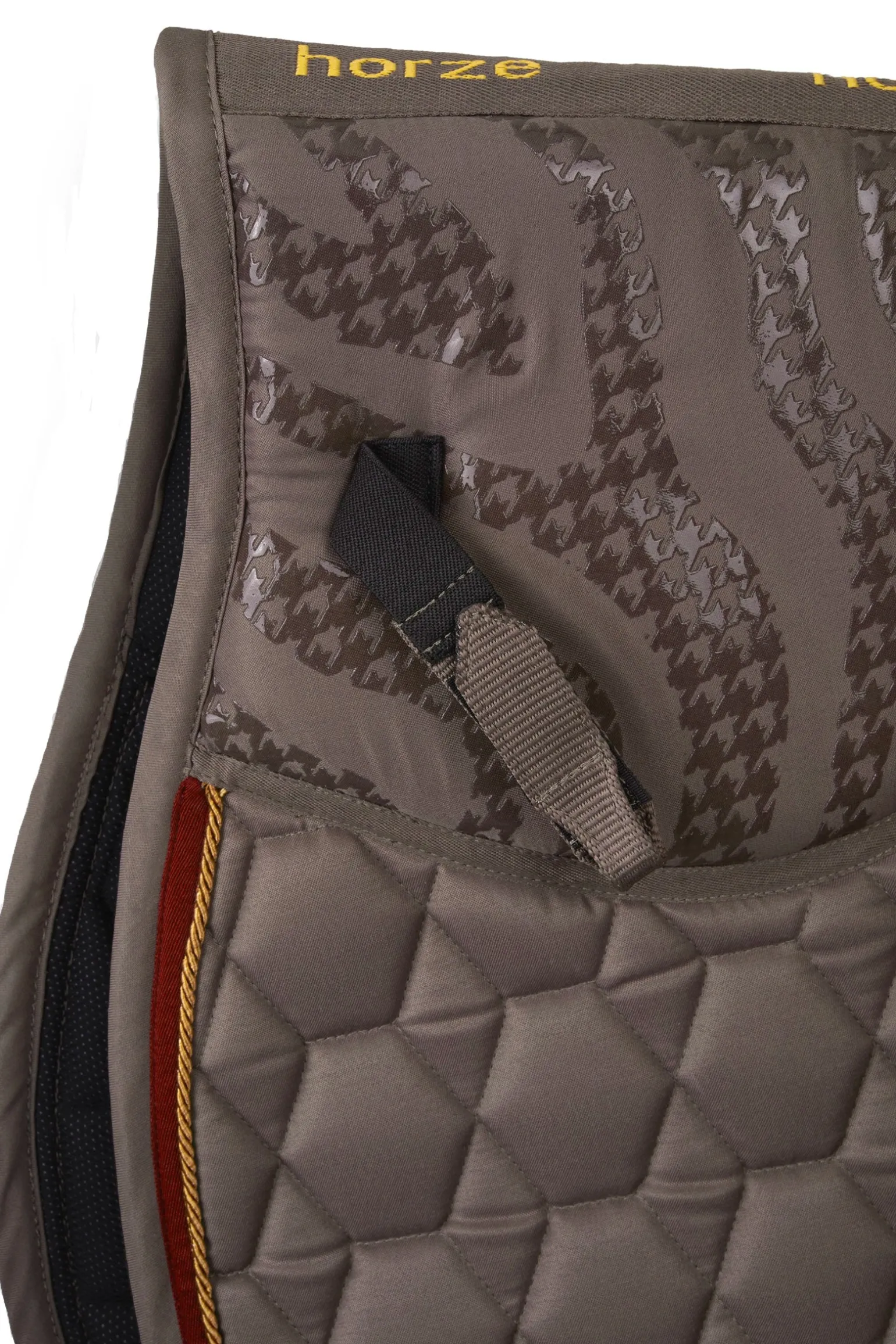 Die anatomisch geschnittene Horze Kenya Schabracke ist mit einem Silikondetail ausgestattet, das ein Verrutschen des Sattels verhindert. Eine leichte Polsterung unterhalb des Sattels sorgt für zusätzlichen Komfort. Das feuchtigkeitsableitende Futter hält den Rücken deines Pferdes trocken. Drei Paspelreihen und das zeitlose Design sorgen für einen klassischen Look. Metallic-Details sorgen für einen eleganten Look. Kombiniere diese Schabracke mit dem Rest unseres Horze Kenya-Sortiments, um ein komplettes Outfit zu erhalten.