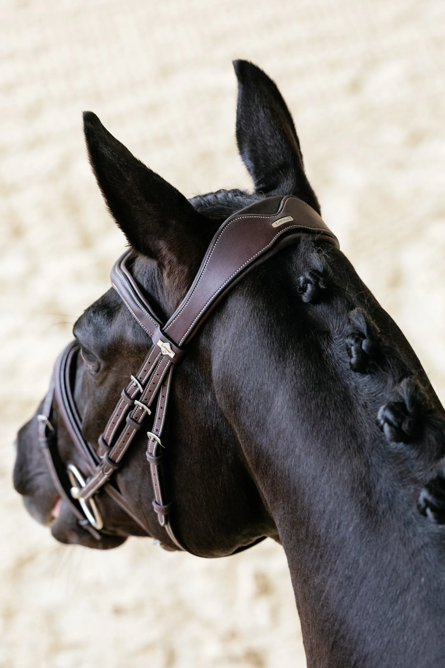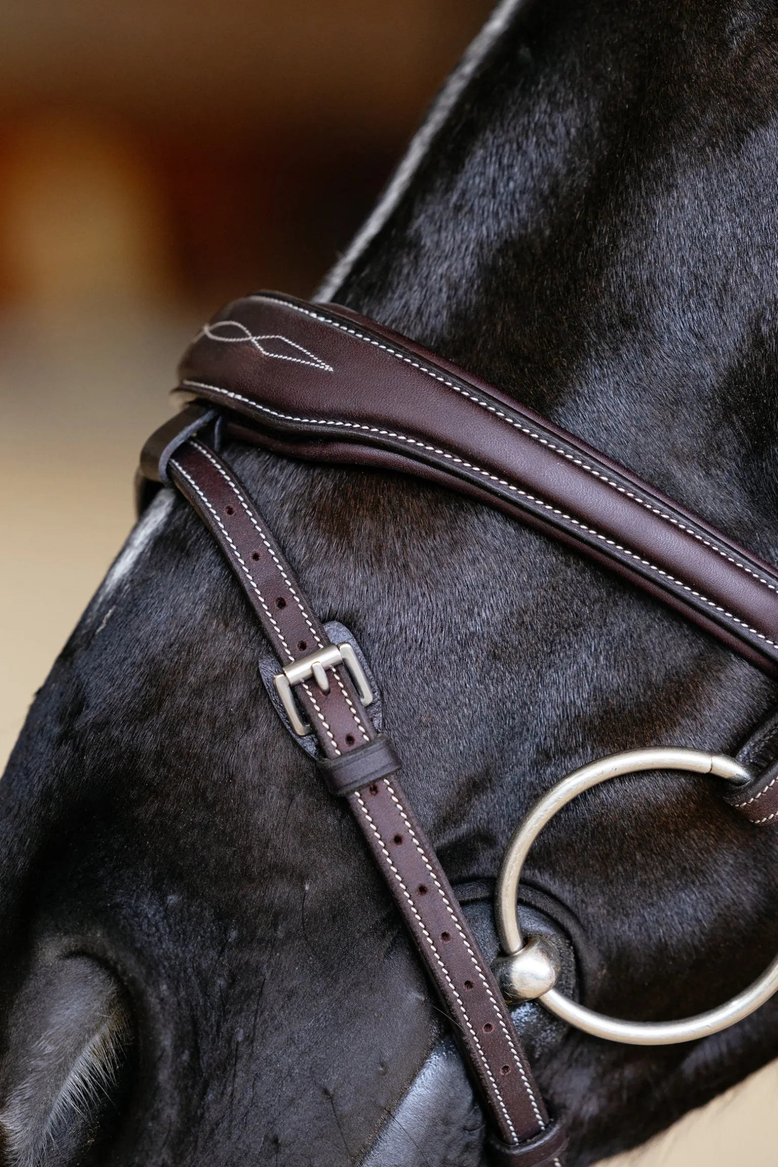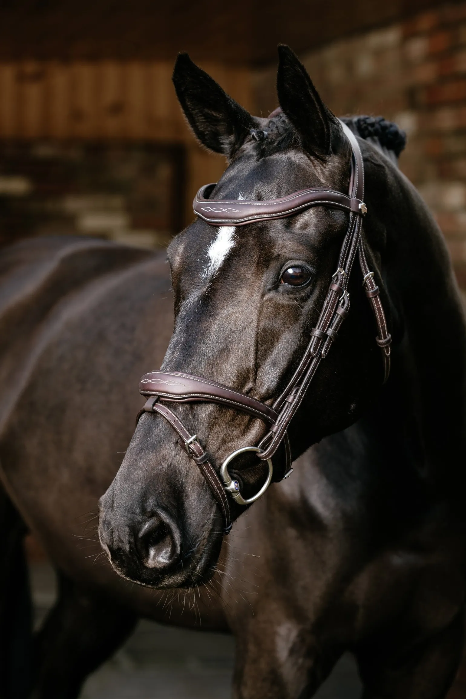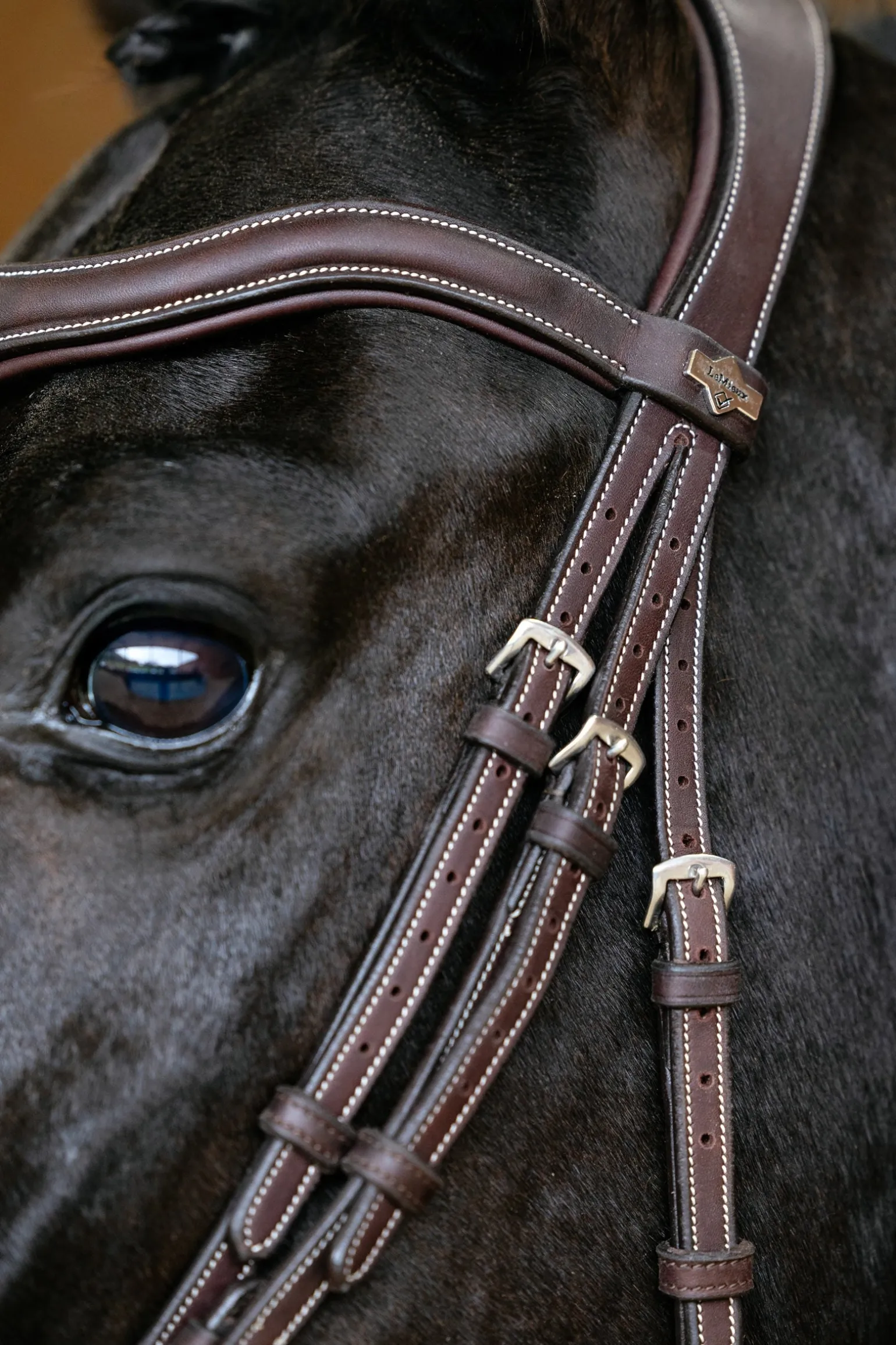Das Kudos Contour Zaumzeug steht für echte Qualität – mit elegant geformtem, gepolstertem Stirn- und Nasenriemen samt dekorativer Ziernaht und einem abnehmbaren Sperrriemen. Die dezente Schlaufe für den Sperrriemen liegt bündig im Nasenriemen und lässt sich bei Bedarf vollständig entfernen, wodurch sich dieser schöne Trensenzaum für viele Pferde eignet. Für maximalen Komfort werden sensible Druckpunkte ausgespart und eine gute Durchblutung ermöglicht. Das anatomisch geformte Genickstück mit weich gepolstertem Ausschnitt im Ohren- und Nackenbereich trägt zur gleichmäßigen Druckverteilung bei.
