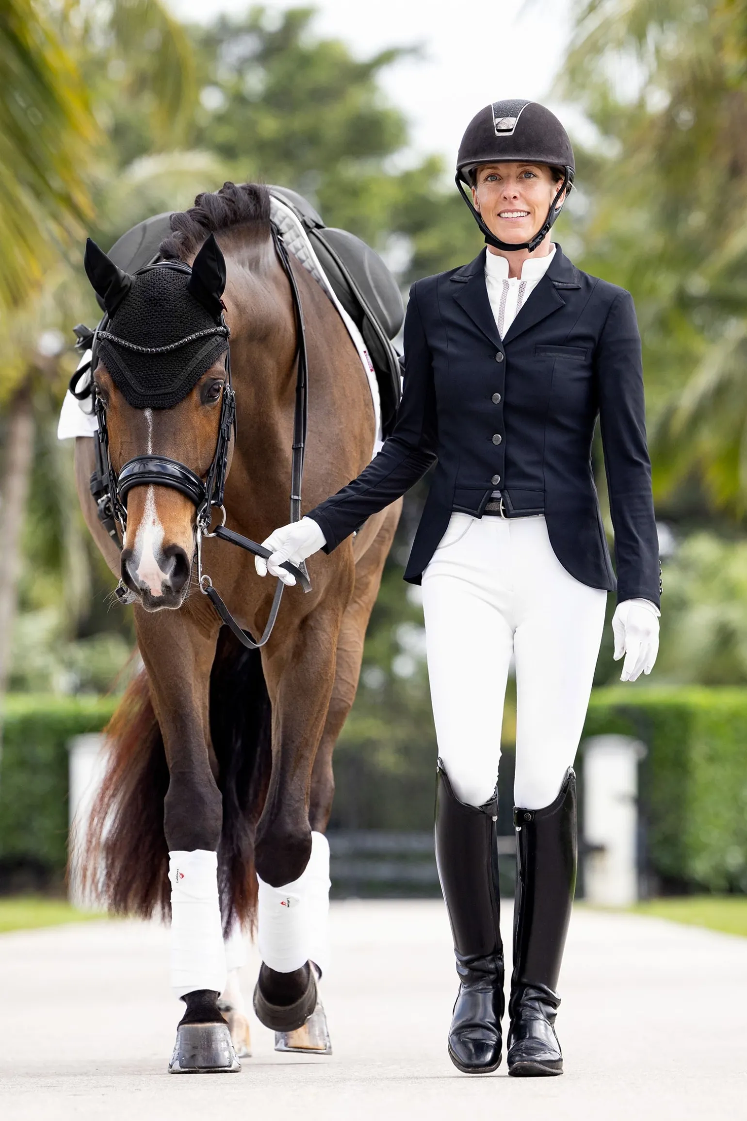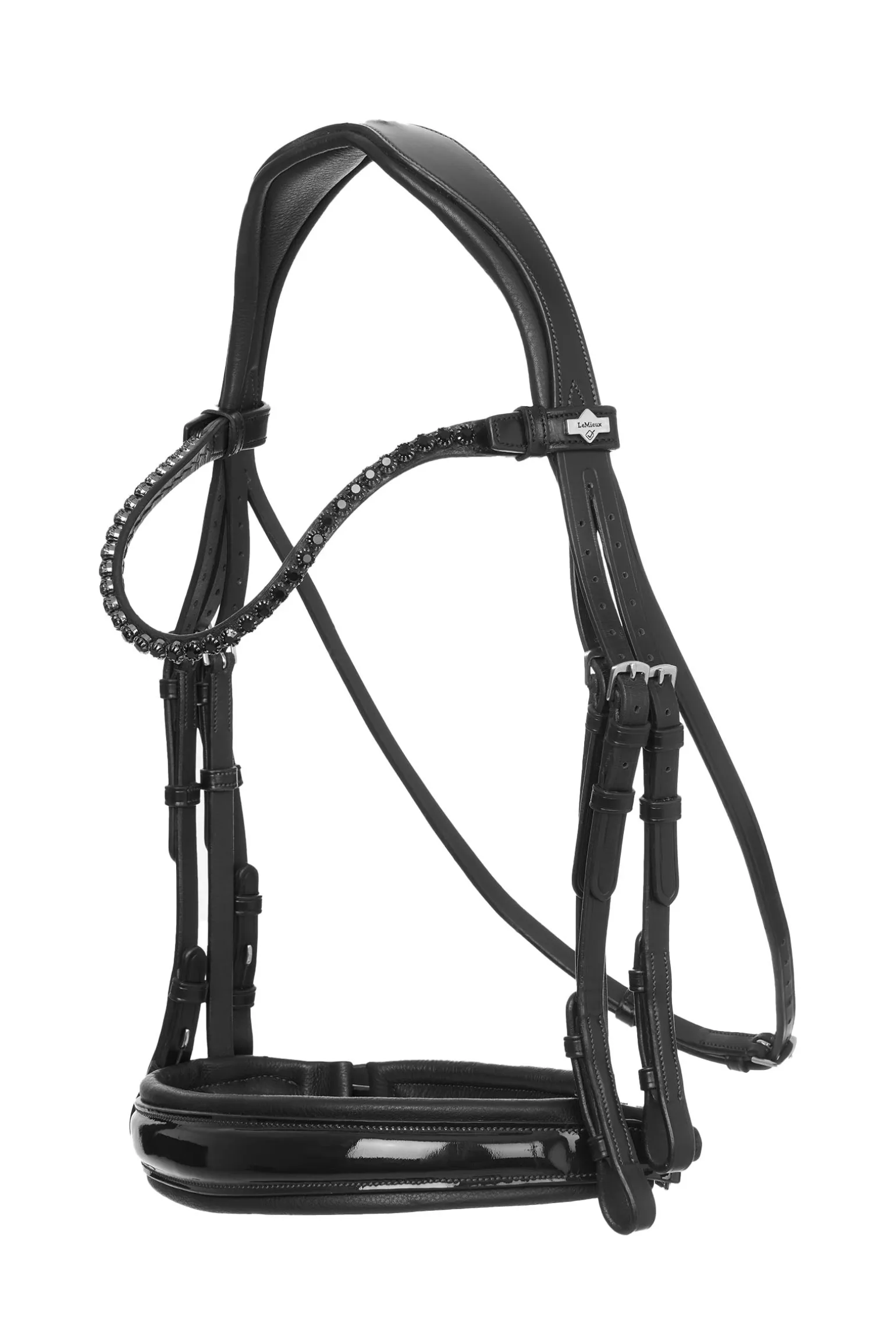 Gefertigt aus hochwertigem, vorgeöltem italienischem Leder, überzeugt diese Kandare mit einem anatomisch geformten, gelgepolsterten Genickstück, das hinter den Ohren für optimale Freiheit sorgt. Das abnehmbare, geschwungene Stirnband mit Kristallen und das gelgepolsterte Reithalfter aus Lackleder verleihen der Trense den unverkennbaren LeMieux-Stil, während der unauffällige Kehlriemen für eine klare Linienführung sorgt. Ein weich gepolsterter Kinnschutz mit Gelauflage rundet den Komfort dieser Premium-Kandare ab.