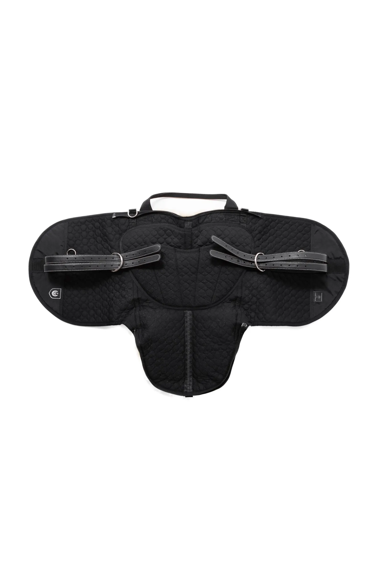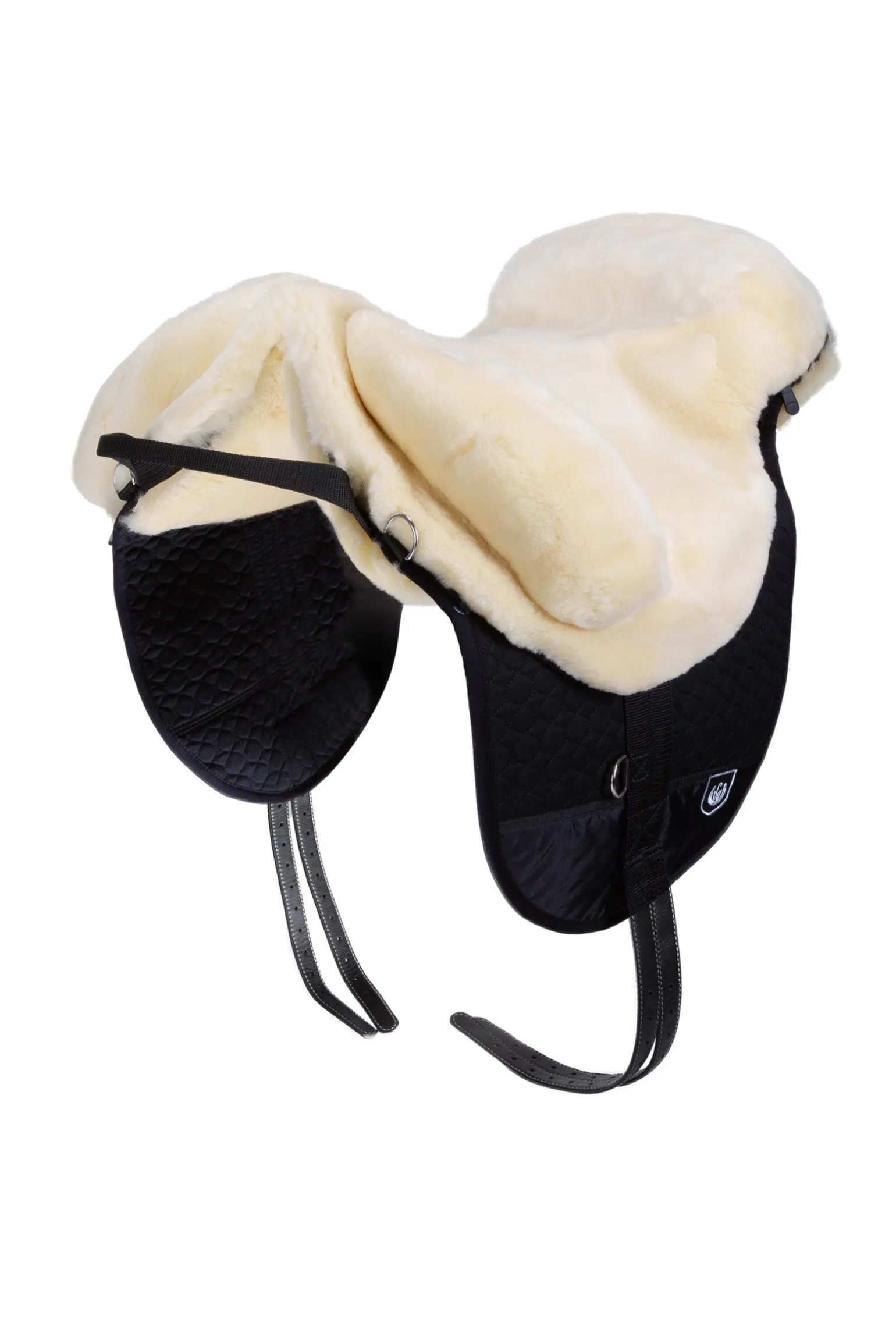 Die Sitzfläche dieses Sattels ist komplett aus Lammfell mit einer Wollhöhe von ca. 30mm gefertigt, die Unterseite nur im Rückenbereich. Seitliche Fellpauschen bieten zusätzlichen Halt. Ein spezielles Kopfeisen, separat erhältlich, kann in die Tasche unter dem abnehmbaren Lammfell-Bezug eingelegt werden. Die am Kopfeisen befestigten Sturzfedern erlauben das Aufsteigen über Steigbügel. Herausnehmbare Polster links und rechts vom Wirbelkanal erhöhen den Sitzkomfort und schonen den Pferderücken. Shetland-Größen werden unter Artikelnummer 304750 verkauft.