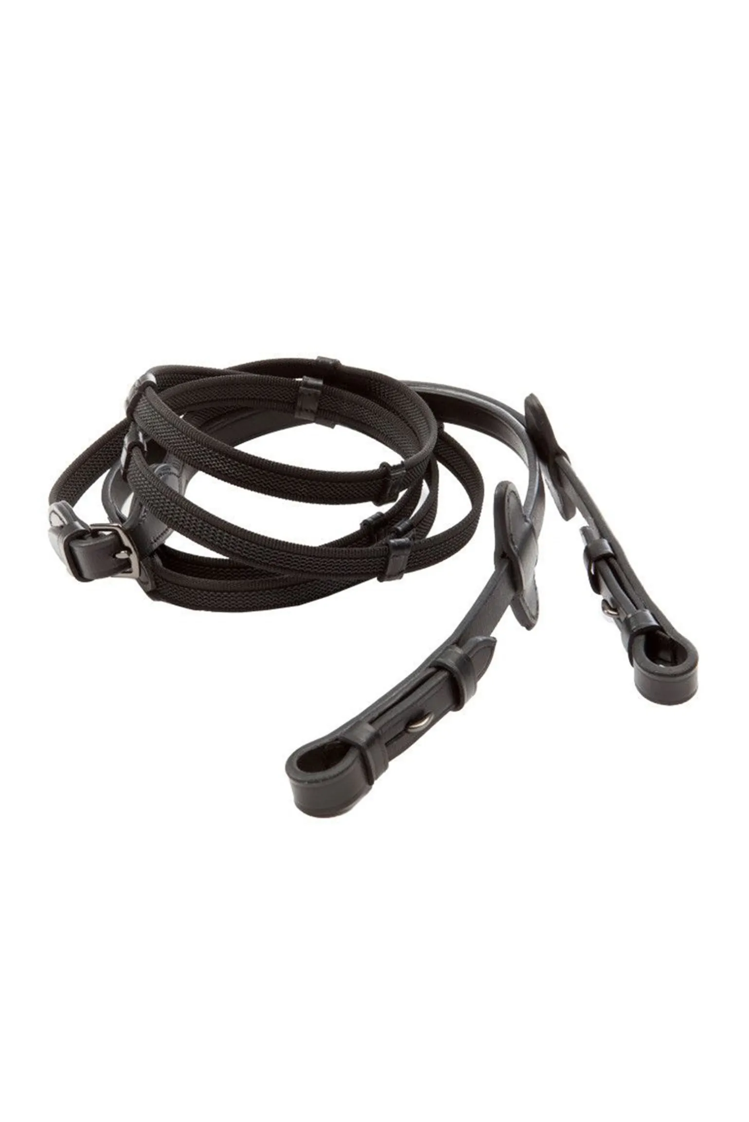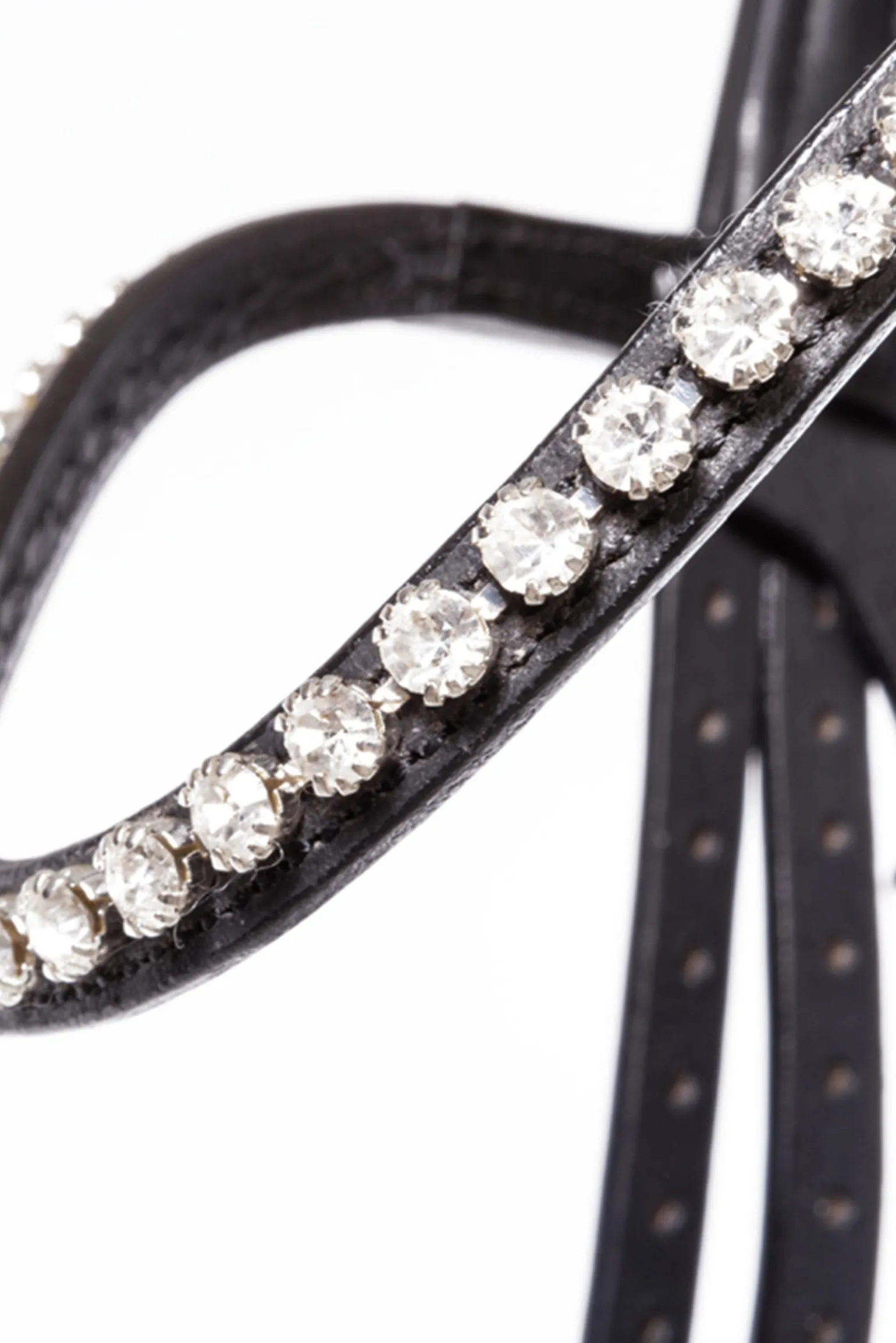 Die mexikanische Trense „Lucia“ besteht aus tollem Leder und schmiegt sich angenehm an den Pferdekopf an. Der Nasenriemen ist bombiert und seitlich geschwungen, ähnlich dem Kavalkade Modell „Ivy“. Das Genickstück ist auf beiden Seiten verstellbar, deutlich anatomisch ausgeschnitten und weich gepolstert. Das Nasenpolster ist austauschbar und besteht jeweils aus einem echten medizinischen Lammfell und aus einem Lederpolster. Der Kehlriemen ist angeschrägt, das Stirnband gebogen, schmall und besitzt weiße Strasssteine. Ein besonderer Hingucker sind die Lackeinsätze am Nasenriemen bei dem Trensenmodell schwarz-lack. Zu dem Trensenzaum sind schmale gummierte Zügel mit Stegen inklusive.