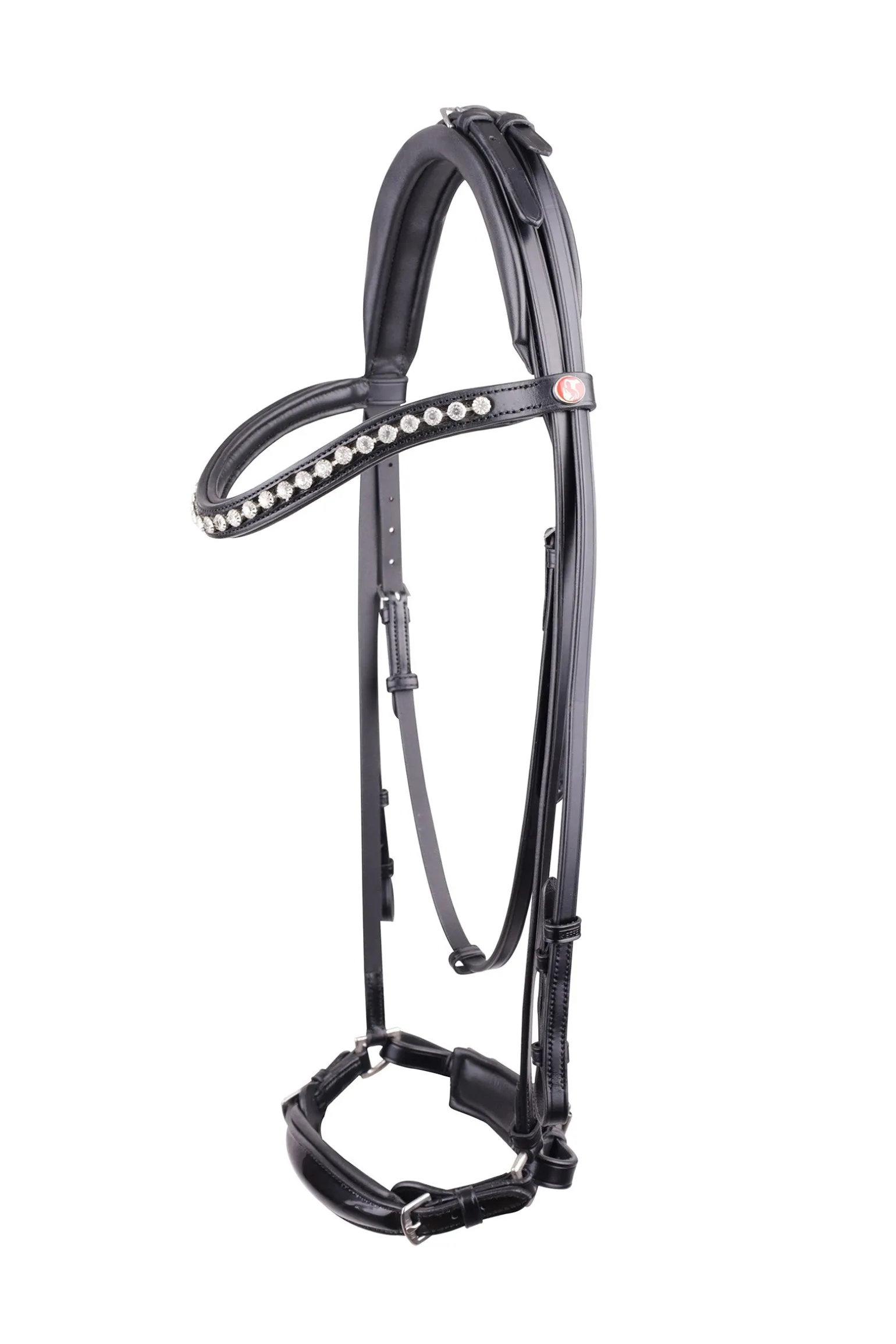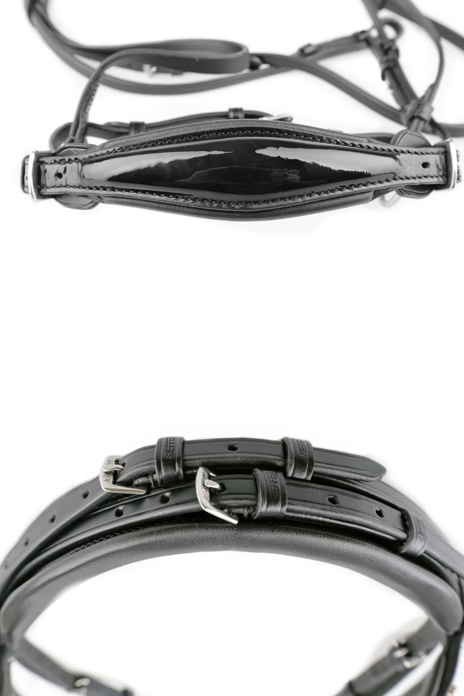 Ein perfekt anpassbarer Hingucker: Trensenzaum Melody mit verstellbarem Reithalfter. Dieser Trensenzaum wird im Genick verschnallt und ist mit einem superweich gepolsterten Kopfstück ausgestattet. Das edle, konisch zulaufende hannoveranische Lack-Reithalfter ist dank der beiden seitlichen unterfütterten Schnallen in der Weite verstellbar und bietet individuelle Einstellungsmöglichkeiten.