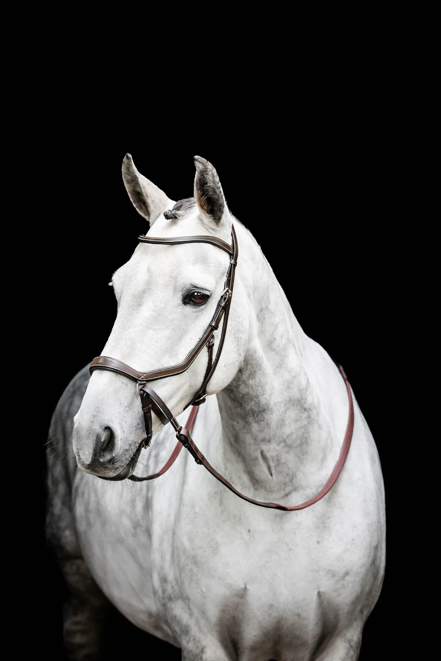 Includes durable, removable leather cross over strap attached to the D-rings on the headpiece offering a sleek appearance and avoiding unnecessary pressure on the sensitive poll area.
