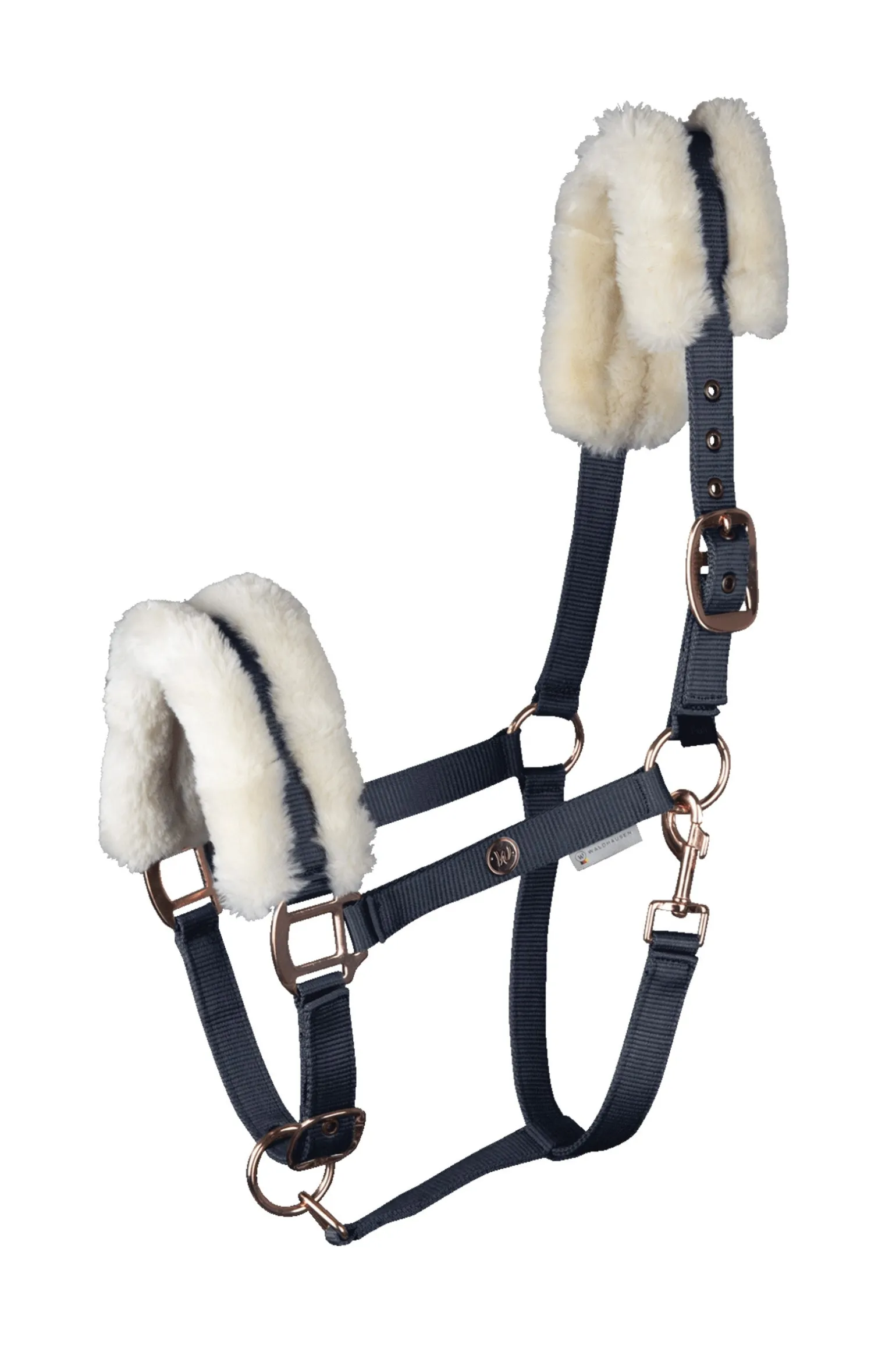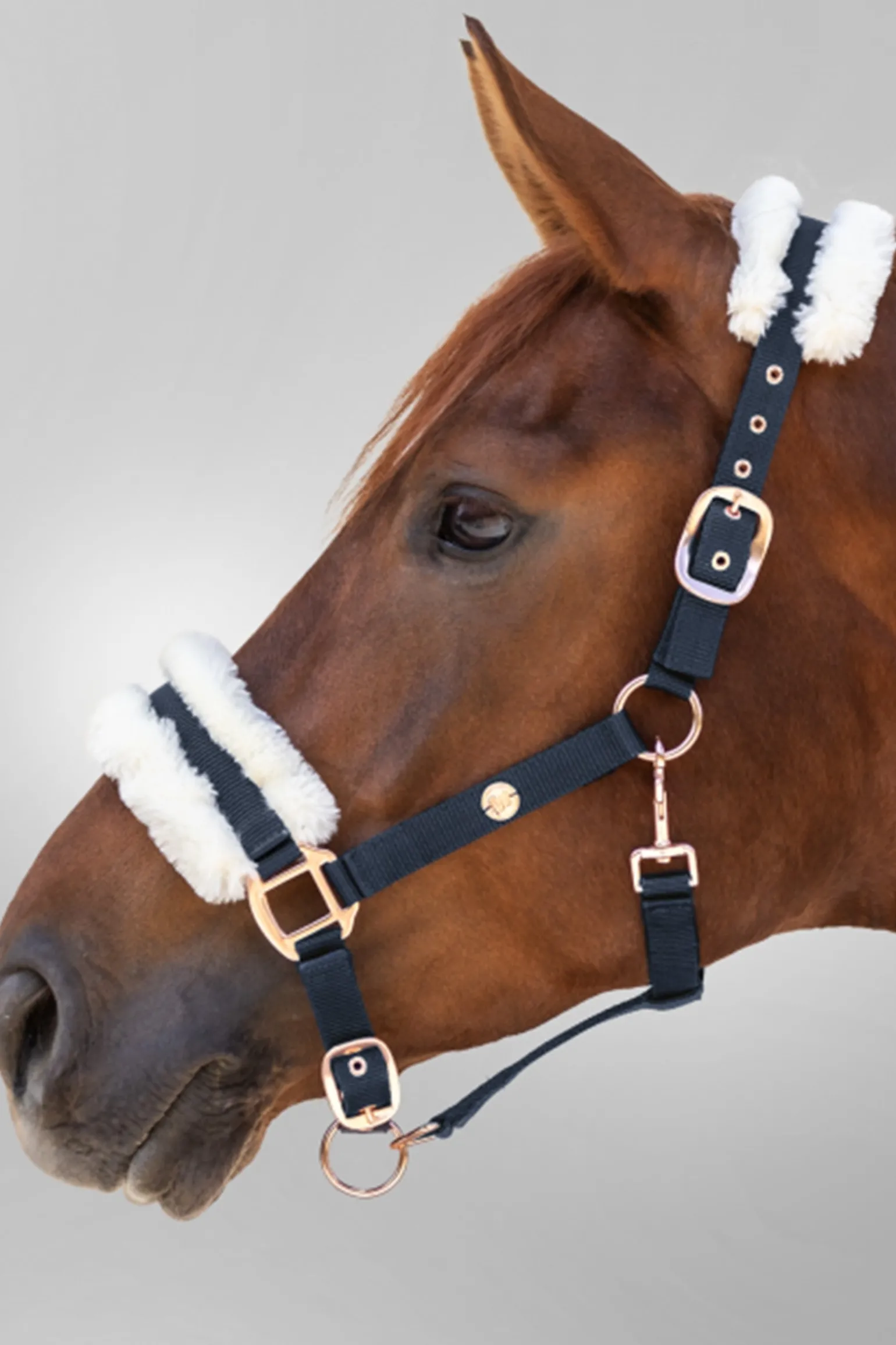 Elegantes, hochwertige Halfter mit roségoldenen oder goldenen Beschlägen und einem kleinem Metallplättchen. Das Genickstück sowie der Nasenriemen sind mit weichem SynthetikFell gepolstert. Passend zu unserer Modern Rosé Kollektion