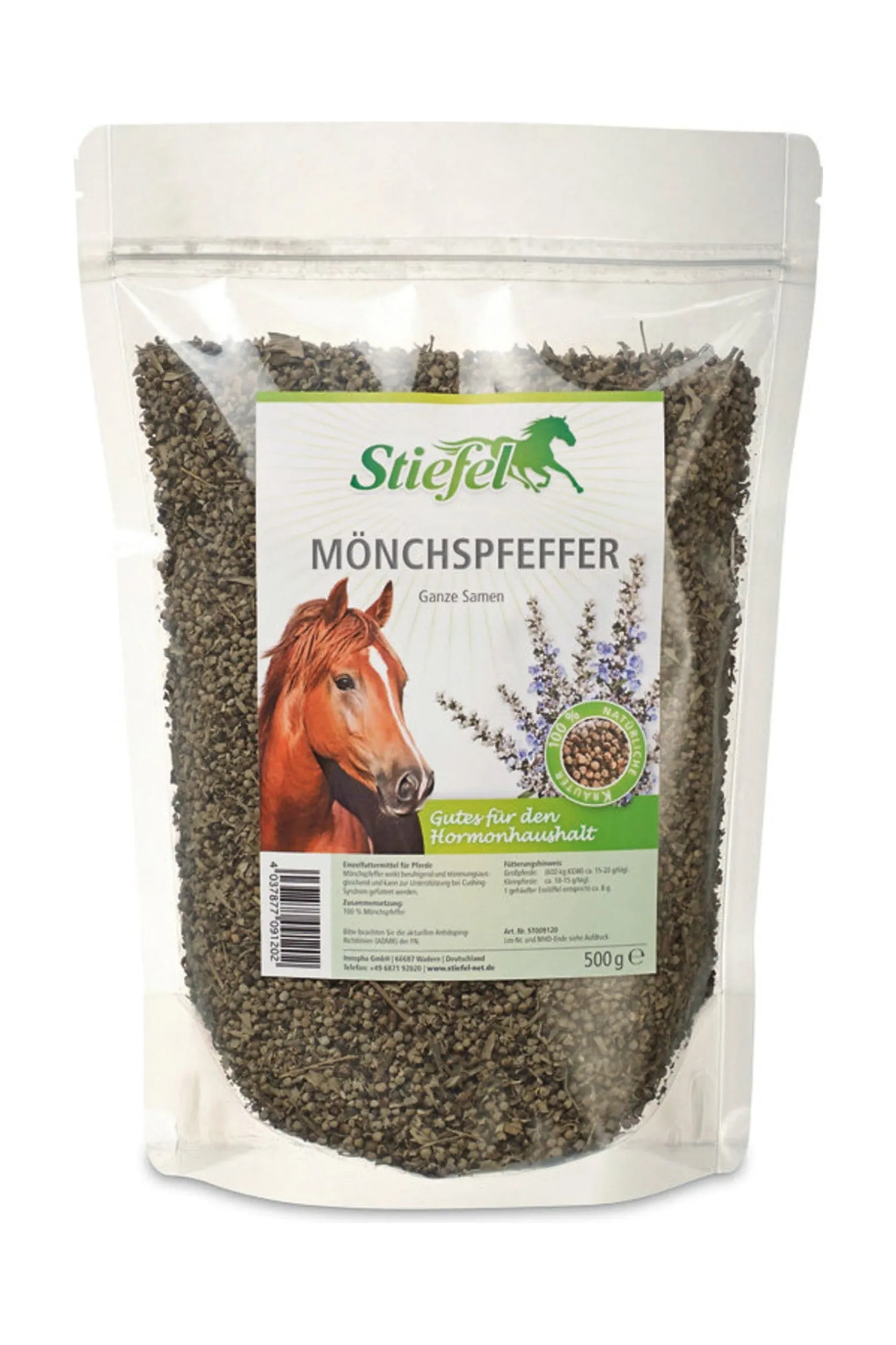 Stiefel Mönchspfeffer kann zur Unterstützung eines ausgeglichenen Hormonhaushaltes eingesetzt werden. Stiefel Mönchspfeffer kann die Fruchtbarkeit positiv beeinflussen. Fütterungshinweis: Großpferde (600 kg KGW) 15 – 20 g / tägl., Kleinpferde 10 – 15 g / tägl. (1 geh. Esslöffel = ca. 8 g). Ganze Samen unter das Futter mischen. Hinweis: Mönchspfeffer nicht während der Trächtigkeit füttern, nach der Bedeckung absetzen!