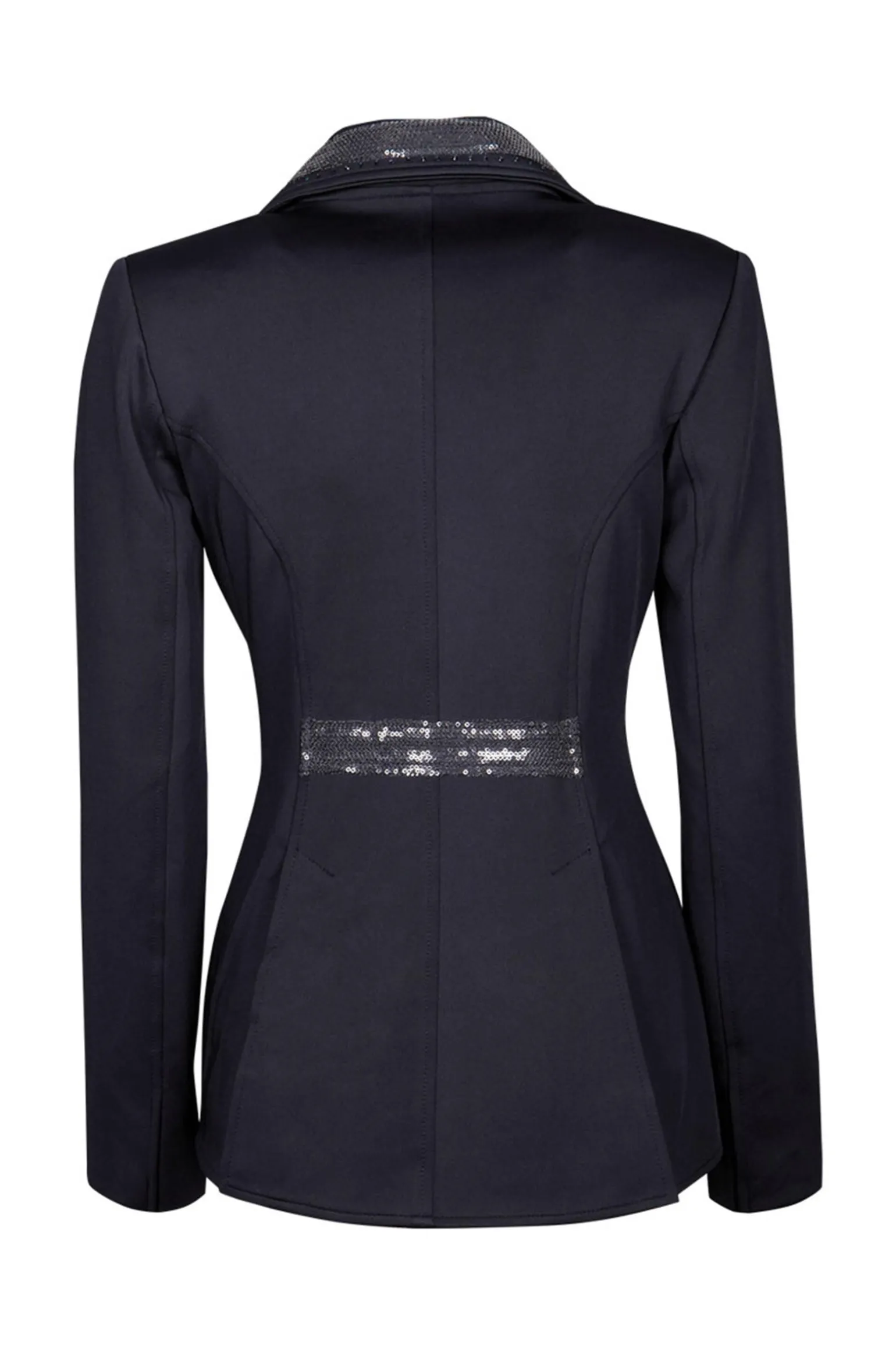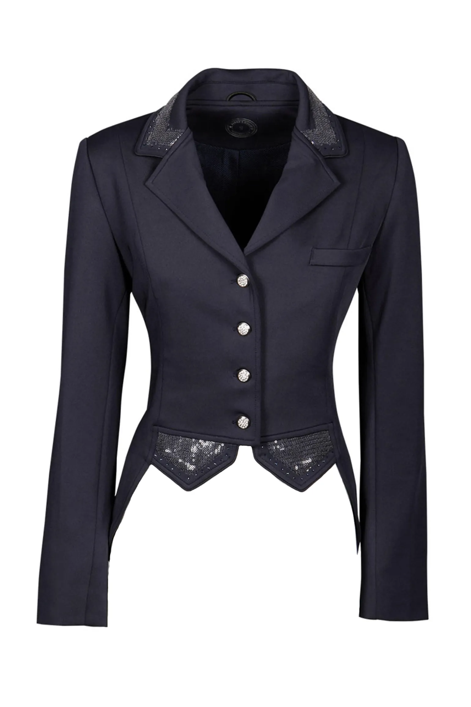 Edles Turnierjackett aus hochwertigem Stretch-Material. Die Jacke ist mit einem Kristallknopf und darunter liegendem Reißverschluss für perfekte Passform ausgestattet, am Kragen und den Gehschlitzen sind farblich passende Pailletten/Kristalle und eine Paspel angebracht. Mit Zierknöpfen.