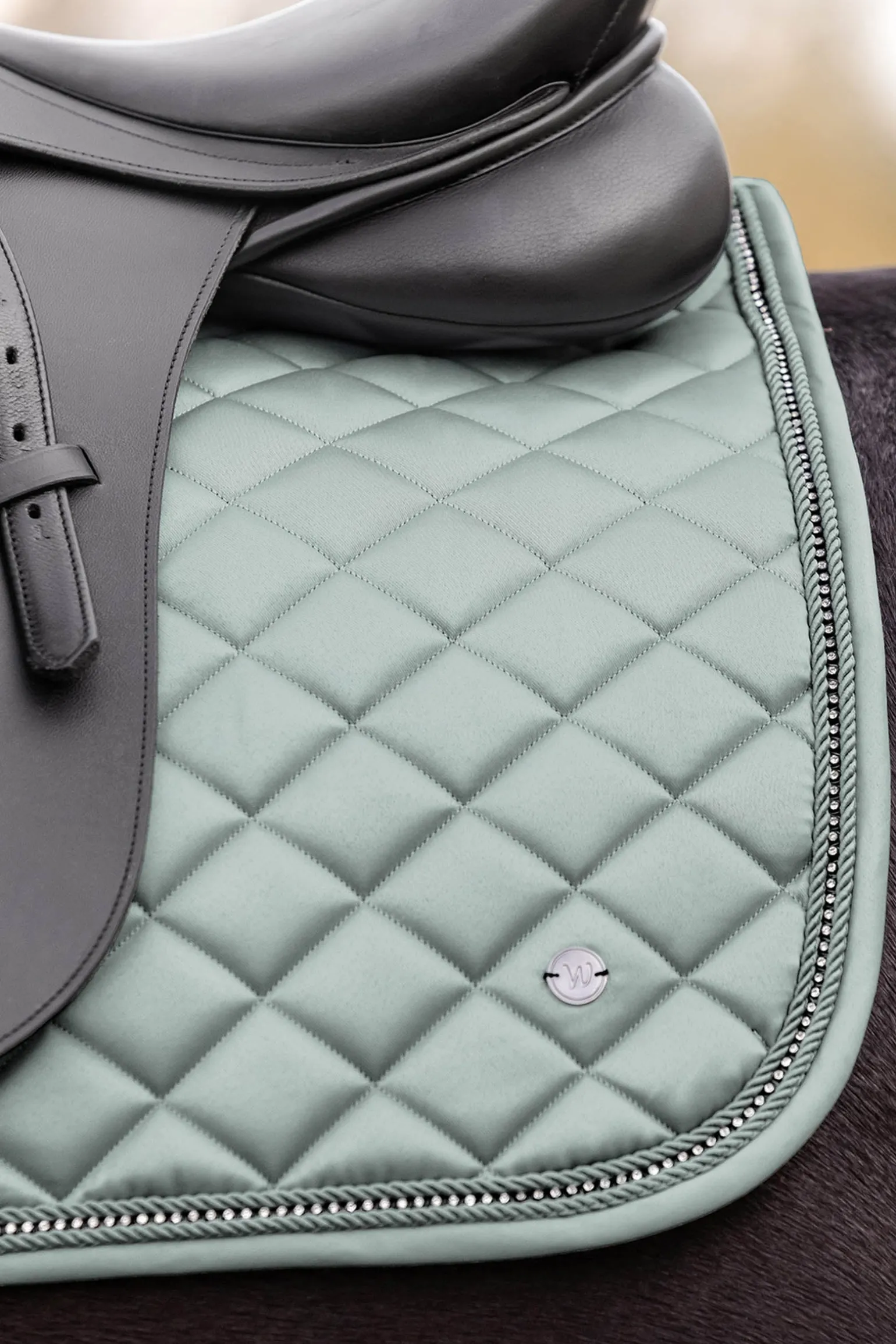 Elegante, hochwertige Schabracke aus glänzendem Material Besonderes Detail: schimmerndes Strassband zwischen zwei Zierkordeln Logo in Form einer silberfarbenen Metallplakette Passend zur Nepal-Kollektion