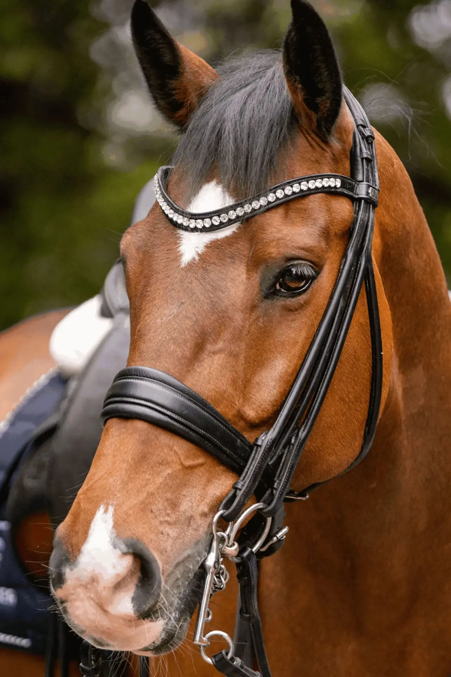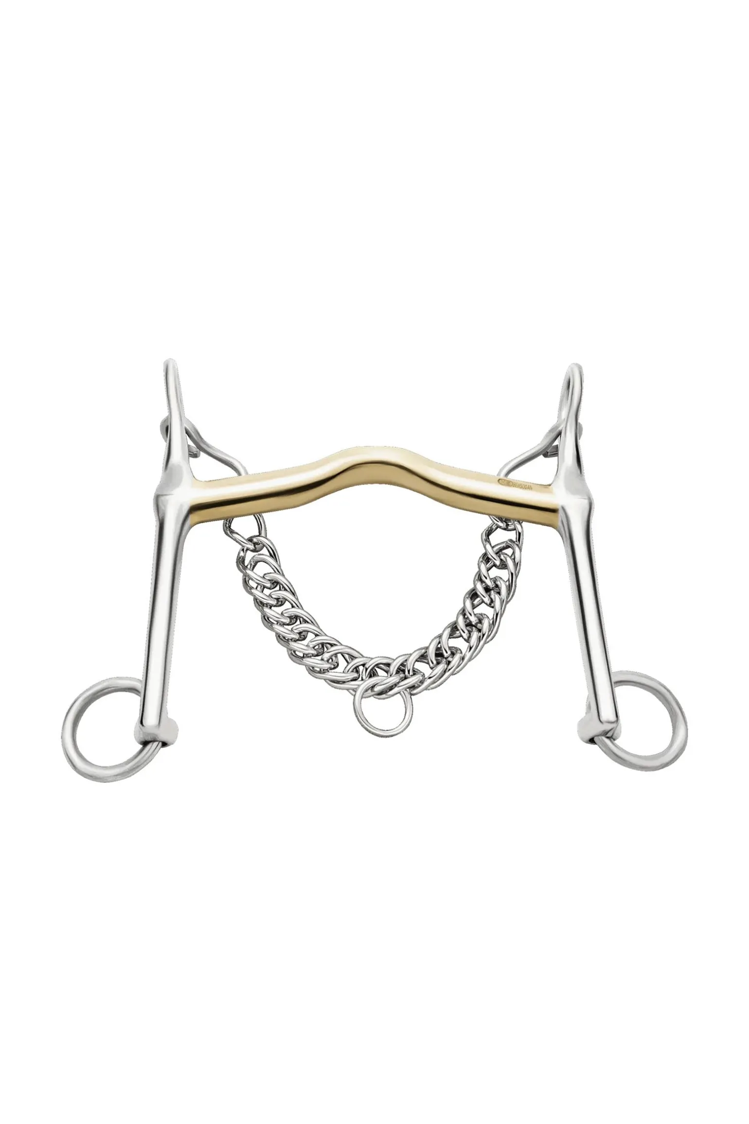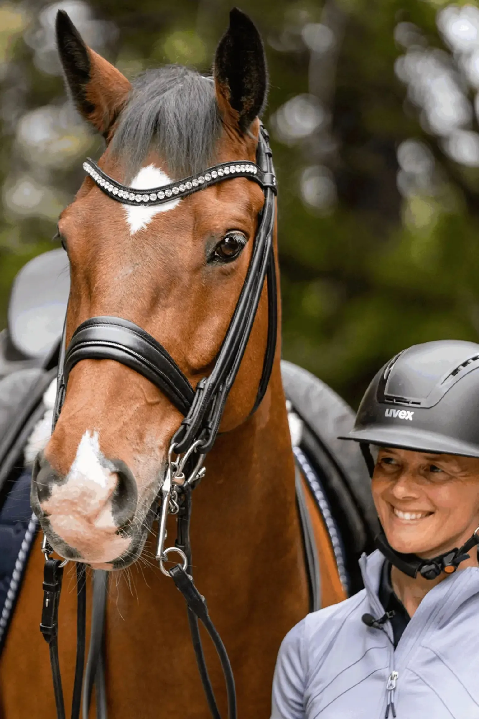 Bereit für den neuesten Standard pferdefreundlicher Gebisse? Die innovativen novocontact-Gebisse haben eine einzigartige Form und liegen mit einer vergrößerten Kontaktfläche auf der Zunge. Dies ermöglicht eine besonders weiche Druckverteilung im Pferdemaul bei optimaler Ausnutzung des verfügbaren Raumes. Aufgrund der modernen novocontact-Geometrie wird dieses Weymouth-Gebiss besonders für Pferde empfohlen, die dazu neigen, ihre Zunge hochzuziehen. In unseren Praxistests reagierten diese Pferde ebenfalls positiv auf das Gebiss. Die langen Schenkel führen dazu, dass die Signale im Vergleich zu kurzen Schenkeln verzögert im Maul des Pferdes ankommen, während sich im Genick ein stärkerer Druck aufbaut. Eine sensible Reiterhand ist hier unerlässlich. Das Pferdemaul ist tendenziell etwas schmaler an der Stelle, an der das Weymouth eingesetzt wird. Wir empfehlen daher, ein Weymouth zu wählen, das 0,5 bis 1 cm kleiner ist als die Unterlegtrense. Es ist wichtig, dass die Seiten des Weymouths nah an den Maulwinkeln liegen. Wenn zu viel Platz zwischen den Maulwinkeln und dem Seitenteil ist, kann das Weymouth klemmen oder kippen. Die Kinnkette sollte so befestigt werden, dass ein Winkel von etwa 30 bis 45 Grad zwischen dem Maul des Pferdes und dem unteren Schenkel möglich ist.