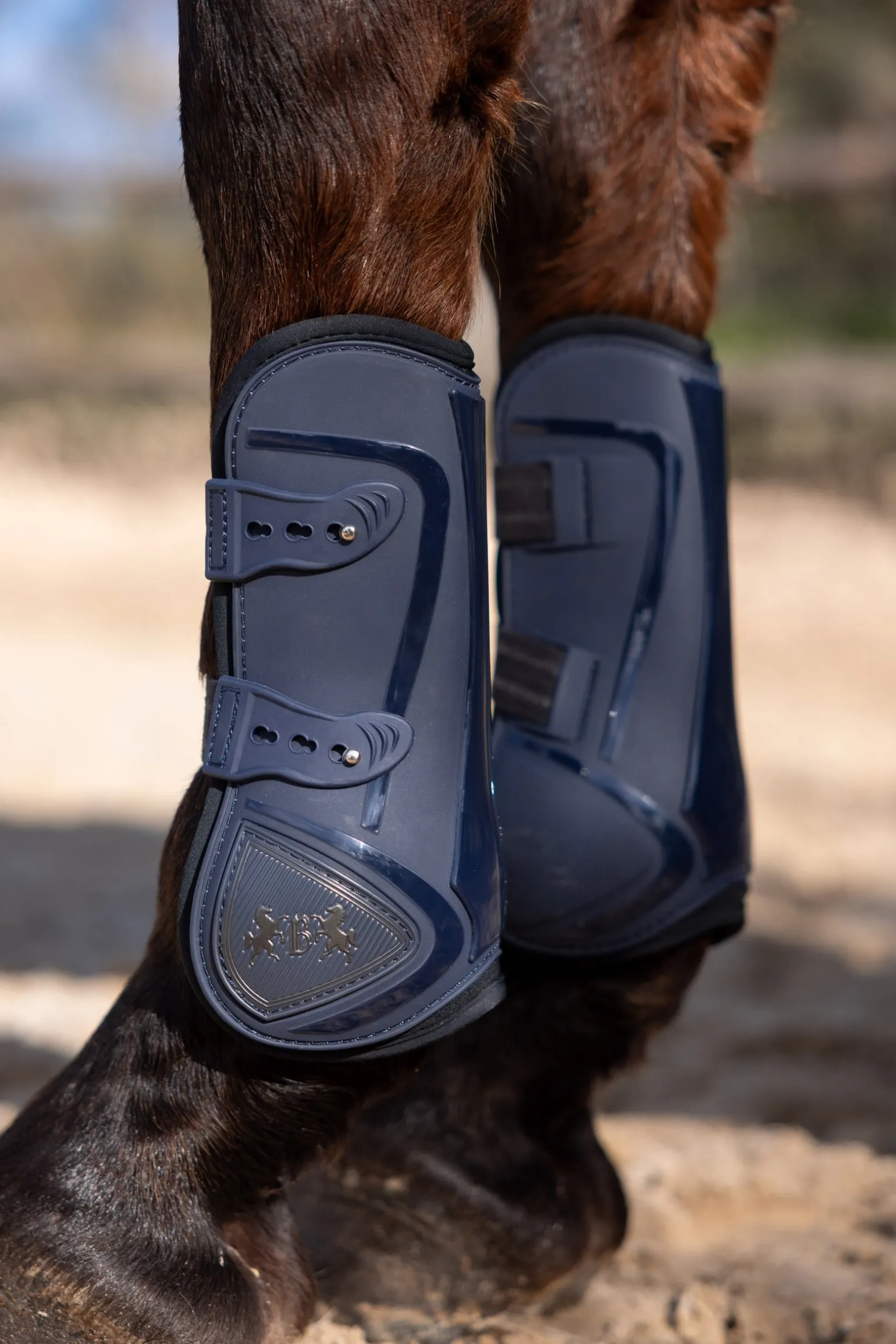 Durable tendon boots with secure pin closure and padding.