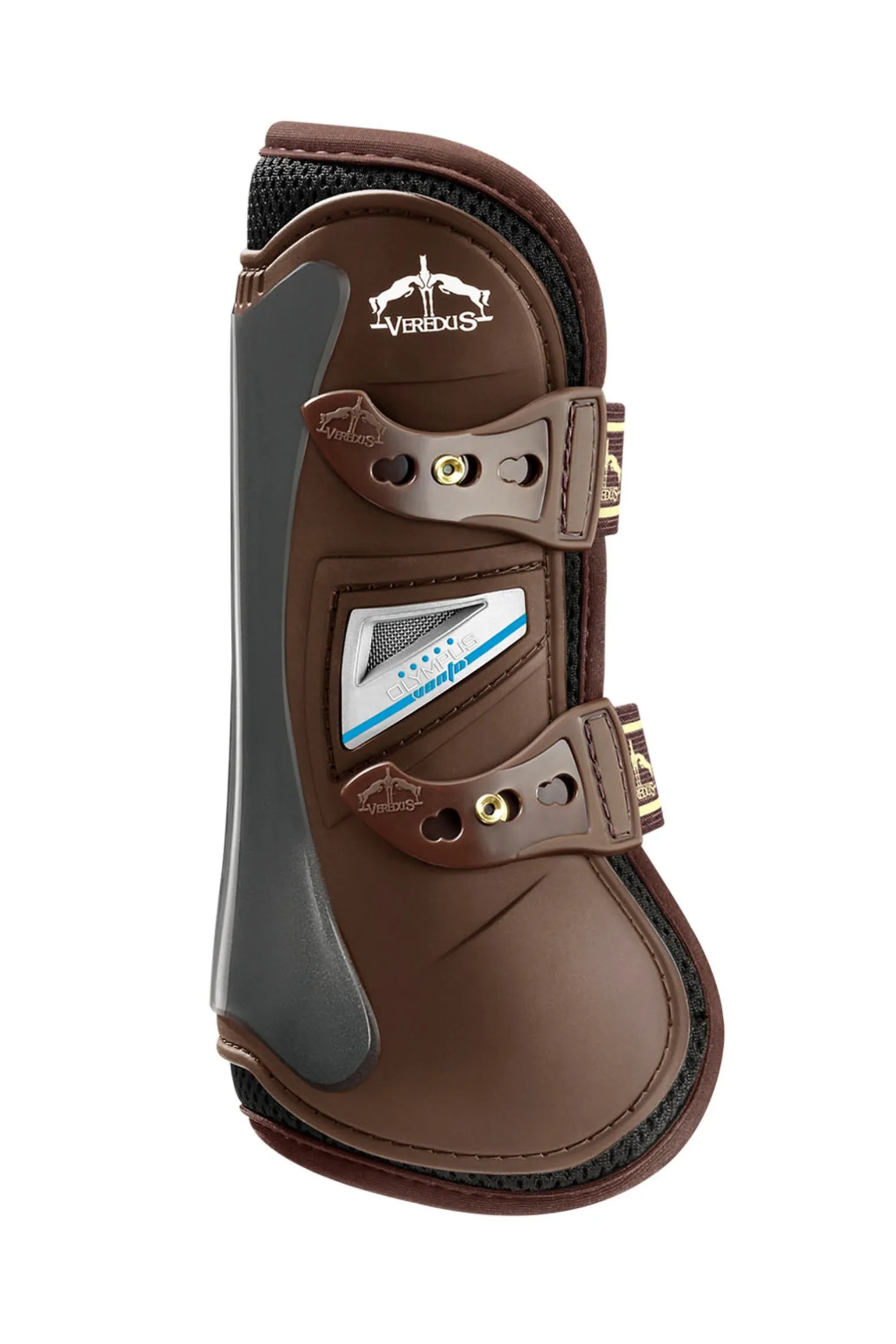 Die vom Pferdebein abgegebene Wärme durchdringt die Schicht aus mikroperforiertem Neopren und verteilt sich dann in den Kanälen des 3D-Mesh-Gewebes. Durch die Lüftungsöffnung tritt frische Luft ein und leitet die Wärme nach oben zum Auslassgitter. Die Belüftung erfolgt somit sowohl horizontal als auch vertikal. Der Schutz der vorderen Sehnen wird durch einen stoßdämpfenden Film aus EVA-Schaum gewährleistet.