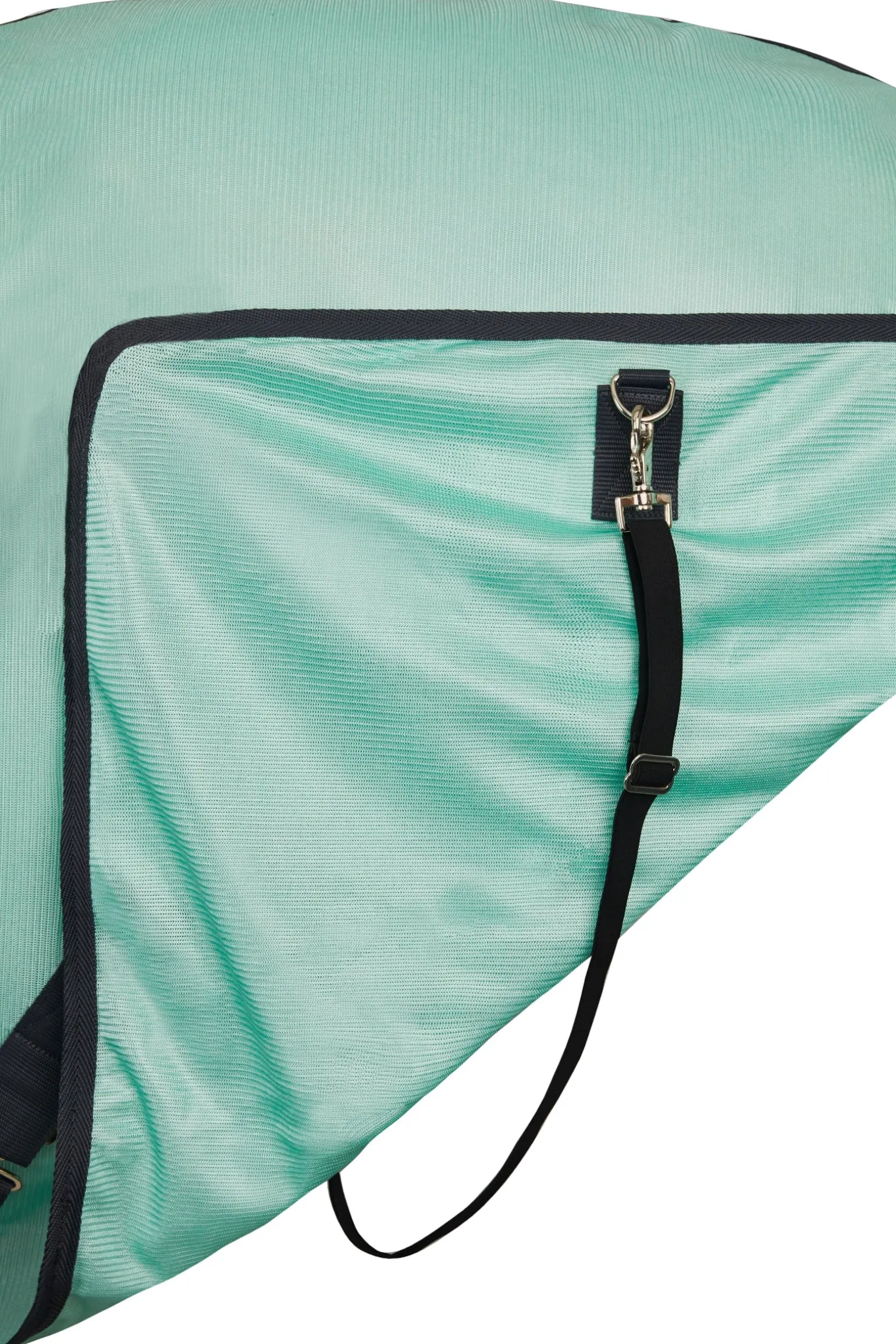 Die Paso Fino Fliegendecke mit Halsteil ist die perfekte Wahl, wenn dein Pferd besonders sensibel auf Fliegen reagiert. Das UV-schützende Netzgewebe ist atmungsaktiv und die helle Farbe verhindert, dass dein Pferd überhitzt. Das fixierte Halsteil reicht bis zu den Ohren und endet in einer „Kapuze“, um den Sitz des Halsteils zu sichern. Gehfalten erhöhen die Bewegungsfreiheit beim Laufen und das glatte Futter an Hals und Schultern verhindert Scheuerstellen. Der große Schweiflatz wird mit einem Schweifriemen gesichert und bietet maximale Abdeckung, genau wie der große Bauchlatz, der mit verstellbaren geraden Gurten und Klettverschluss geschlossen wird. Front- und Halsverschlüsse sind Zugverschlüsse mit starkem Klettverschluss. Das Logo-Tape entlang der Rückenlinie, der Frontverschlüsse und der Bauchgurte vervollständigt das Design dieser absolut durchdachten Fliegendecke.