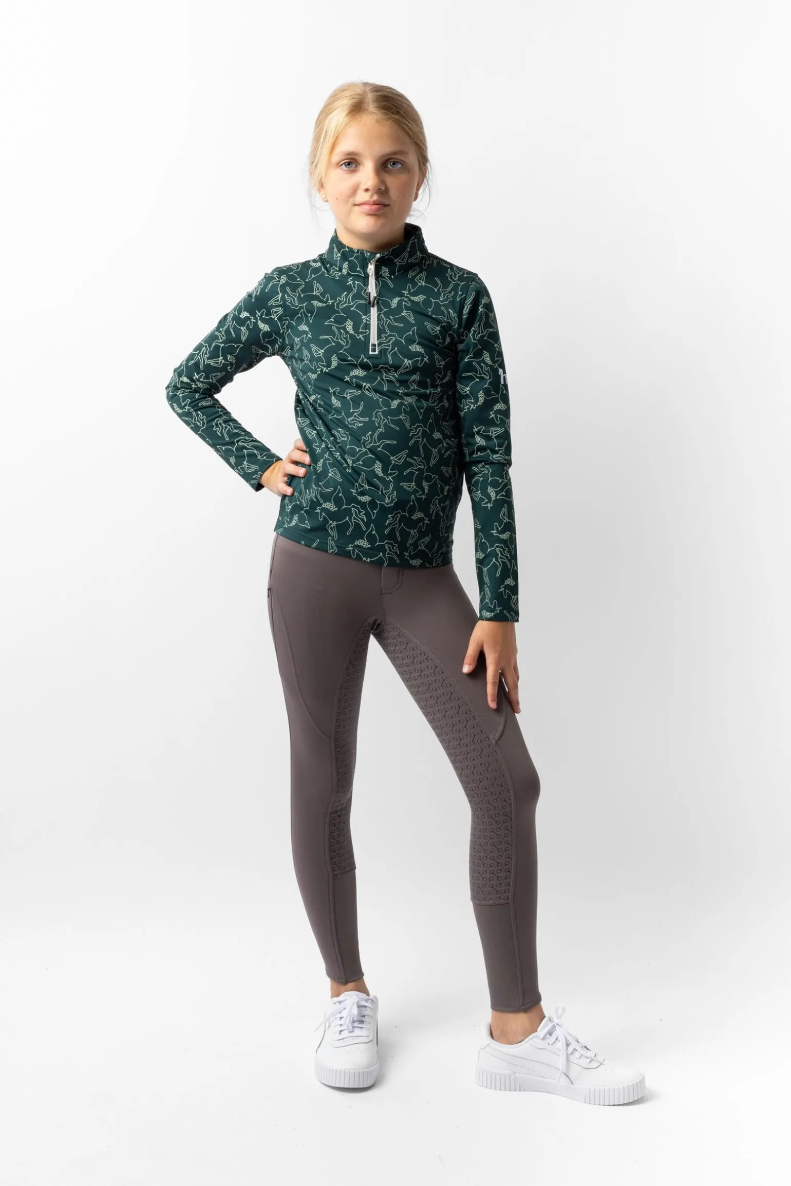 The Horze Pegasus Kids’ Training Shirt is a fun and practical choice for active young riders. Made from breathable, brushed fabric, it provides warmth and comfort while remaining lightweight. The quarter-zip neck allows for easy ventilation, and the stretch fabric ensures freedom of movement. A bold Pegasus print adds a touch of fun to every ride. Easy to care for and durable, this shirt is perfect for training or casual wear.