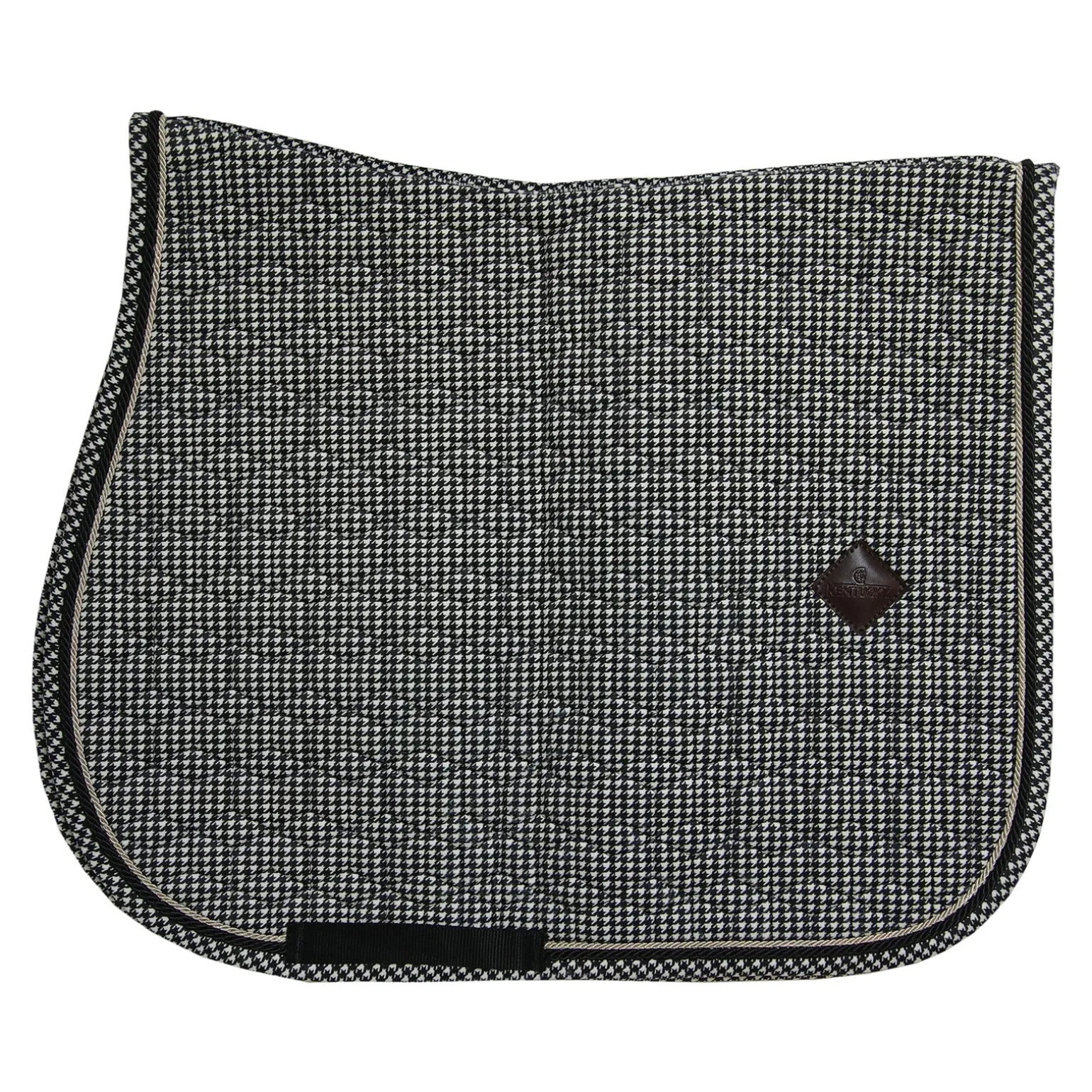 Diese Schabracke ist aus Mikrofasergewebe mit einem Pied-de-Poule-Muster hergestellt – einem Modeklassiker, der Rhythmus und Eleganz verleiht. Die Schabracke hat ein gestepptes Sternmuster und eine doppelte Spiralbordüre in ähnlichen Tönen.