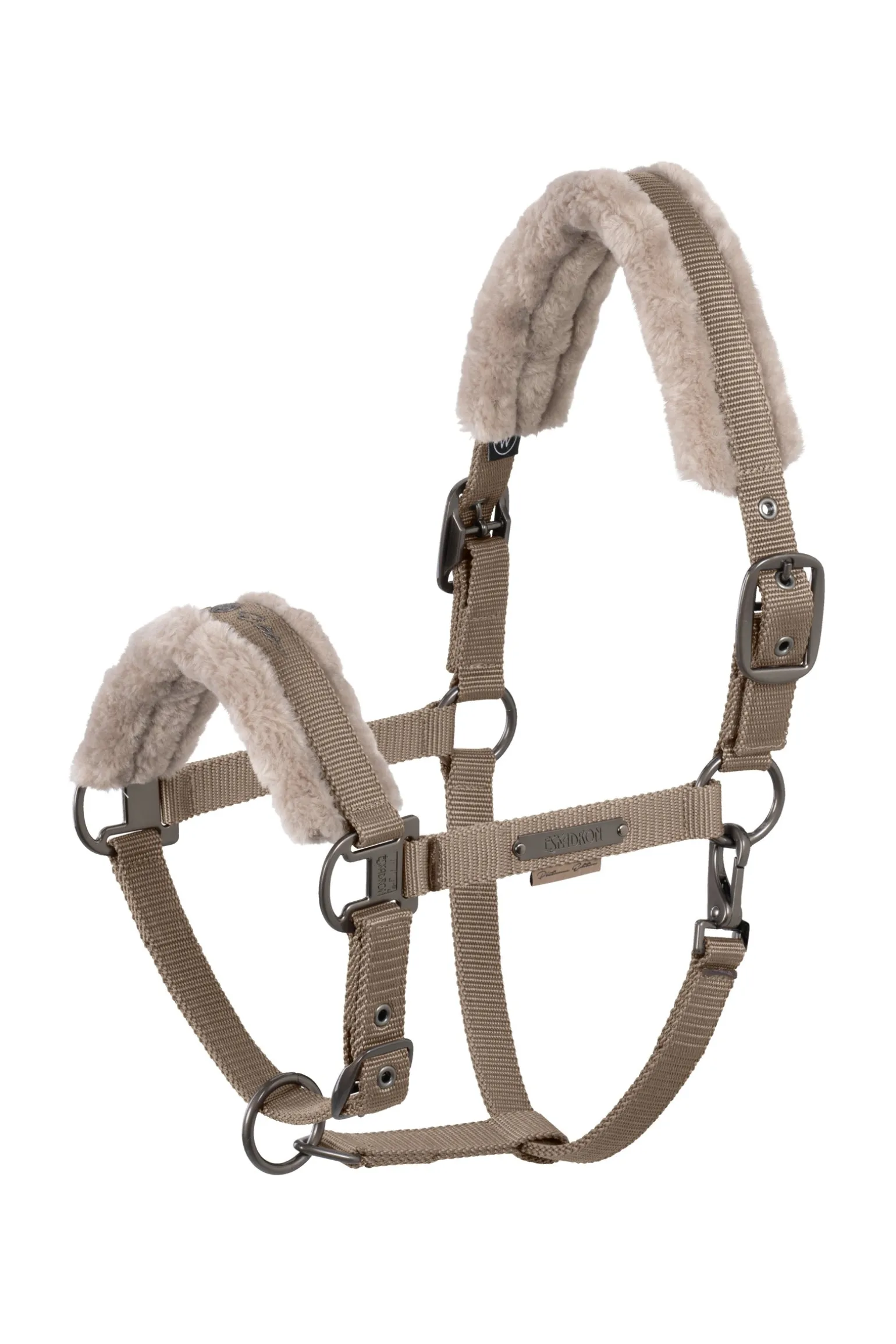 Dieses hochwertige Halfter besteht aus reißfestem Gurtband und ist komplett mit weichem Kunstfell gepolstert – für maximalen Komfort und einen edlen Look. Das pflegeleichte Polster ist an Nasen- und Genickstück abnehmbar und bietet so zusätzliche Flexibilität. Dornschnallen auf beiden Seiten ermöglichen eine optimale Anpassung, ergänzt durch eine weitere Verstellmöglichkeit im Kinnbereich. Hochwertige Metallbeschläge in Taupe, ein edler Platinum-Schriftzug auf dem Nasenband und eine exklusive Eskadron-Metallplakette auf der linken Seite runden das Design ab.