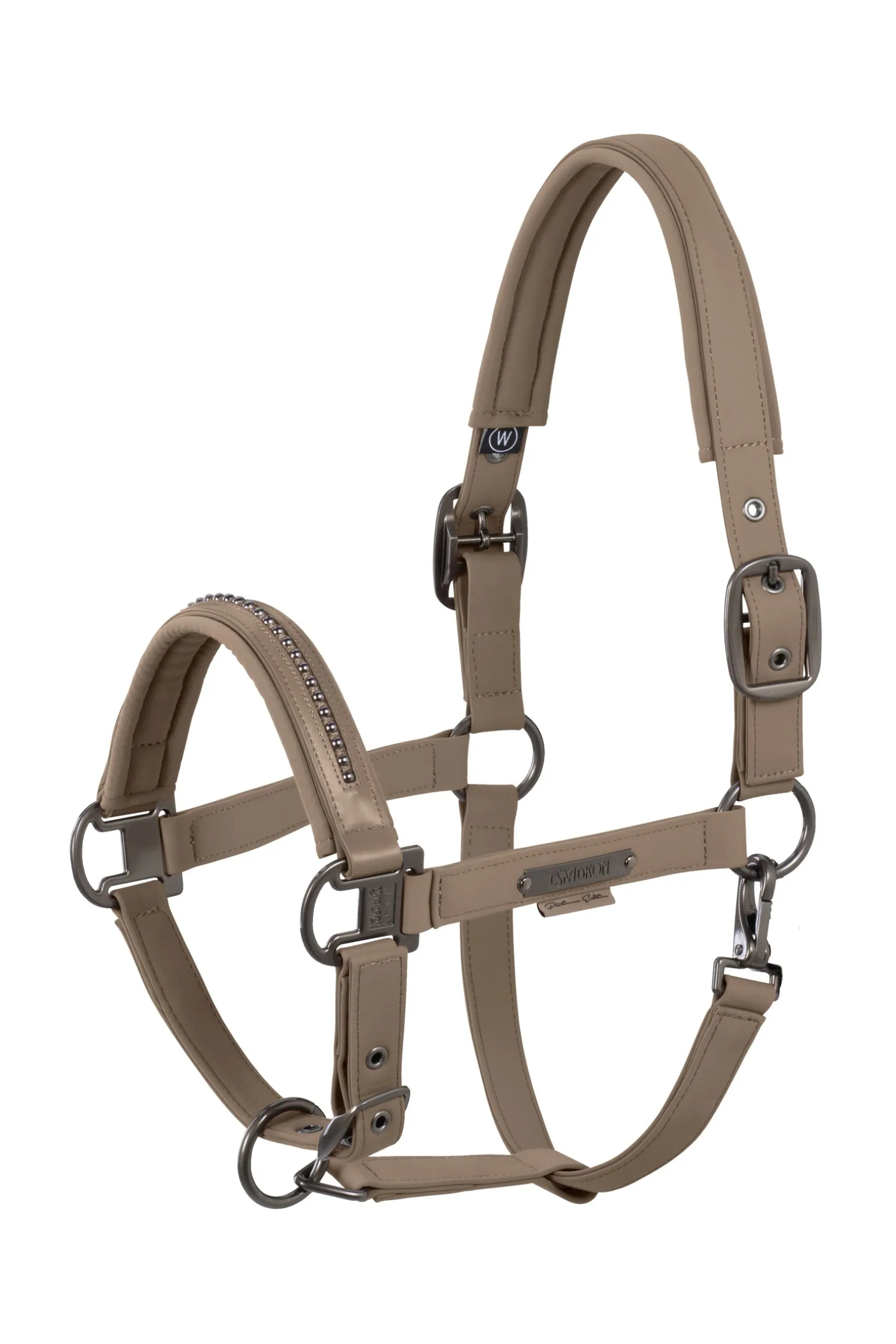 Dieses Halfter verfügt über eine robuste Softshell-Oberfläche und ein reißfestes Gurtband innen für zusätzliche Haltbarkeit. Weiche Polsterung an der Nase und dem Stirnriemen sorgt für Komfort, während Pin-Schließen auf beiden Seiten eine optimale Anpassung ermöglichen. Eine zusätzliche Anpassungsmöglichkeit im Kinnbereich bietet mehr Flexibilität. Die hochwertigen taupefarbenen Metallbeschläge und die eingefügten Perlen am Nasenriemen verleihen Eleganz, und die Eskadron Metallplatte auf der linken Seite verstärkt das anspruchsvolle Design.