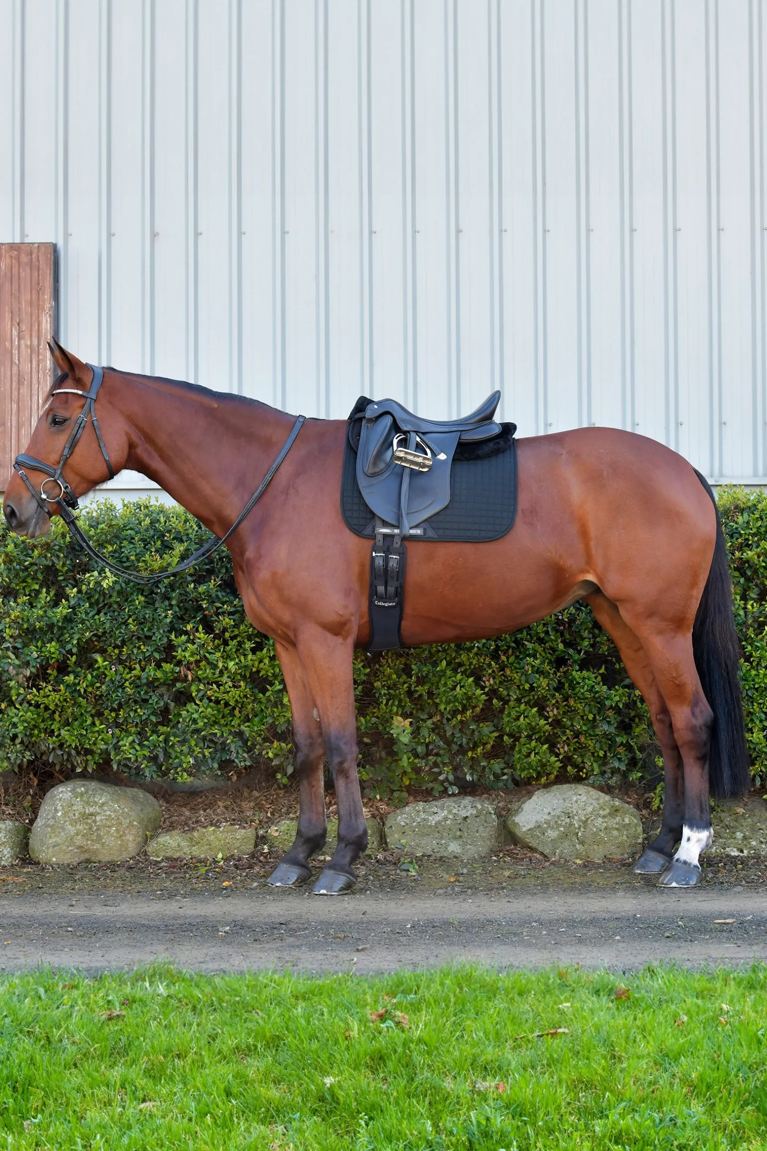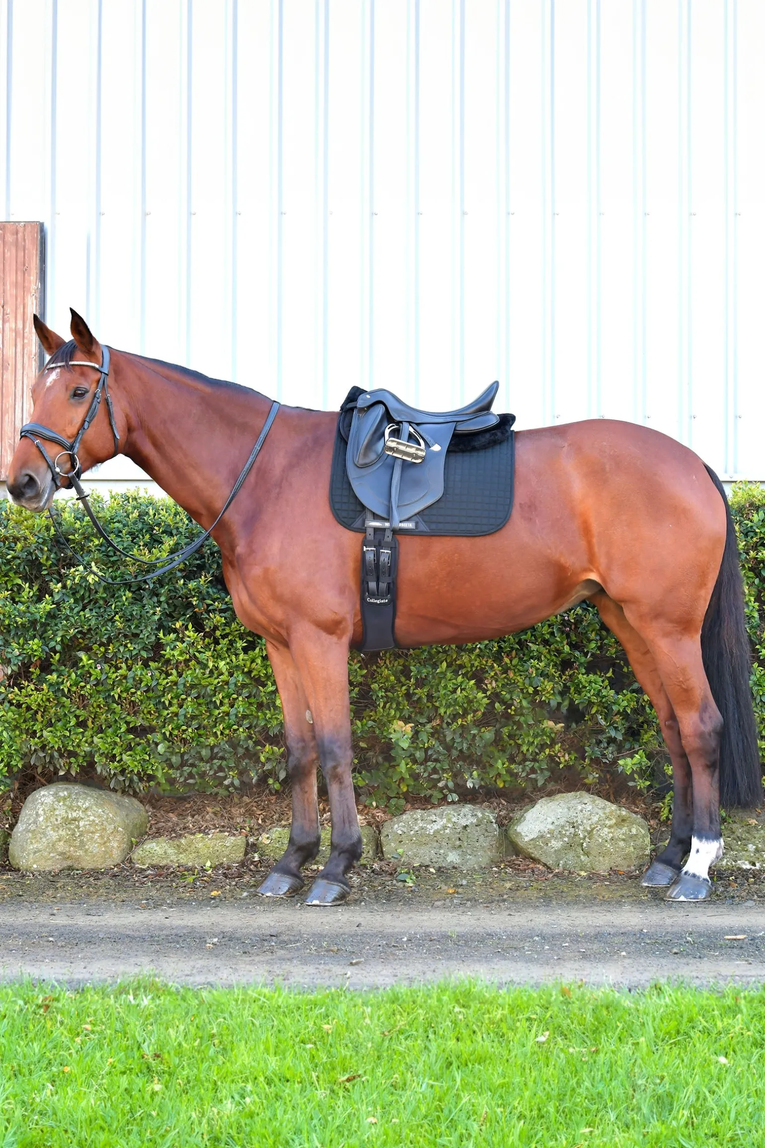 Dieses strapazierfähige polycotton Half Pad verfügt über ein superweiches, hochwertiges Kunstfell-Futter mit gerolltem Widerrist und Einfassung, das dafür sorgt, dass dein Pferd kühl, trocken und komfortabel bleibt. Es steigert den Komfort unter dem Sattel und ist ideal für Pferde mit empfindlicher Haut. Das atmungsaktive Mesh-Gewebe am Rückgrat sorgt für zusätzlichen Luftstrom, während die hohe Widerristform mehr Platz dort bietet, wo er benötigt wird. D-Ring-Laschen gewährleisten eine sicherere Passform für zusätzliche Stabilität.