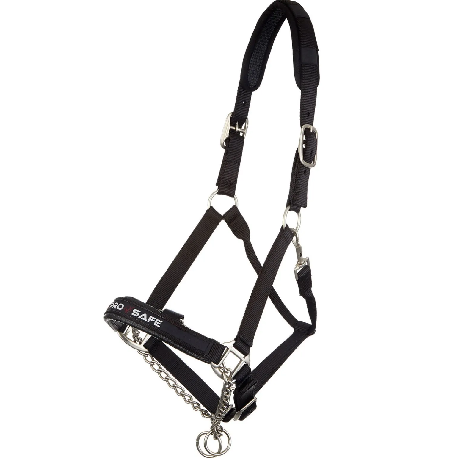 Designed for perfect control in hand. Ideal for lively horses and ponies, stallions & young stock.The Pro-Safe has a robust strong twin nylon solid metal chain & fittings. Triple ring design creates 3 options for varied level of control & severity whilst PVC rubber foam padded nose and poll allow for shock absorbing comfort at the same time. Adjustable in size at headpiece & throat lash for optimum fitting. Stay safe with Pro-Safe.