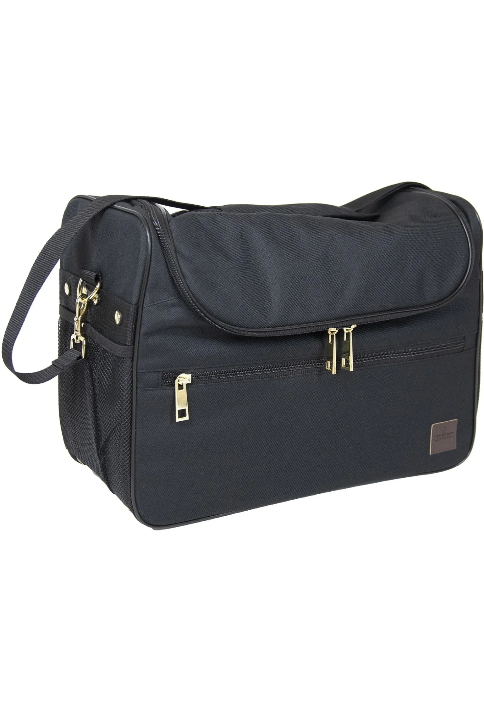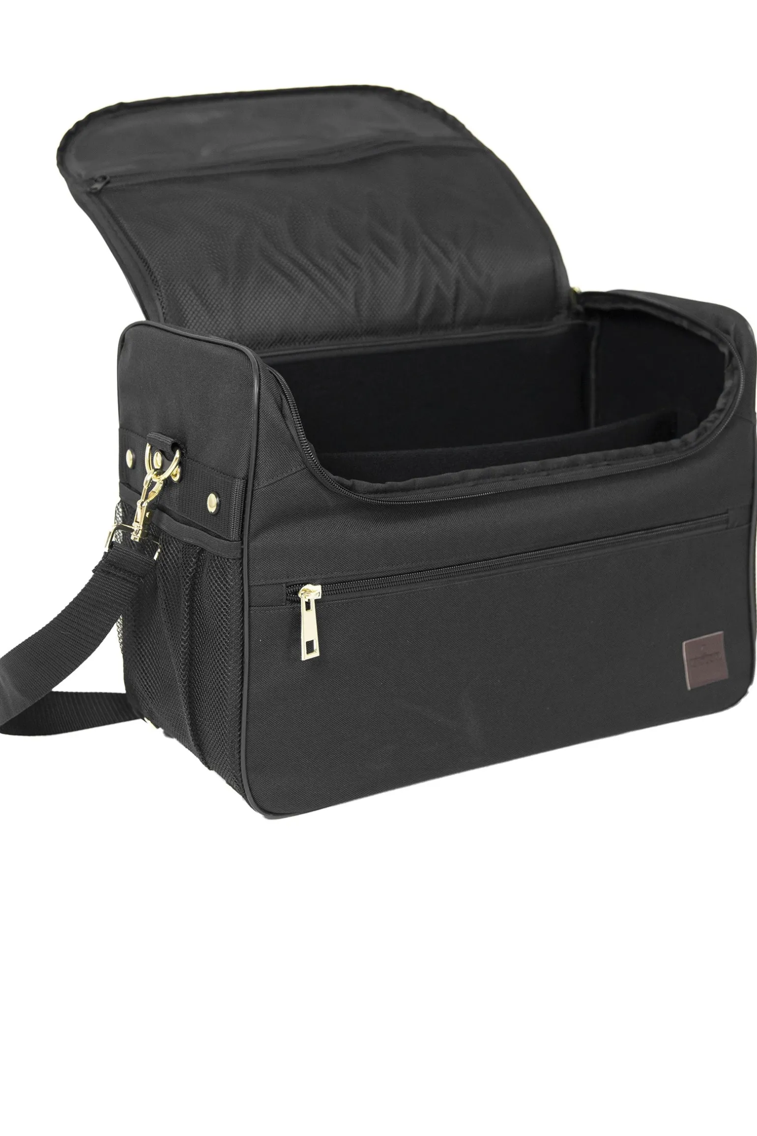 Das Innere ist dank starker Klettverschlüssen mit Laschen verstellbar. Daher kannst du die Tasche beliebig arrangieren. Im Hauptfach kannst du die Bürsten, Sprühflaschen und andere Pflegeutensilien aufbewahren. Auf der Innenseite der Klappe befindet sich ein separates Fach für kleinere Gegenstände. Auf der Vorderseite befindet sich ein großes Fach für Gegenstände wie Mähnengummis, Nadeln und Fäden. Beide Seiten haben eine dehnbare Netztasche. Die Putztasche wird durch einen starken Reißverschluss verschlossen und hat einen abnehmbaren Riemen mit Schulterpolster für einfachen und bequemen Transport. Die Tasche an den Seiten verstärkt, um sie stabiler zu machen und die Bürsten zu schützen. Die Maße der Putztasche betragen 42,5 cm x 32,5 cm x 20 cm (L x H x B)
