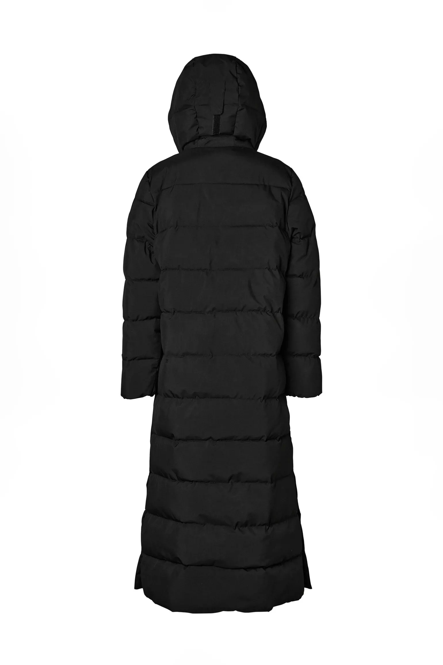 Langer, warmer Steppmantel mit hohen Seitenschlitzen, durchdacht gestaltet mit einer auffälligen silberfarbenen Innenfütterung der abnehmbaren Kapuze.