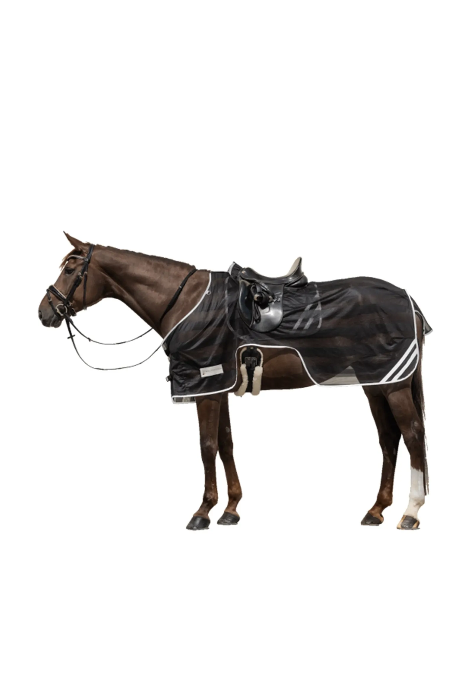 Leichte Ausreitdecke aus reflektierendem Gewebe und rundum reflektierendem Einfaß.Mit Sattelausschnitt und Schweifkordel.