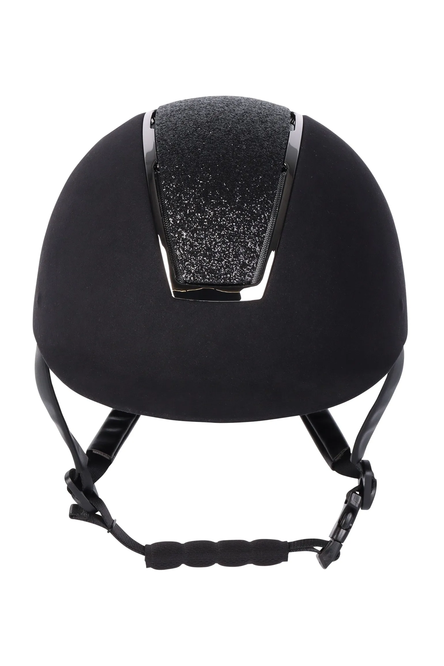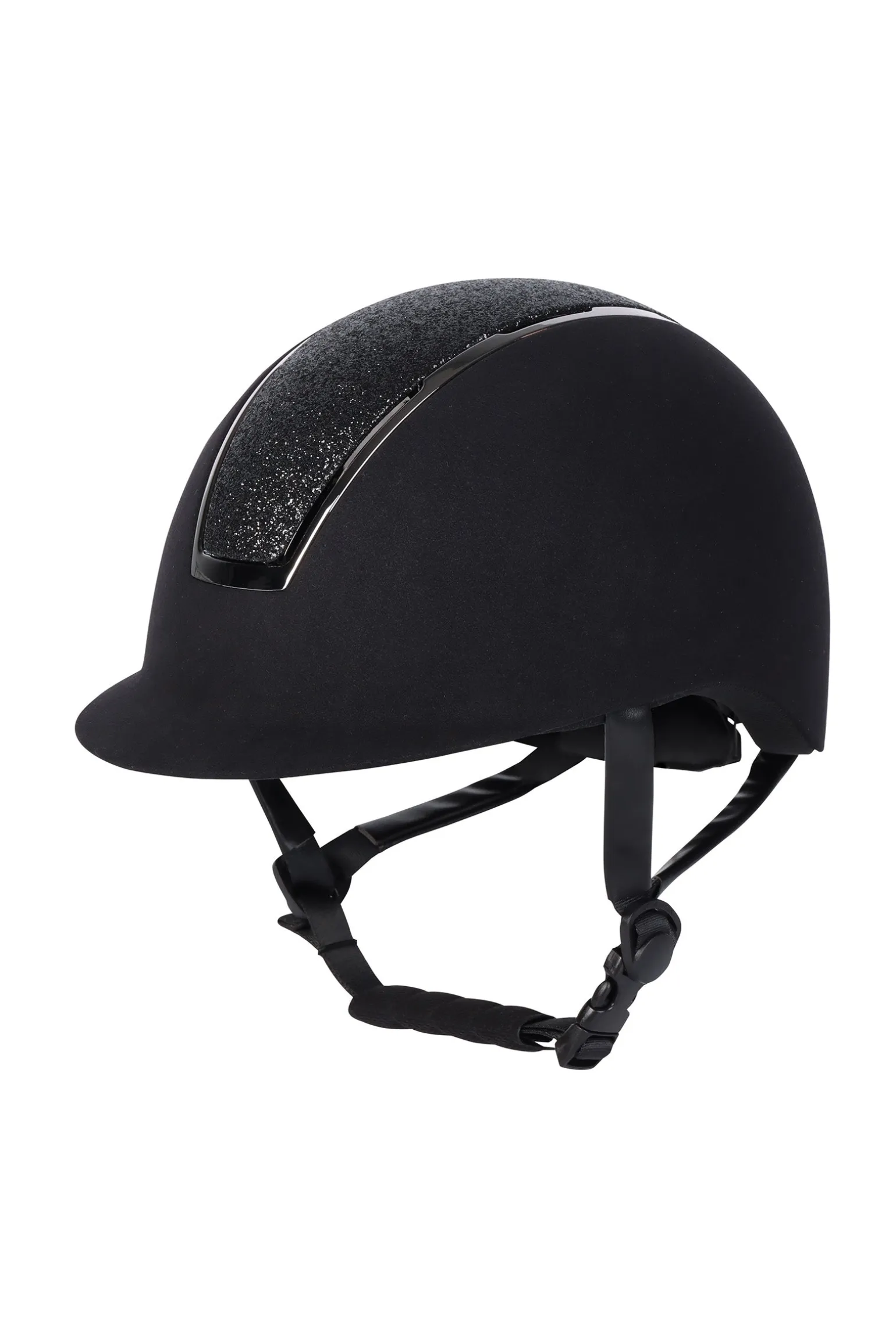 Schicke Reithelm mit Samt-Finish auf der Außenhülle. Die mittlere Spur hat schöne Glitzer. Einfache Einstellung mittels Drehknopf. Die Sicherheitskappe ist mit mehreren Belüftungsschlitzen versehen und hat ein herausnehmbares und waschbares Innenfutter. Erfüllt die folgenden Normen: CE VG1 01.040 2014-12.