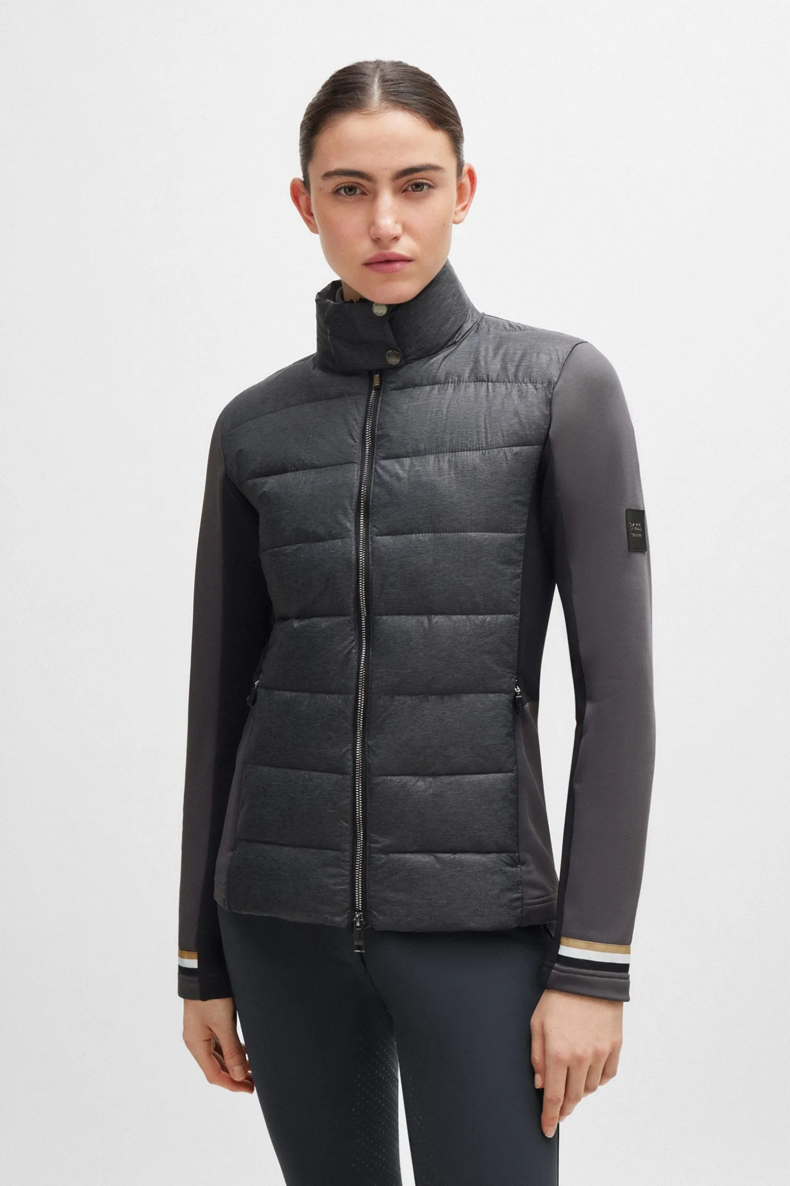 Leichter 2nd Layer Mix aus Puffer- und Softshelljacke. Softshell-Faser an Ärmeln und Seitenteilen, Vorderteil und oberer Rücken aus Puffer-Nylon mit Füllung.