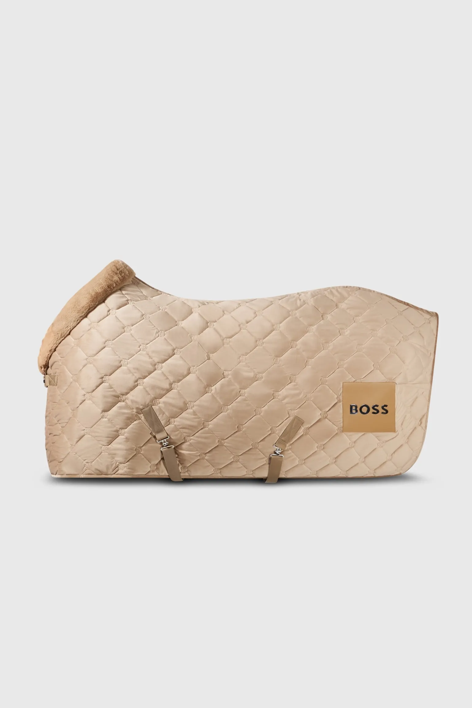 Die BOSS Turnier-Abschwitzdecke ist anatomisch geformt und hat eine perfekte Passform. Das künstliche Schafsfell im Hals-, Widerrist- und Brustbereich sorgt für einen angenehmen Sitz. Die extrem weiche Samtaußenseite mit vollflächiger BOSS Logo-Steppung wirkt äußerst luxuriös. Die Hightech-Faser auf der Innenseite verhindert Scheuerstellen und erzeugt kleine Luftblasen, die die Körperwärme einschließen und speichern. Außerdem glänzt das Fell des Pferdes durch den Kontakt mit dieser weichen Innenseite. Das hervorragende Wärme-Gewichts-Verhältnis maximiert den Komfort für Reiter und Pferd. Die dreilagige Rautensteppung macht die Turnierdecke sehr strapazierfähig und verhindert, dass sich Späne im Gewebe verfangen. Der doppelte Frontverschluss, der Bauchgurt und die Schweifkordel vervollständigen die Sicherheit der Turnierdecke.