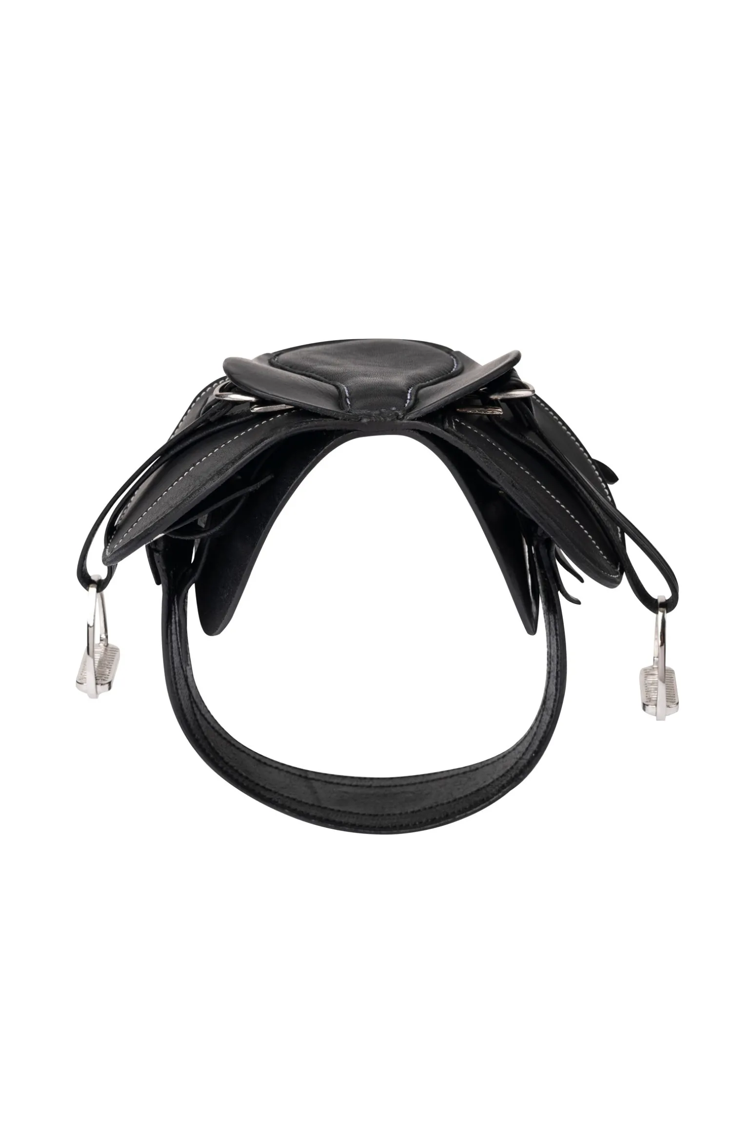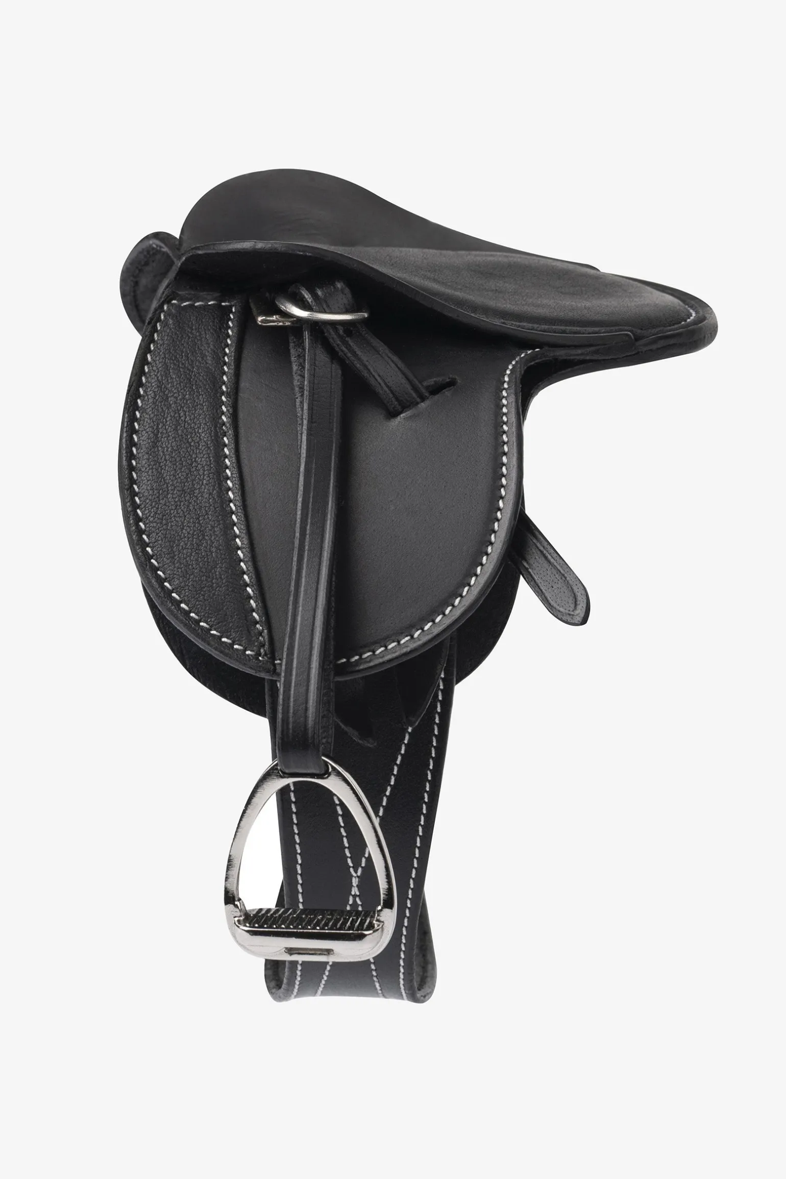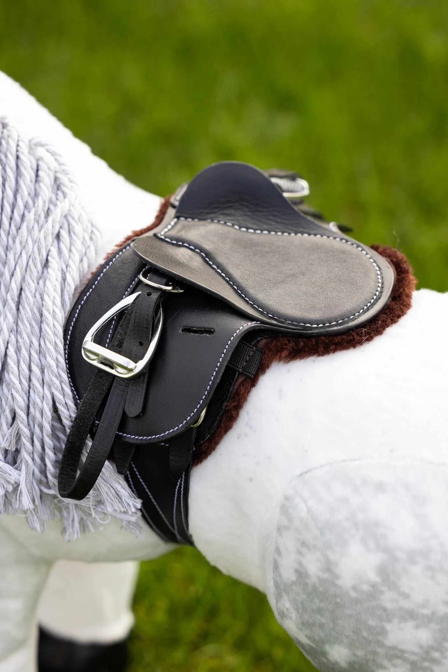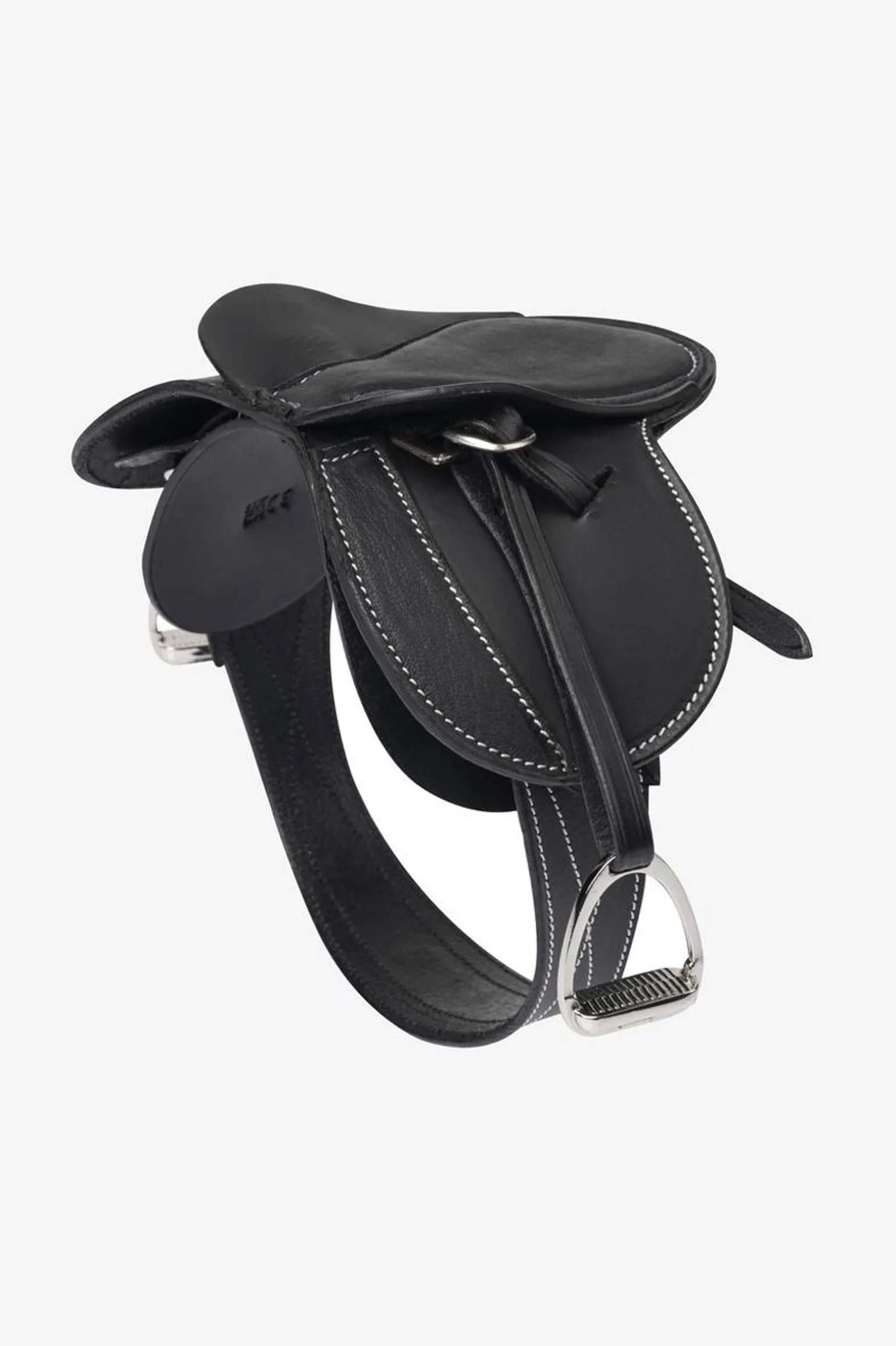 Exquisit gearbeiteter Miniatursattel aus schönem, fein genarbtem Leder. Echte Designmerkmale wie eine doppeltes Sattelblatt mit drei Gurtstrupfen und Schnallenschutz. Komplett mit abnehmbarem Sattelgurt und Steigbügeln aus Metall – ideal, um die Teile des Sattels kennenzulernen, das Aufsatteln zu üben und das Sattelzeug zu reinigen.