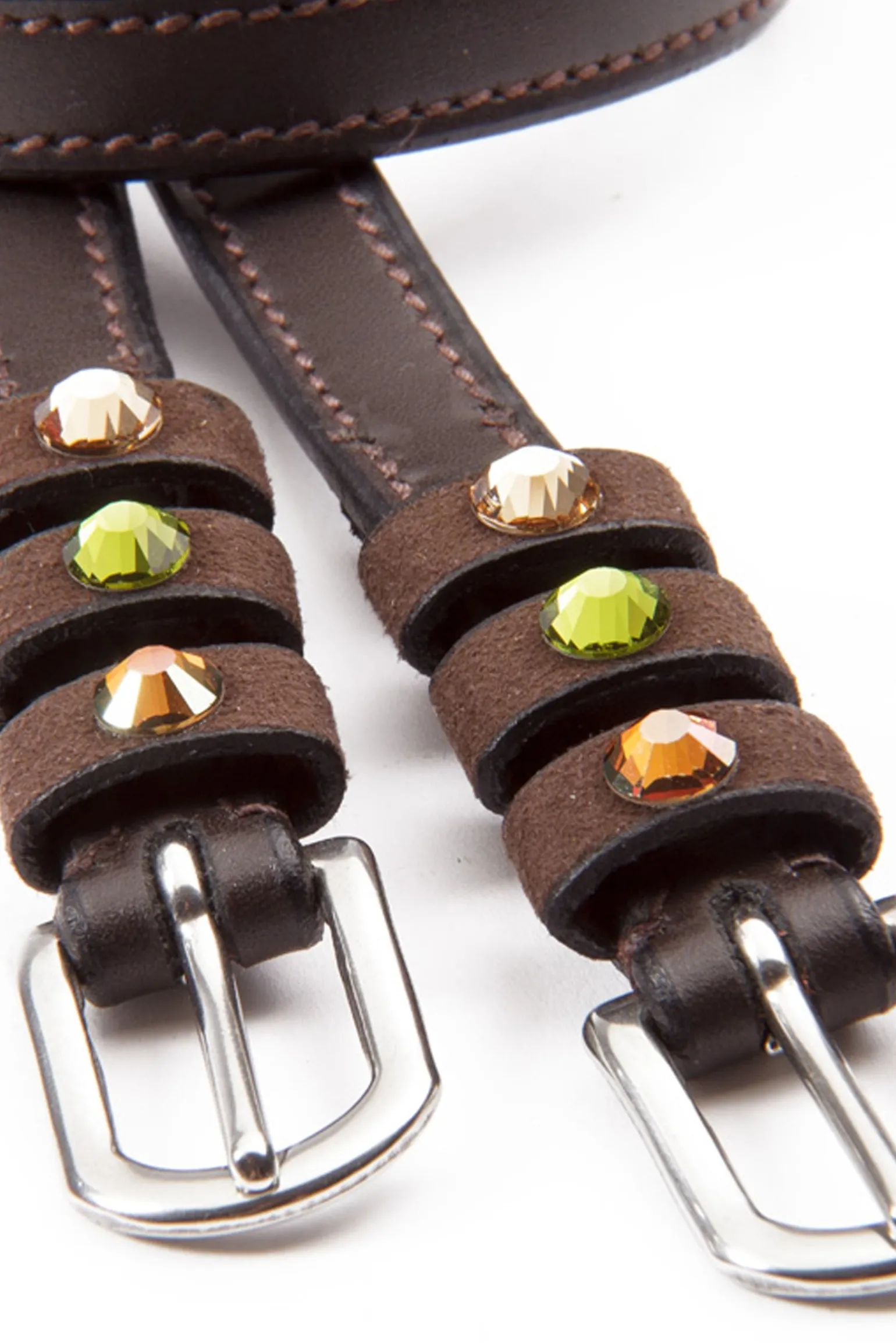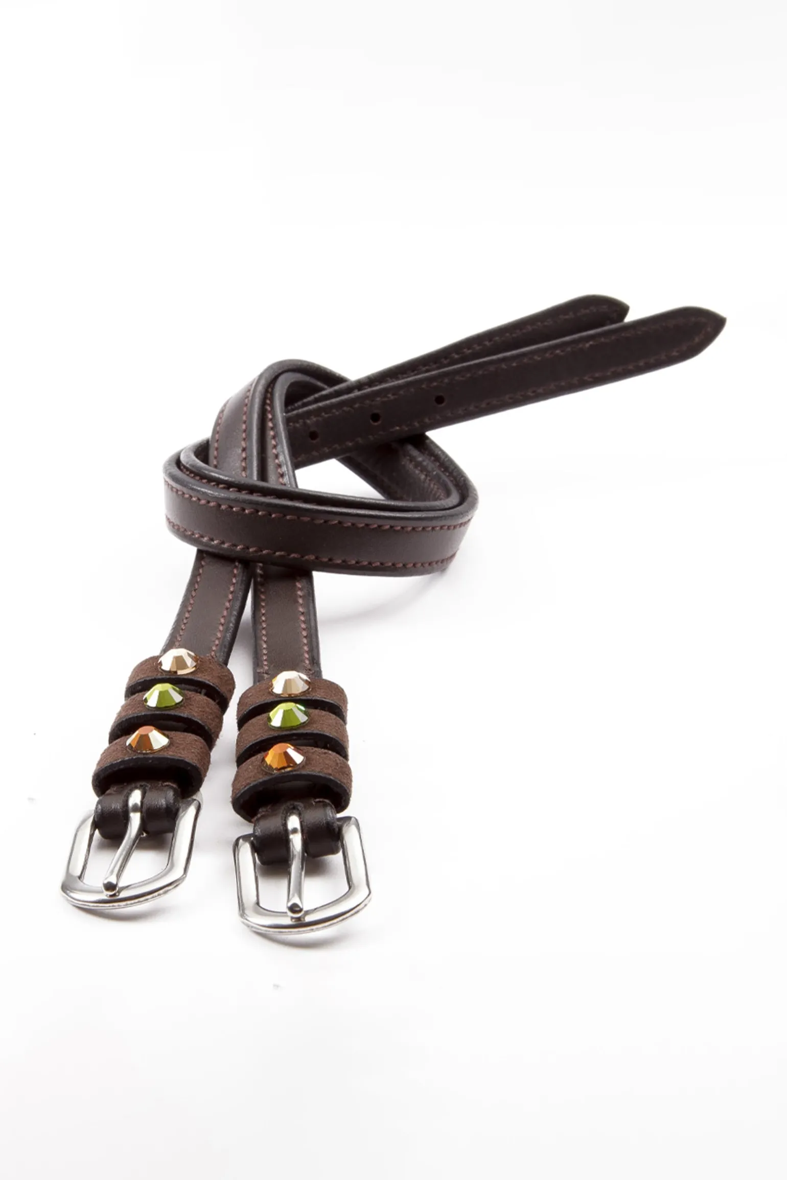 Sporenriemen „Seasons dreams“ aus weichem, langlebigem Qualitätsleder mit farbigen Strasssteinen auf den Schlaufen. Paarweise. Passendes Browband „Seasons dreams“ mit Knopfverschluss.