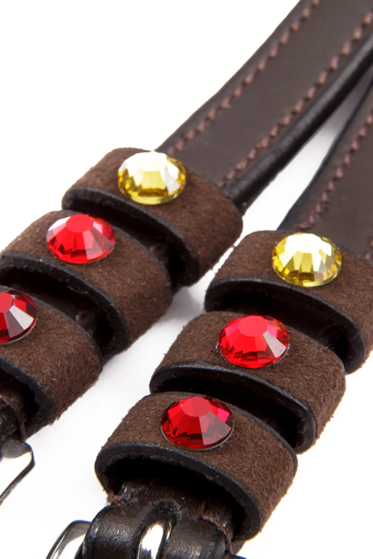 Sporenriemen „Seasons dreams“ aus weichem, langlebigem Qualitätsleder mit farbigen Strasssteinen auf den Schlaufen. Paarweise. Passendes Browband „Seasons dreams“ mit Knopfverschluss.