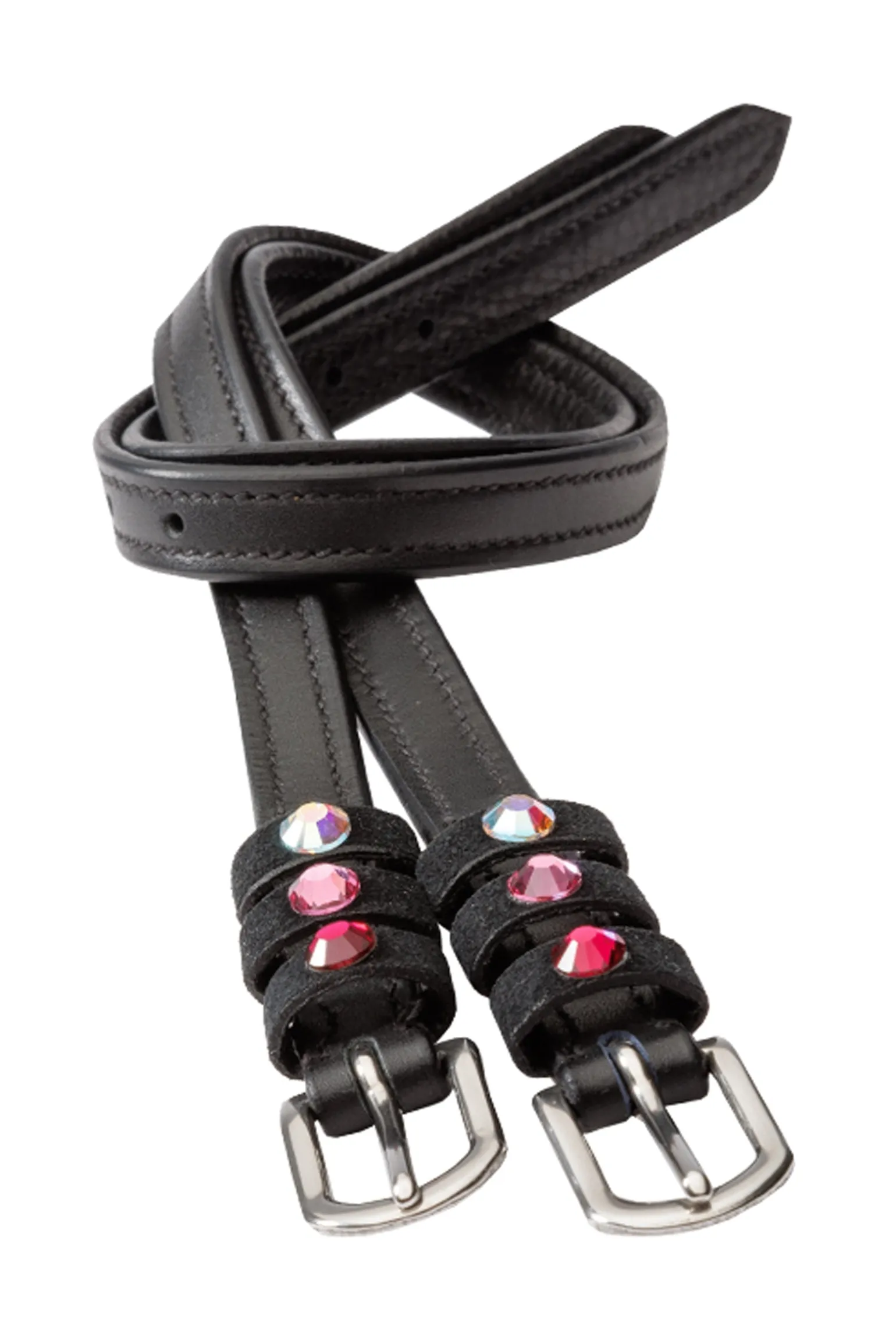 Sporenriemen „Seasons dreams“ aus weichem, langlebigem Qualitätsleder mit farbigen Strasssteinen auf den Schlaufen. Paarweise. Passendes Browband „Seasons dreams“ mit Knopfverschluss.