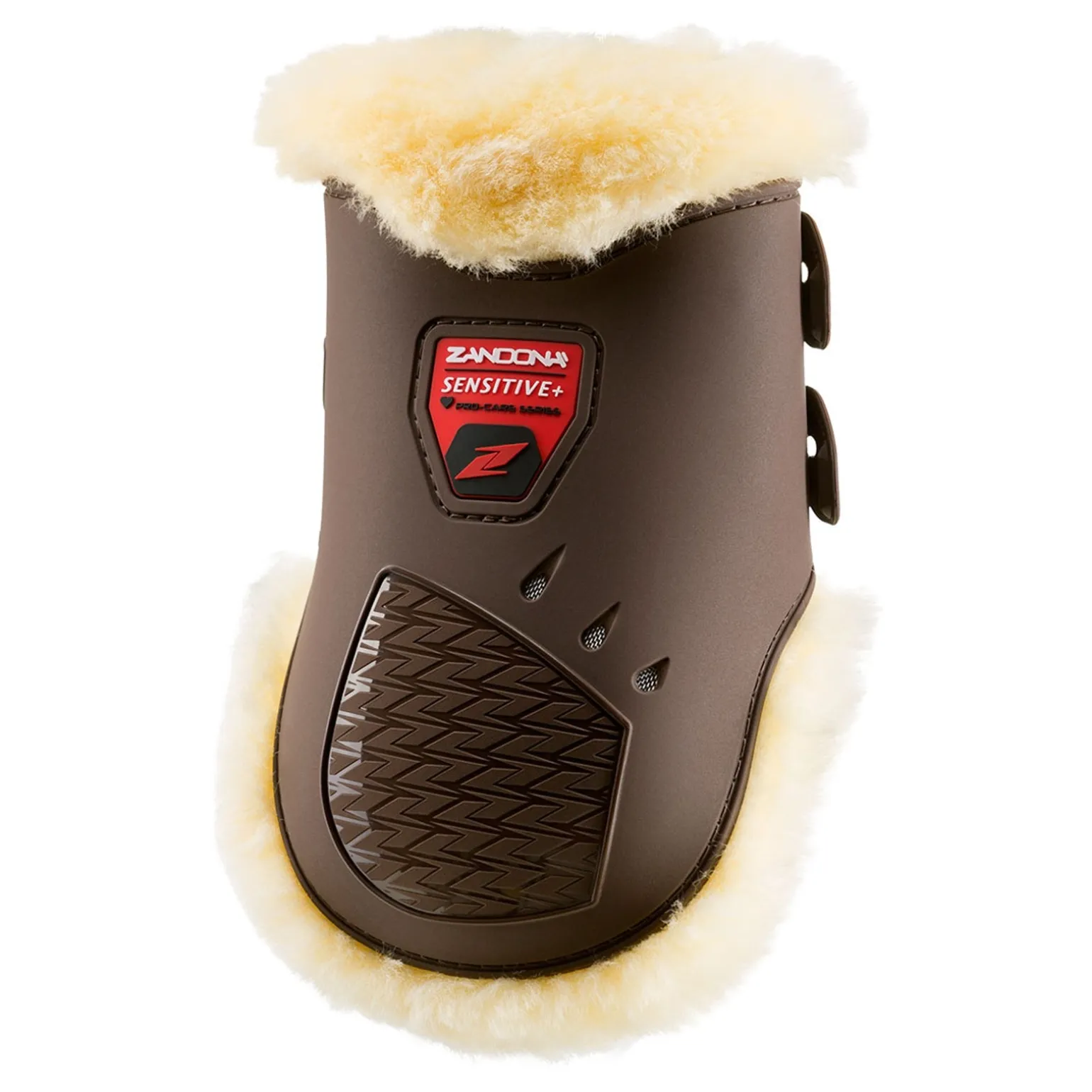 Das zu 100 % in Italien hergestellte Schutzsystem “SENSITIVE+ Fetlock“ wurde entwickelt, um Springpferde vor Aufprall und Hämatomen an den vorderen Fesseln und einem Teil des Schienbeins zu schützen und gleichzeitig Halt für die Sehnen zu bieten. Ihre Innenbeschichtung mit natürlichen Lammfell um maximalen Komfort und antiallergische Eigenschaften, ideal für empfindliche Pferdebeine. Es besteht aus einer äußeren TPU-Struktur mit differenzierter Dicke, belüftet mit 3 Lüftungsöffnungen. Zwischen der äußeren TPU-Struktur und dem Innenbeschichtung befindet sich Gel- Tech, das, wenn nötig, als Stoßdämpfer und ansonsten als bequemes Polster dient. Kohlenstofffaser Elemente sind unter der Schale thermisch zu isolieren die Gelenke von der Wärme, die durch äußere Reibung erzeugt, bei gleichzei – tiger Erhöhung der mechanischen Festigkeit gegen Stöße. Die elastischen Bänder mit Schnellöffnern wurden für einen sicheren Verschluss kalibriert, der eigentlich aus einem doppelten Verschlusssystem besteht (horizontal/vertikal). Die Maße und die absolut ergonomische Form wurden als genaue Kopie der Beinstruktur entwickelt, was eine perfekte Positionierung garantiert und jegliche Spannung vermeidet.