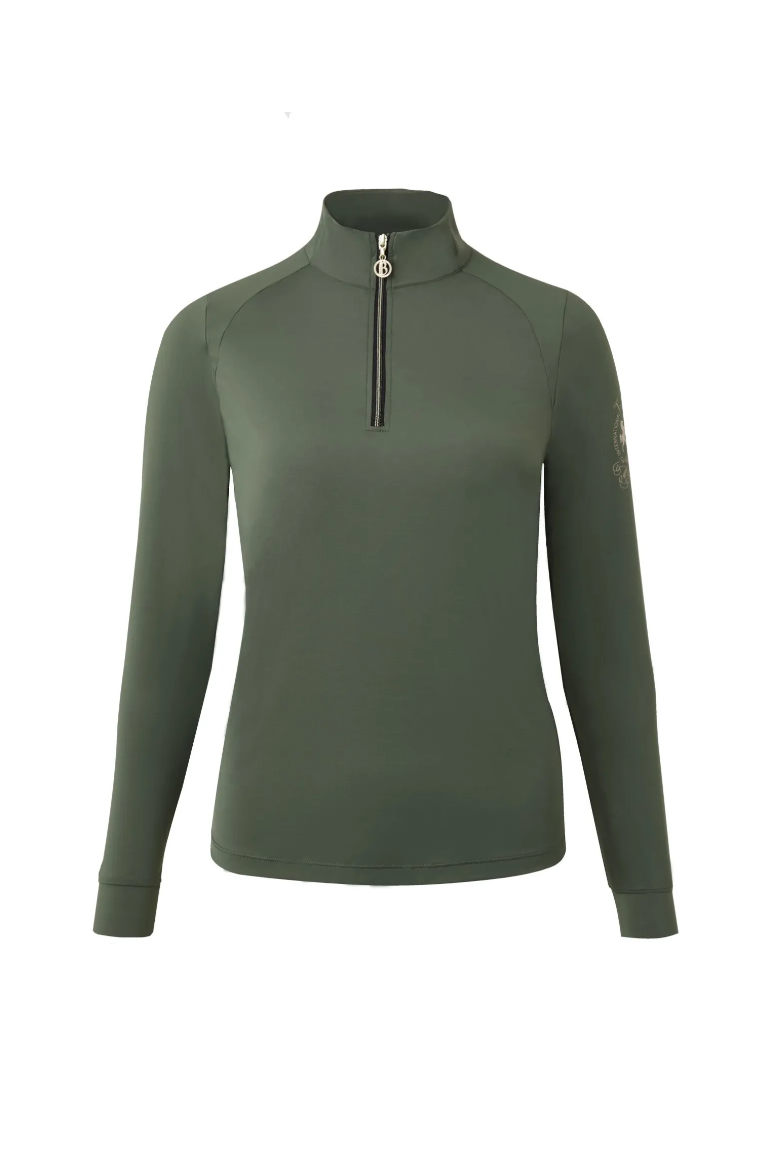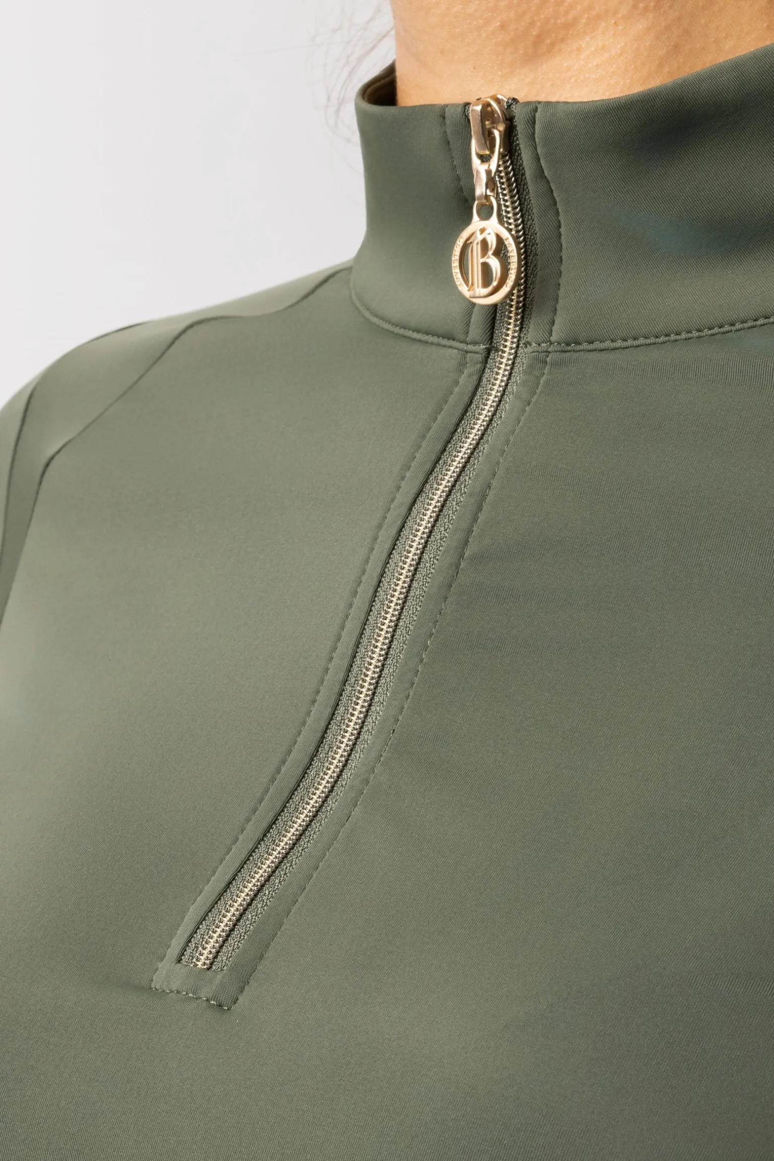 Perfektes Trainingsshirt für den Lagenlook oder Frühlingstage dank des feuchtigkeitsableitenden Materials, das sich kühl auf der Haut anfühlt und einen UV-Schutz hat. Das Mesh unter den Achseln sorgt für erhöhte Atmungsaktivität. Ein zarter goldener B Vertigo-Schriftzug unterhalb des Nackens und das Logo auf dem linken Ärmel runden das edle Design ab. Dazu passender hellgoldener Reißverschluss.