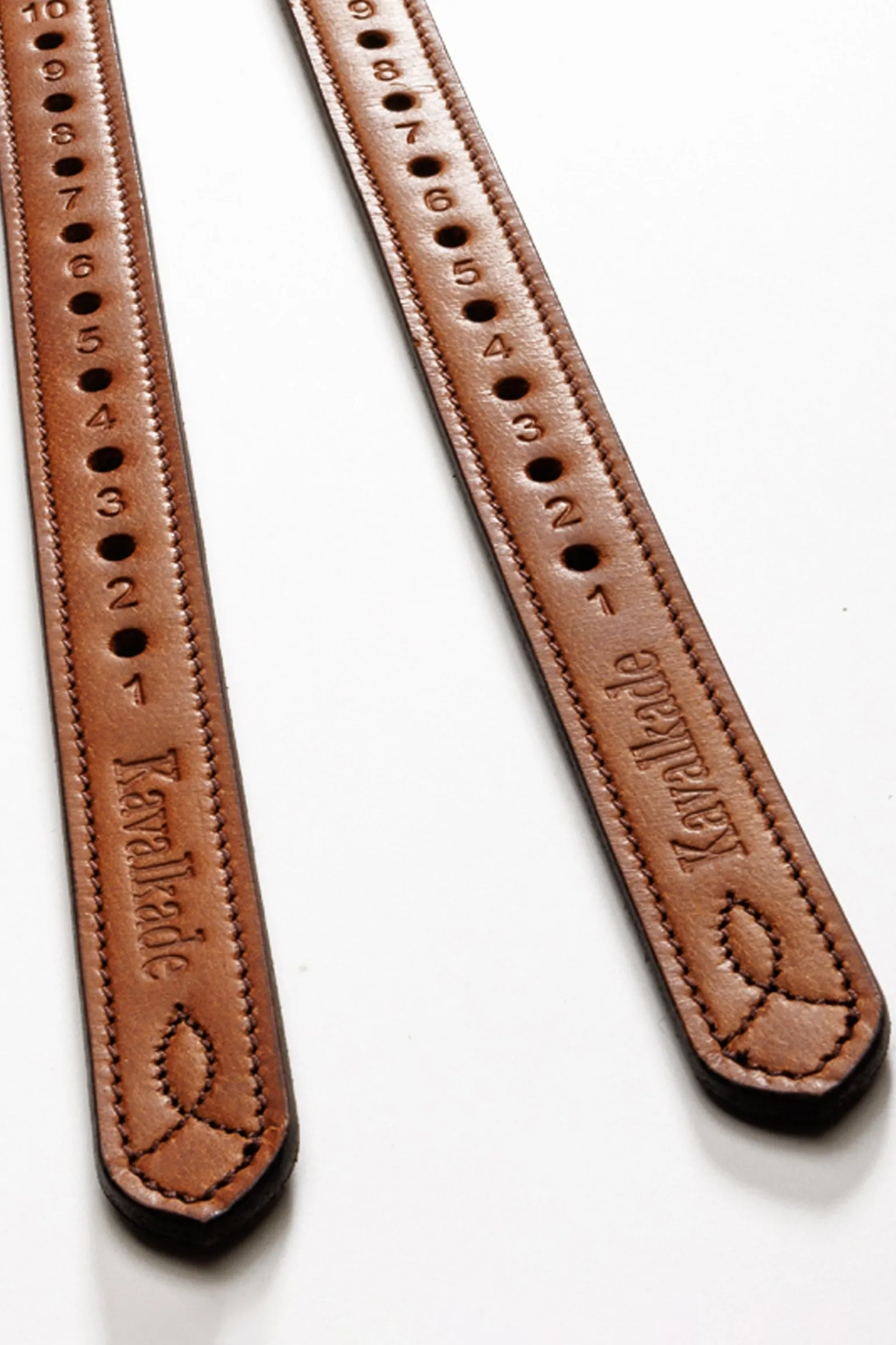 Die Steigbügelriemen bestehen auf der Oberseite aus geöltem Leder und auf der Unterseite aus weichem Leder. Das geölte Leder macht die Steigbügelriemen haltbarer, während das weiche Leder für Geschmeidigkeit sorgt. Ein Nylonband im Inneren verleiht den Steigbügelriemen extreme Stabilität. Die gebogene Schnalle sorgt für einen angenehmeren Sitz.