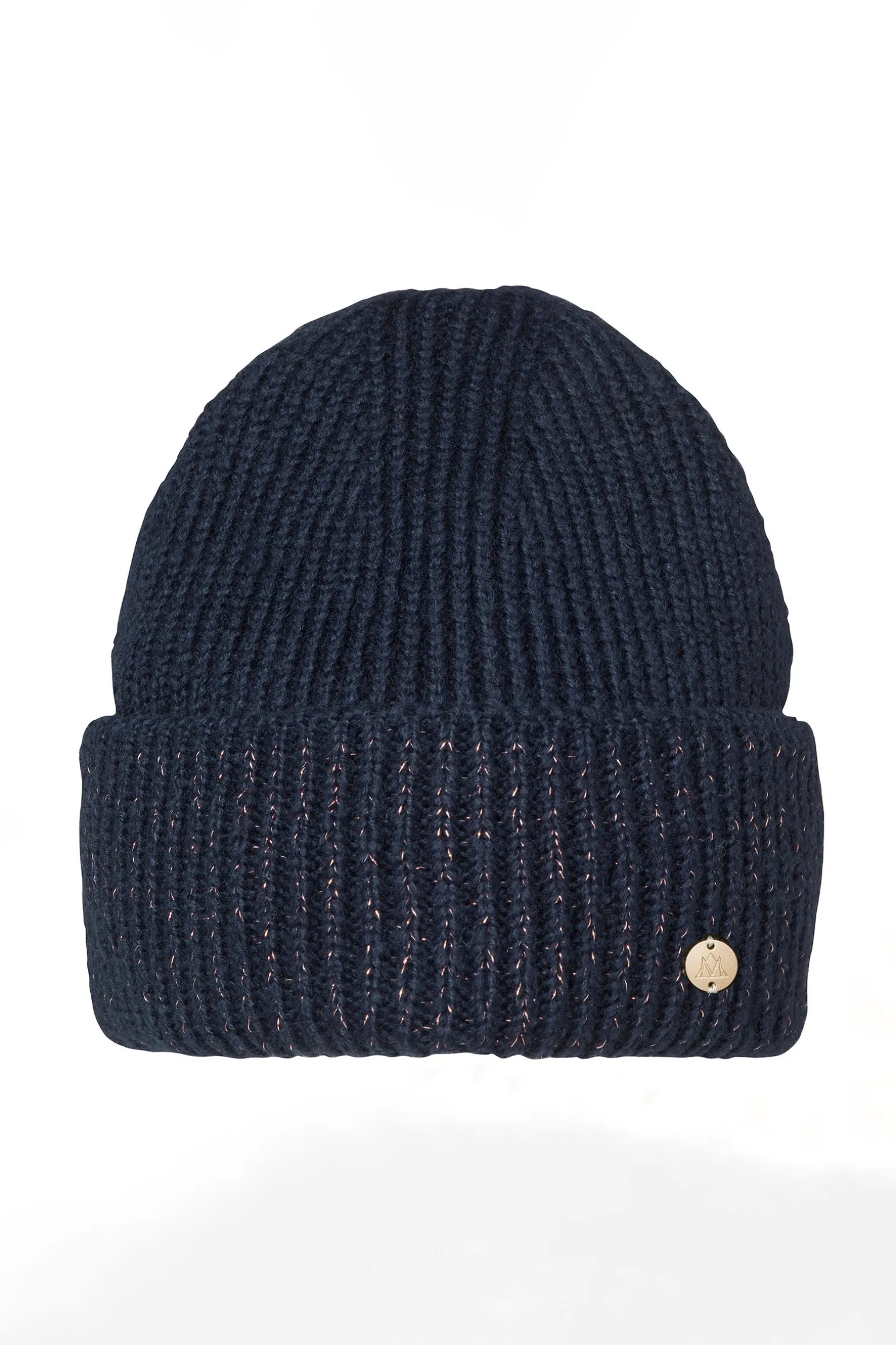 Gemütliche, doppelt gefaltete Strickmütze mit glitzerndem Lurexfaden und schickem MH-Logoabzeichen.