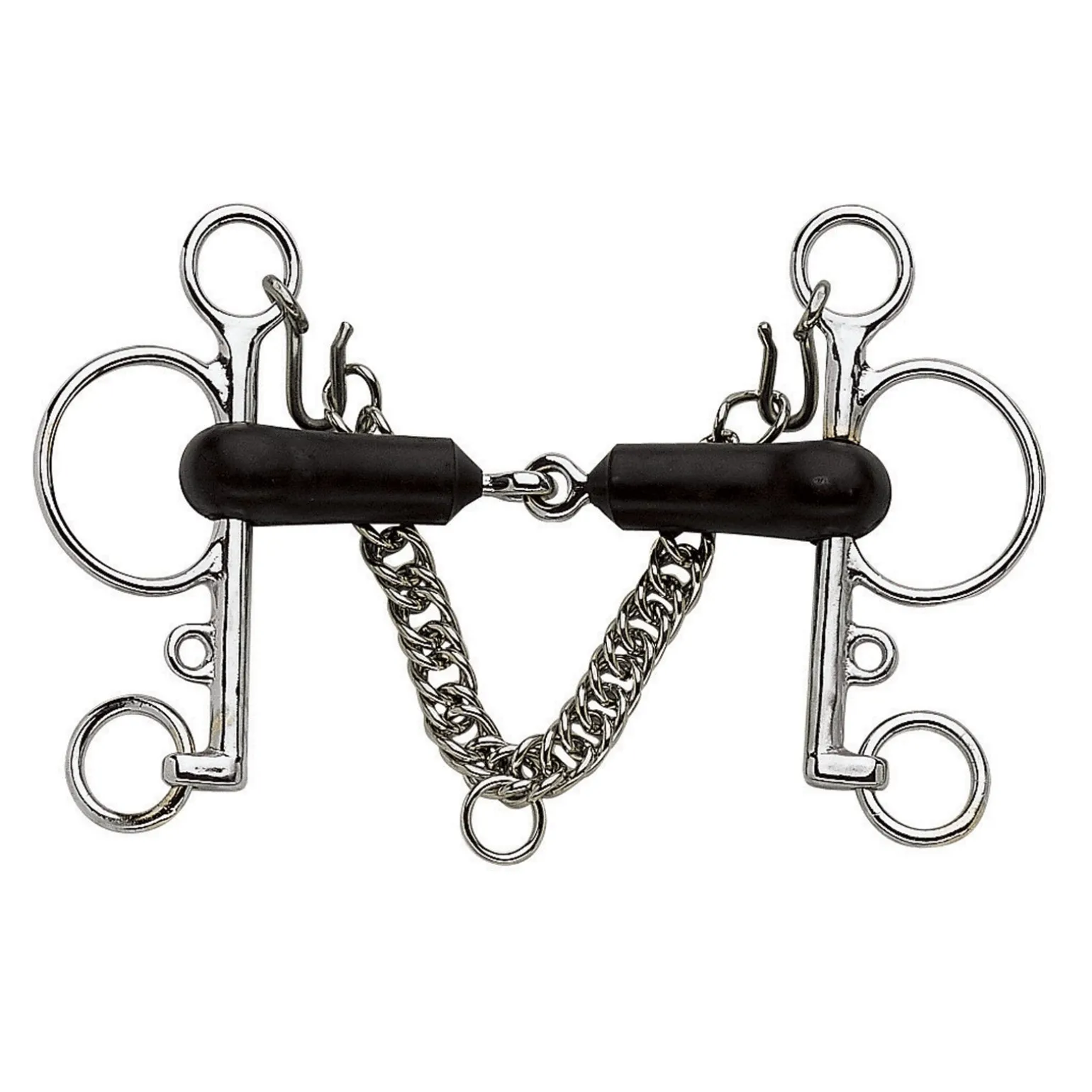Gummigebisse von Sprenger sind aus weichem aber robusten Gummi gefertigt und haben einen Stahlkern innenliegend, um das Mundstück zu verstärken. Gummi hat generell einen reibenden Effekt. Daher ist es wichtig, dass Pferde speicheln und kauen wenn diese Gebisse verwendet werden. Wenn das Pferd nicht genügend Speichel produzieren kann, wird das Gebiss unangenehm.Anders als bei Gebissen aus reinem Metall besteht bei Kunststoff die Gefahr, durchgebissen zu werden, wenn das Gebiss nicht korrekt verschnallt ist und in Kontakt mit den Zähnen kommt.Das Pelham ist ein Gebiss, welches etwas mehr Hebelwirkung über das Genick ausübt. Der Druck auf den Unterkiefer wird über eine Kinnkette ausgeübt. Im weitesten Sinne ist ein Pelham eine Kombination von Kandare und Wassertrense. Pelhams können mit ein oder zwei Zügeln verwendet werden, was auch Möglichkeiten für verschiedene Verschnallungen der Zügel gibt. Direkter Druck wird auf die Zunge und die Laden des Pferdes ausgeübt, wenn der Reiter nur die Trensenzügel verwendet.Wenn Pferde oft mit den Kopf hochreißt macht es Sinn, einen zweiten Zügel am unteren Ende des Anzugs einzuschnallen, damit mehr Druck auf das Genick des Pferdes ausgeübt wird. Das Pferd wird dem Druck entweichen wollen und den Kopf senken. Der Anzug sollte einen maximalen Anstellwinkel von 45° (unterer Anzug zum Maul des Pferdes) haben, um zu verhindern, dass das Pferd den Kopf zu tief nimmt.Es ist weit verbreitet, dass zwei Zügel verwendet werden, um mehr Druck auf das Genick des Pferds auszuüben wenn dies notwendig ist. Pelhams können auch mit Pelham-Riemen verwendet werden. Diese Riemen werden im oberen und unteren Anzug eingeschnallt und der Zügel dann mit dem Riemen verbunden.
