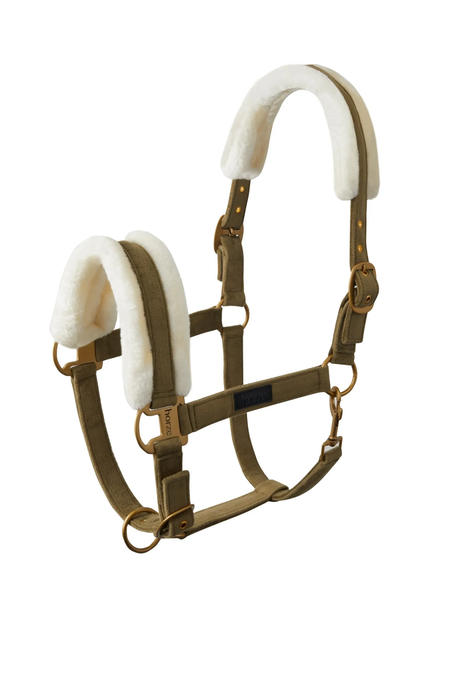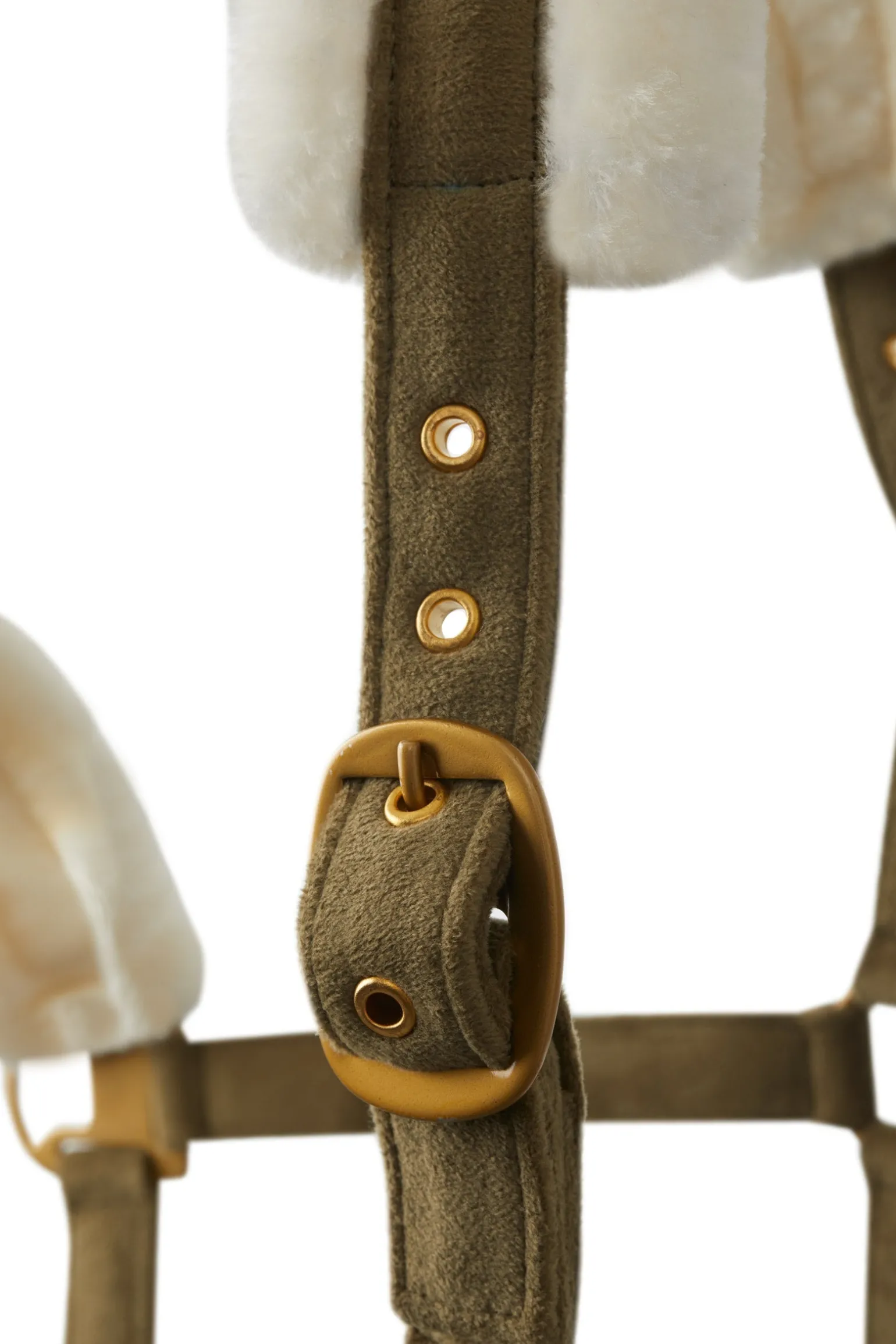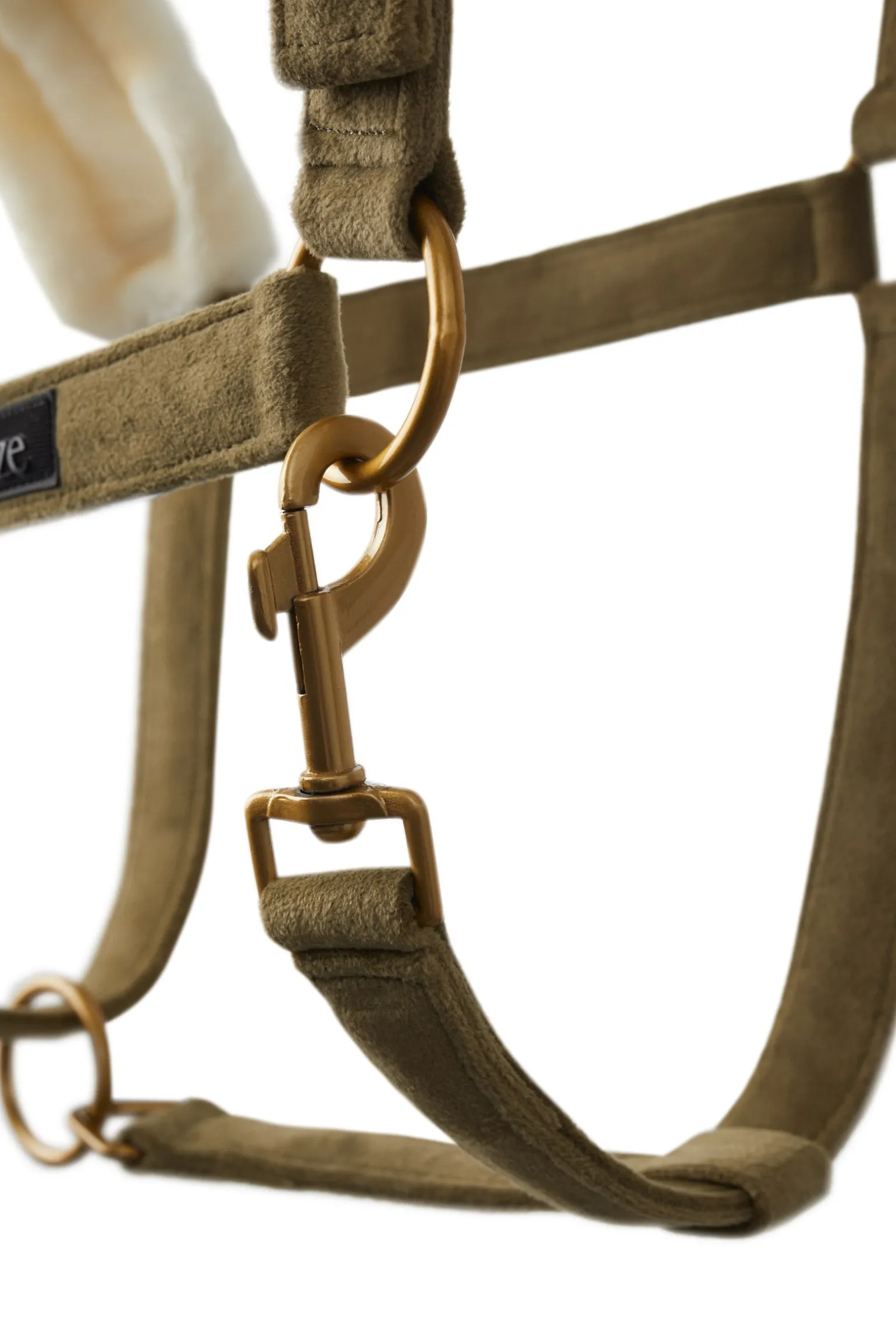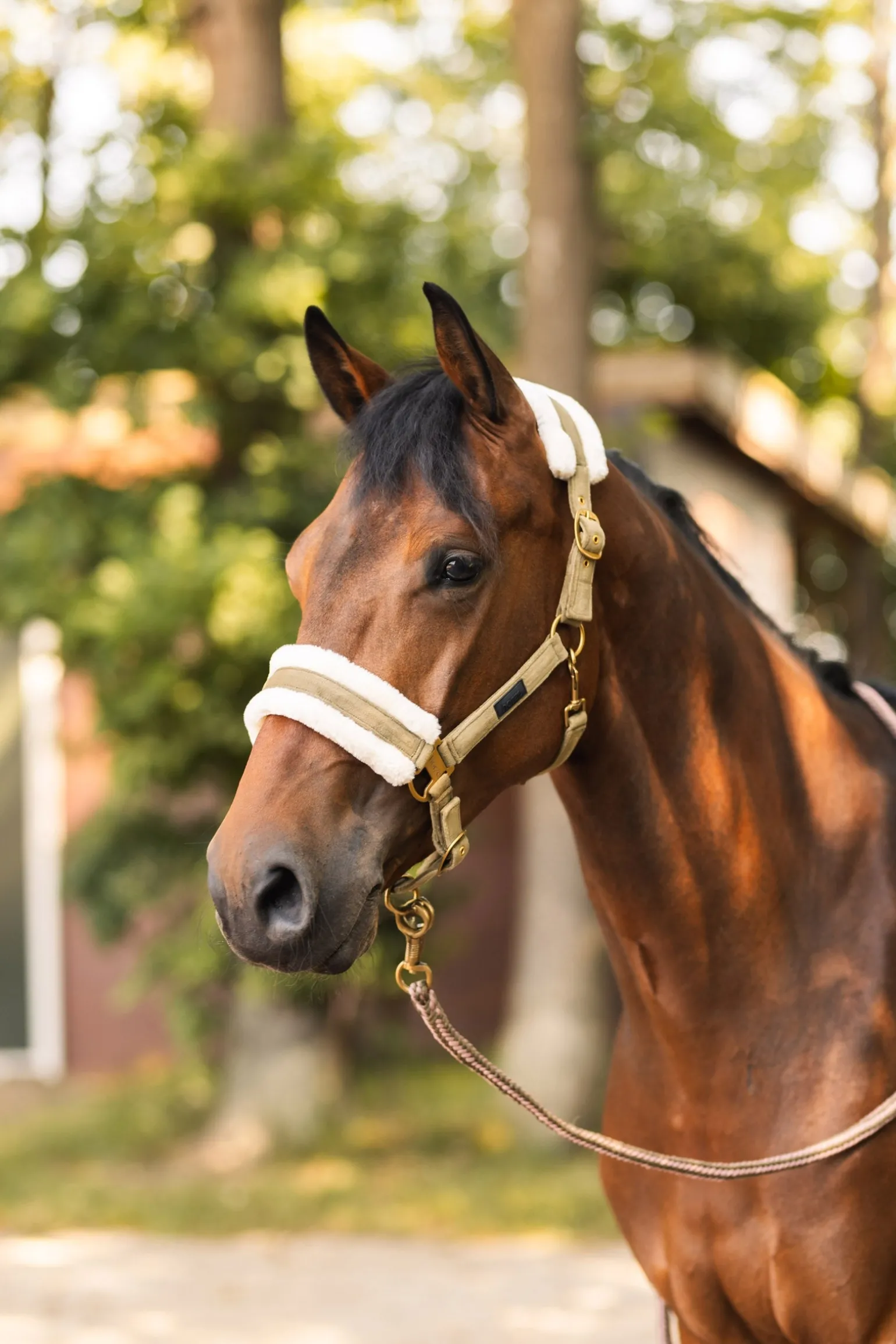 Das Halfter aus weichem Samtstoff bietet ein luxuriöses und weiches Gefühl, ohne dabei an Stabilität einzubüßen. Das strapazierfähige Gurtband im Inneren sorgt für zuverlässige Leistung und eine lange Lebensdauer. Mit den verstellbaren Beschlägen an Nase und Genick kannst du die Passform ganz einfach an den Bedarf deines Pferdes anpassen.