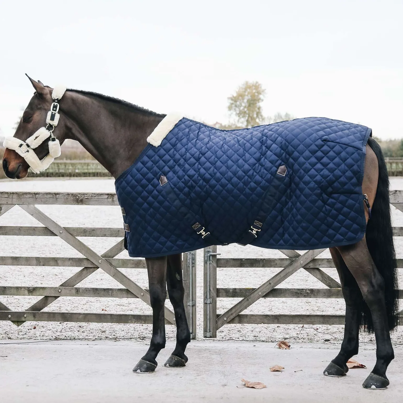 Die Stalldecke hat eine anatomische Form und wird von 2 starken Schnallen vorne und 2 Kreuzgurten mit Sicherheitsgurt-Gewebe verschlossen. Dank des künstlichen Kaninchenfells gleitet die Decke nach dem Wälzen oder Liegen von allein wieder an Ort und Stelle. Für zusätzlichen Schutz des Widerristes hat die Decke in diesem Bereich künstliches Lammfell.