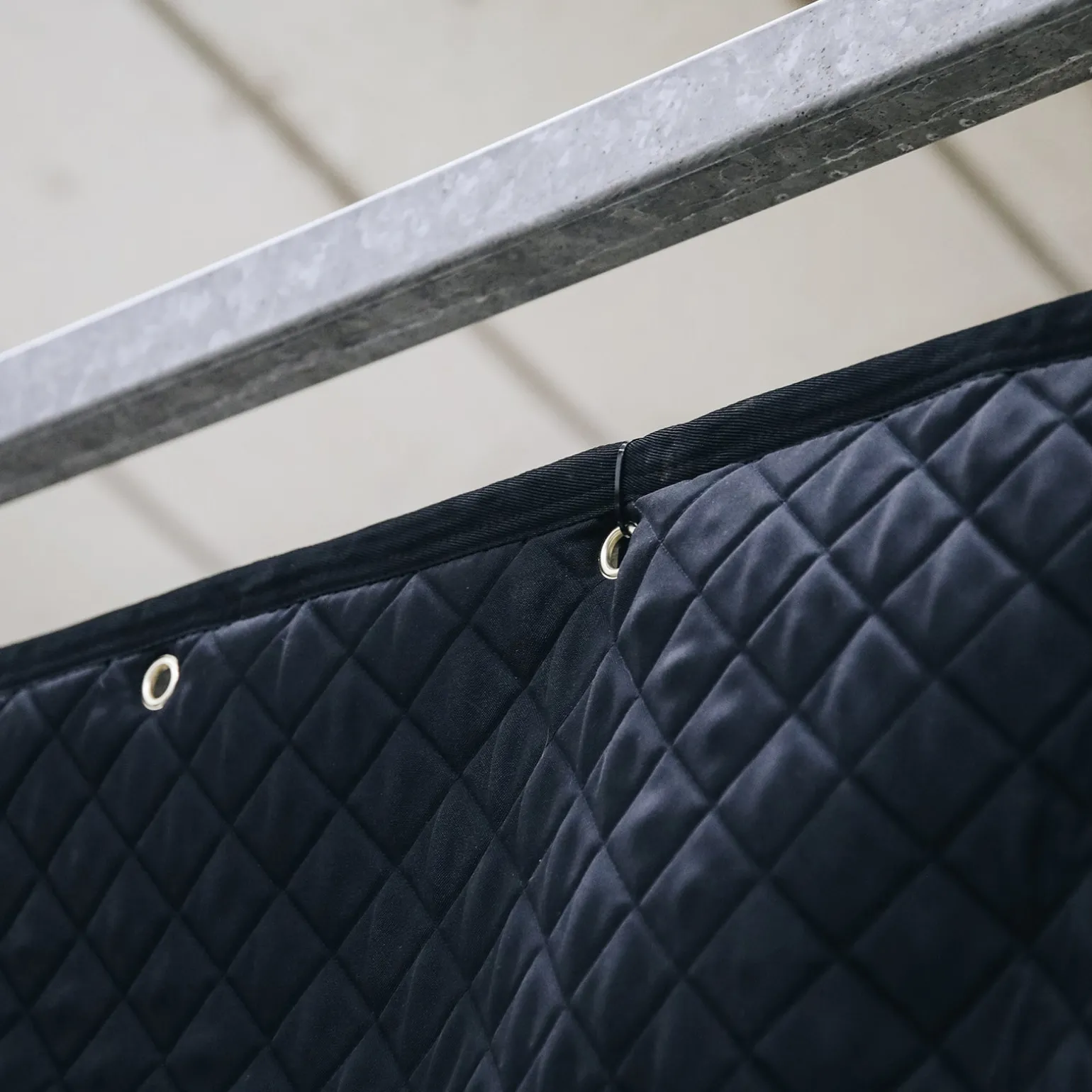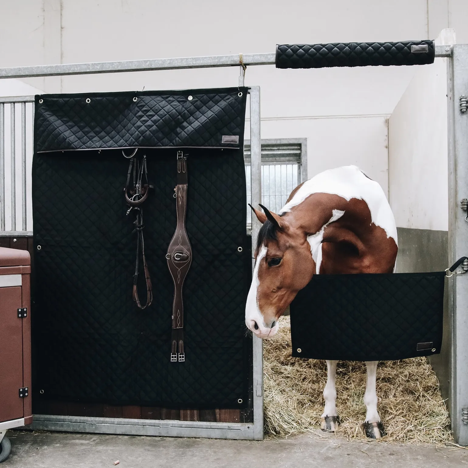 Der Kentucky Horsewear Stallvorhang ermöglicht dem Pferd die wohlverdiente Ruhe auf dem Turnier oder auch Zuhause. Der Stallvorhang hat 5 goldene Ringe zur Befestigung an der Box. Zudem ist der Stallvorhang mit 5 Snaphaken ausgestattet. An diesen praktischen Haken können Trensen, Schabrackenhalter usw. aufgehängt werden. Diese Haken befinden sich unter dem kleinen vorderen Vorhang. Durch die Diamantensteppung, die braune Biese aus Kunstleder und dem dezenten Kentucky Logo wirkt das Design sehr schick. Der Stallvorhang kann mit dem Kentucky Horsewear Kopfschutz und Türvorhang kombiniert werden. Es ist aus einem 600Denier High Tenacity Polyester und maschinenwaschbar bei 30°, kein Trockner Verfügbar. Einheitsgröße.