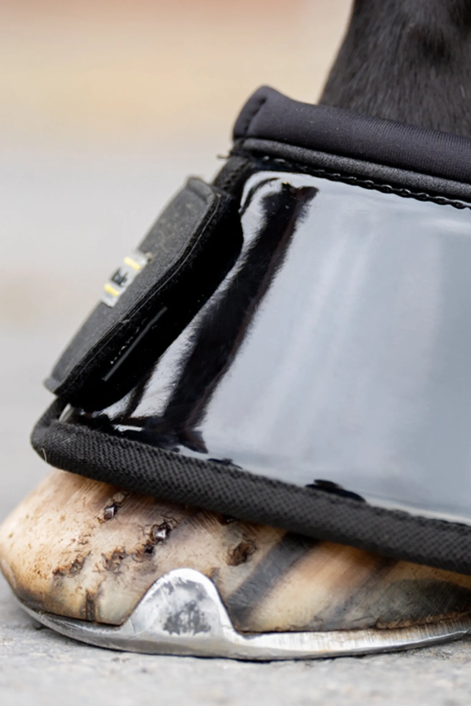 The robust overreach boots „Star“ by Kavalkade are made of soft shock-absorbing neoprene material on the inside and easy-care synthetic leather on the outside. The fetlock and ball of the foot area is very softly padded by a neoprene edge. The lacquer and the subtle glitter piping give the overreach boots an elegant look. Robust double hook and loop fastener.