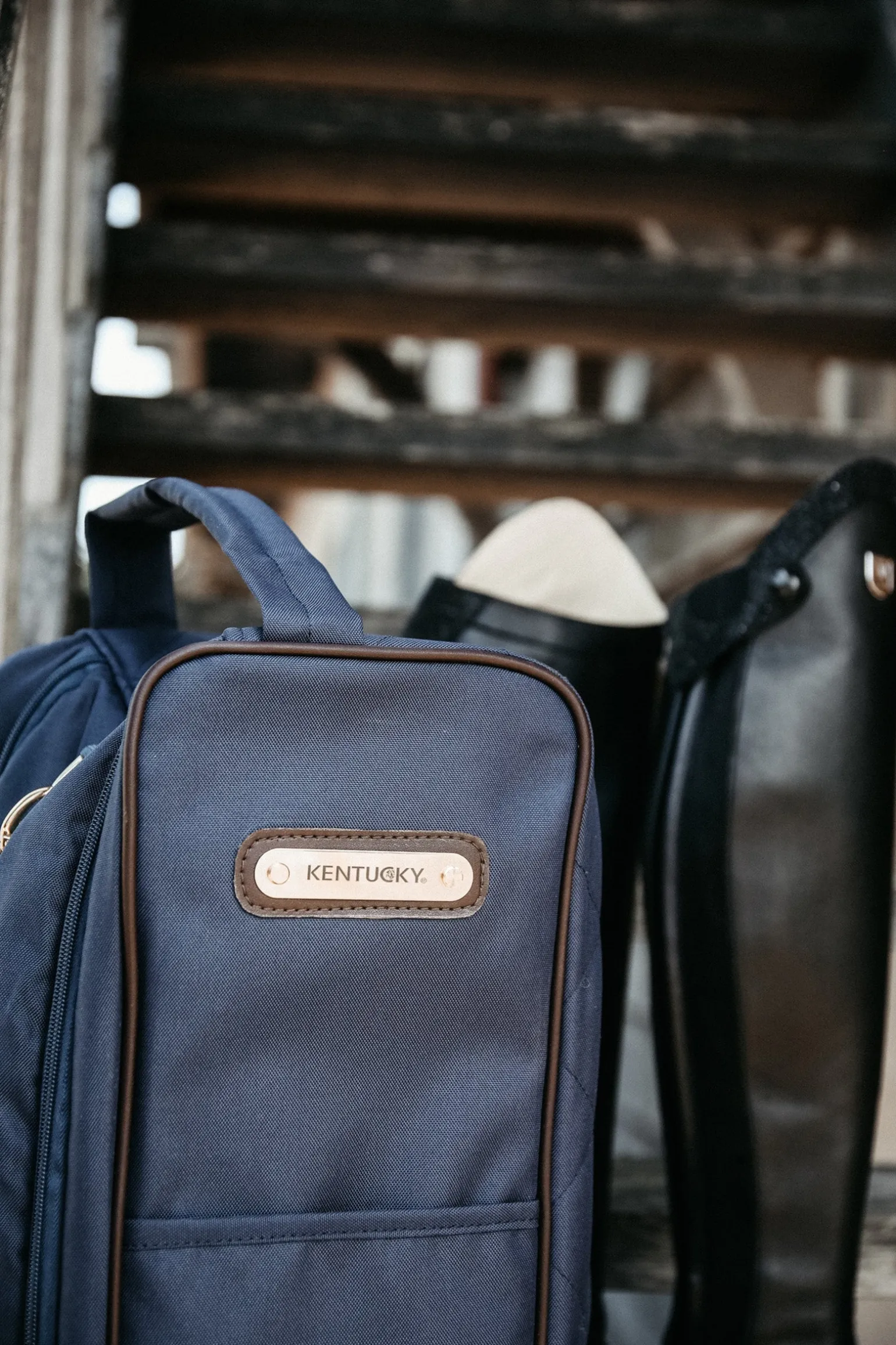 Die Kentucky Horsewear Stiefeltasche schützt deine Stiefel beim Transport, auf dem Turnier oder zu Hause. Die Stiefeltasche hat auf der Innenseite ein Futter aus künstlichem Kaninchenfell, um Kratzer im Leder zu vermeiden. Das Namensschild auf der Vorderseite kann zur Personalisierung umgedreht werden. Die Stiefeltasche lässt sich dank des langen Nylonriemens, der in der Länge verstellt werden kann, und des praktischen Griffs an der Oberseite leicht transportieren. Die Stiefeltasche hat die gleiche marineblaue Diamant-Steppung und Kunstlederschnur wie unsere Trensentasche, unser Stall-Set (Vorhang, Kopfschutz, usw.) und unsere Decken! Damit ist diese Stiefeltasche die Krönung des Kentucky Turnier-Looks. Die Stiefeltasche ist bei 30° in der Maschine waschbar, kein Trockner.