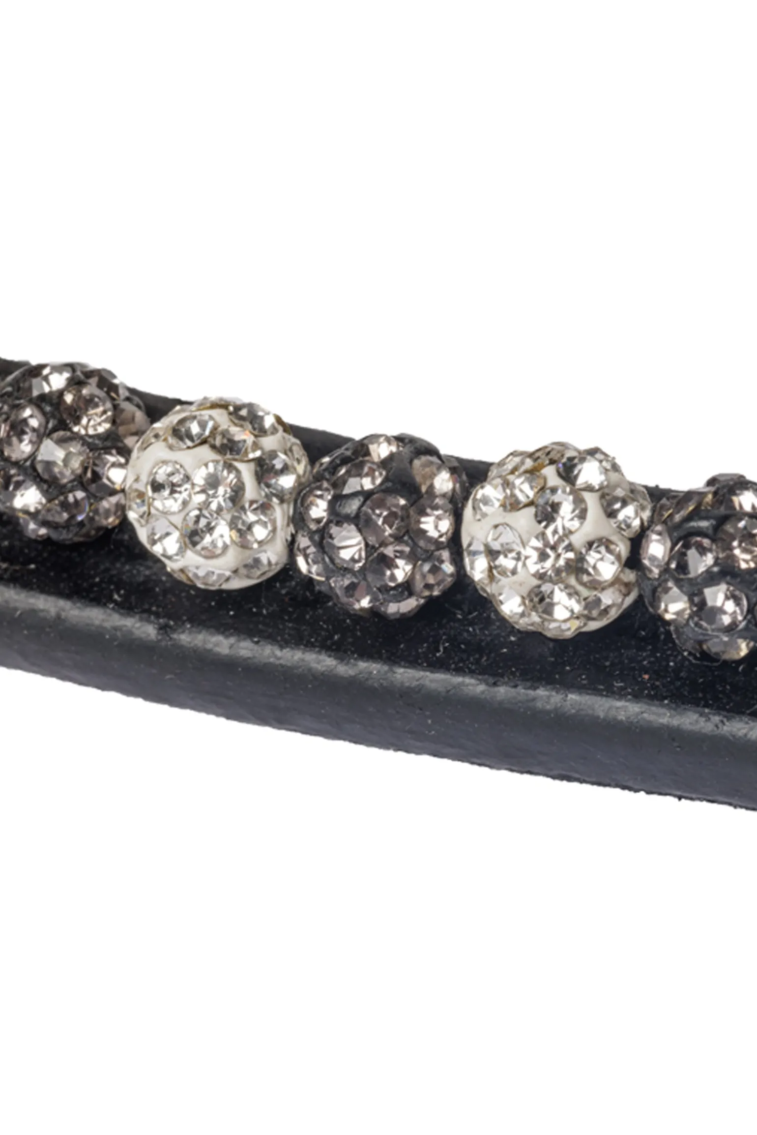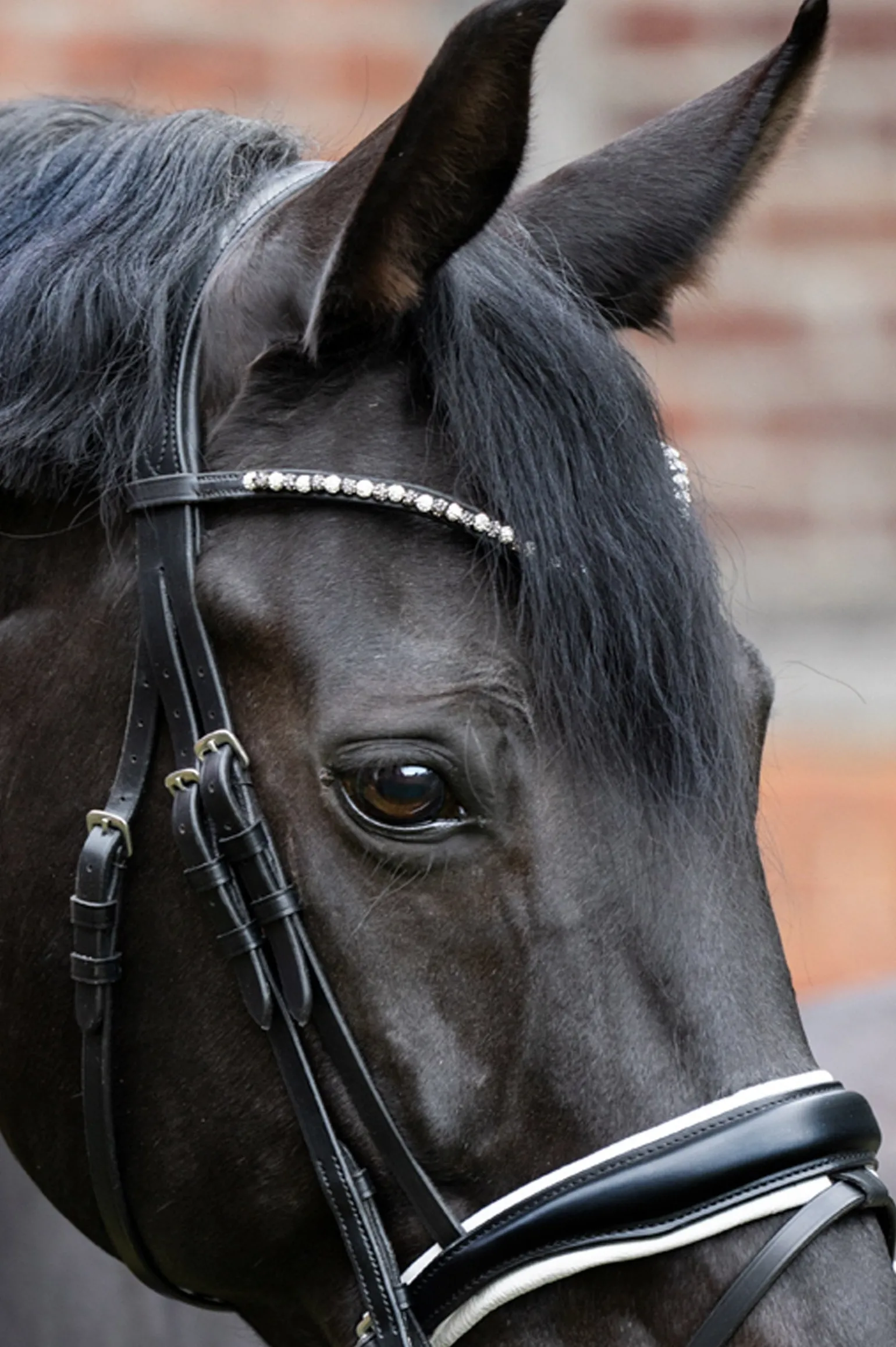 Sehr schicker schmaler Stirnriemen mit Dekoration aus Kunstperlen in Silber und Grau. Diese sind mit Strasssteinen verziert.