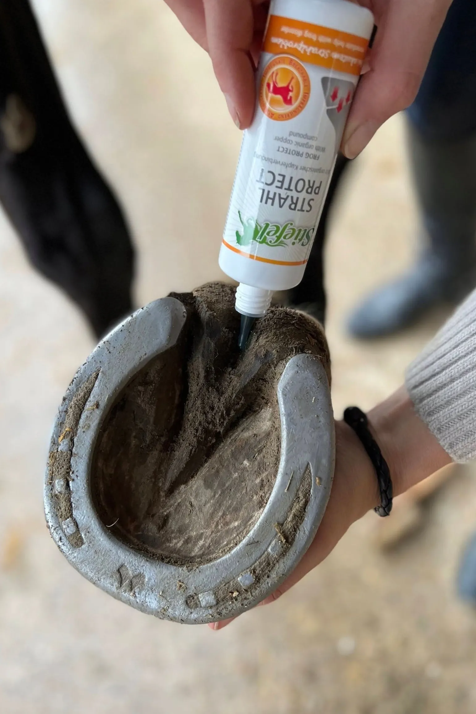 Stiefel Strahl Protect wird bei akuten Strahlproblemen eingesetzt und kann den Hufstrahl vor schädlichen Einflüssen, wie Ammoniak oder Urin in der Boxeneinstreu, schützen. Stiefel Strahl Protect enthält eine organische Kupferverbindung, eine hochaktive Trägersubstanz, die den Strahl pflegen und trocken halten kann. Strahl und Sohle werden imprägniert, die Atmungsaktivität des Horns bleibt jedoch erhalten. Durch das tiefe Eindringen des Produktes in die Strahlfurche wird eine besonders tiefgehende Wirkung erreicht. Im akuten Fall kann Stiefel Strahl Protect täglich in die Strahlfurche eingegeben werden. Ist die Strahlfurche sehr tief kann das Produkt mit einem Wattebausch in die Vertiefung eingeführt werden. Tägliches Wechseln ist dringend erforderlich. Anwendung: Ein- bis zweimal wöchentlich, bei Bedarf täglich in die Strahlfurche einstreichen. Das Pferd sollte möglichst auf trockenem Untergrund stehen. Bei sehr tiefer Strahlfurche Wattebausch mit Strahl Protect tränken und in die Vertiefung einführen. Täglich wechseln.