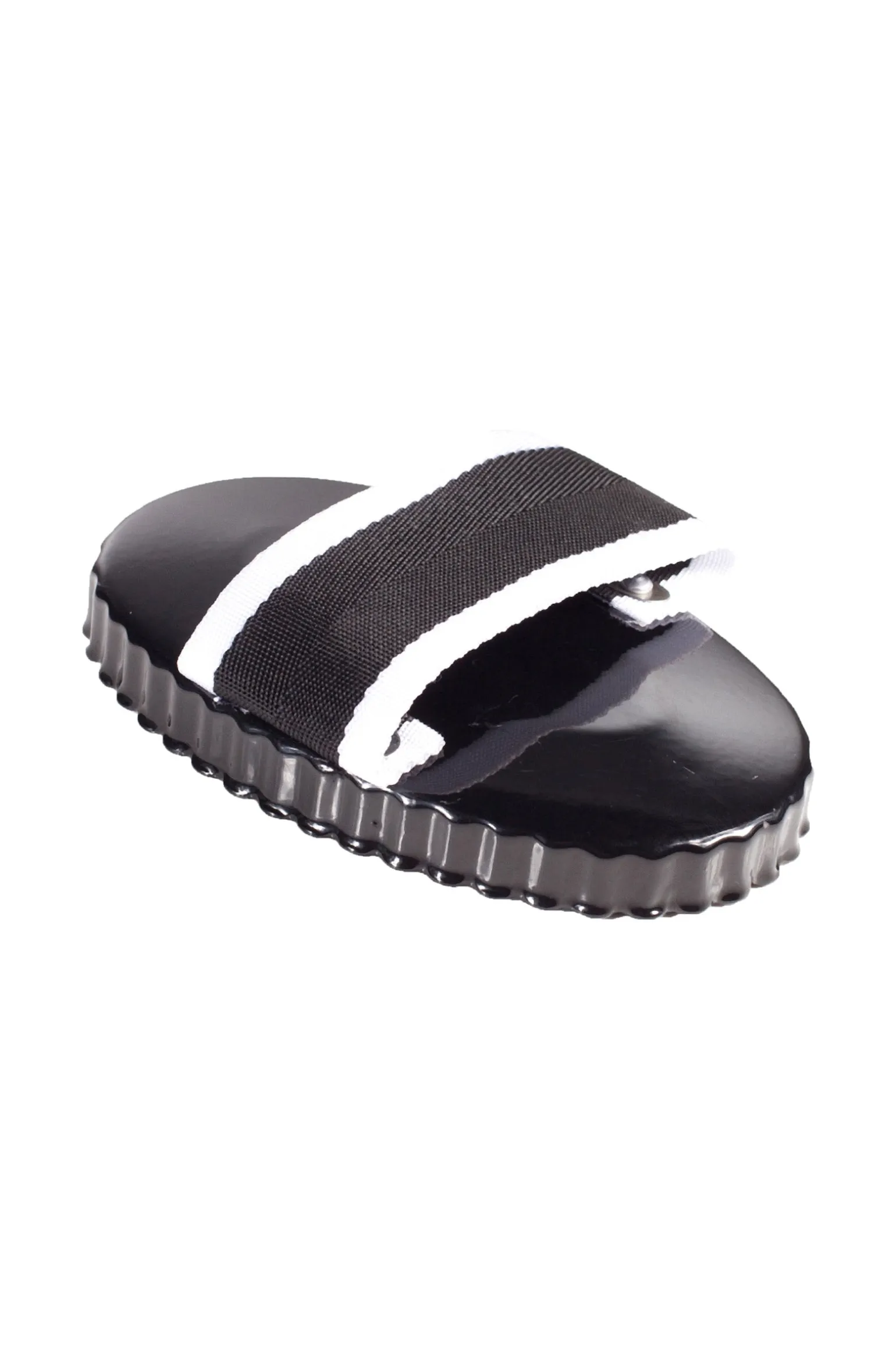 Federstriegel aus Metall. Ovale Form. Gewebte Handlasche.