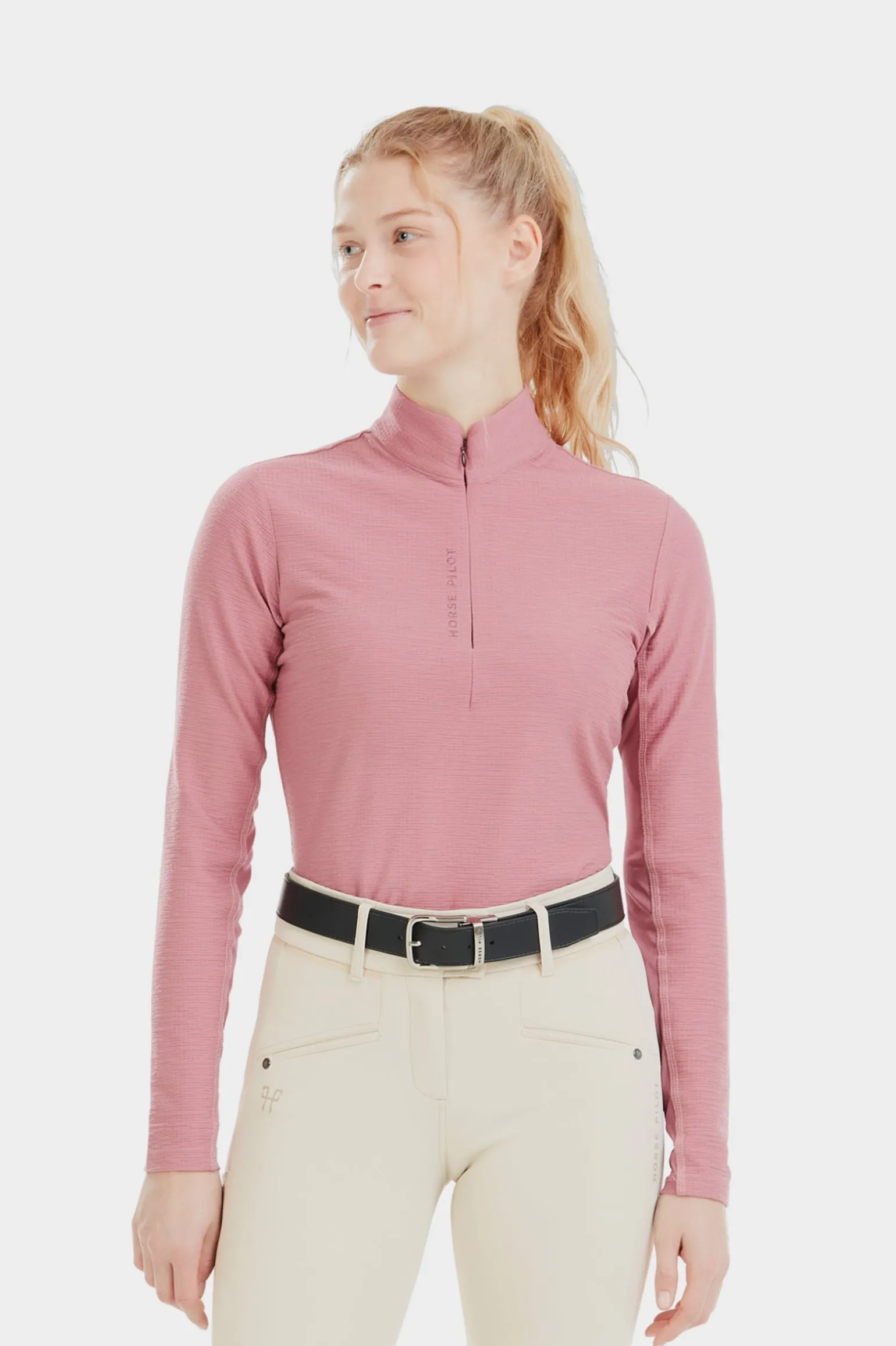 Dieses langärmlige T-Shirt ist dank des Meshs unter den Armen leicht und atmungsaktiv und bietet einen Slim Fit, einen hohen Reißverschlusskragen und einen angenehmen Waffelstoff. Ideal zum Reiten, bietet es effektiven UV-Schutz.