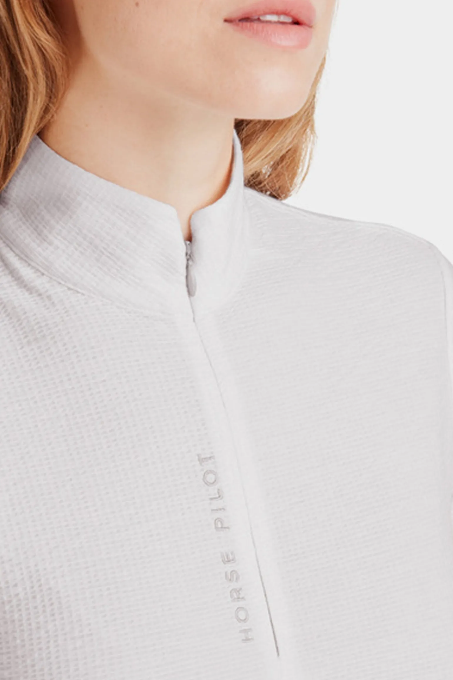 Dieses langärmlige T-Shirt ist dank des Meshs unter den Armen leicht und atmungsaktiv und bietet einen Slim Fit, einen hohen Reißverschlusskragen und einen angenehmen Waffelstoff. Ideal zum Reiten, bietet es effektiven UV-Schutz.