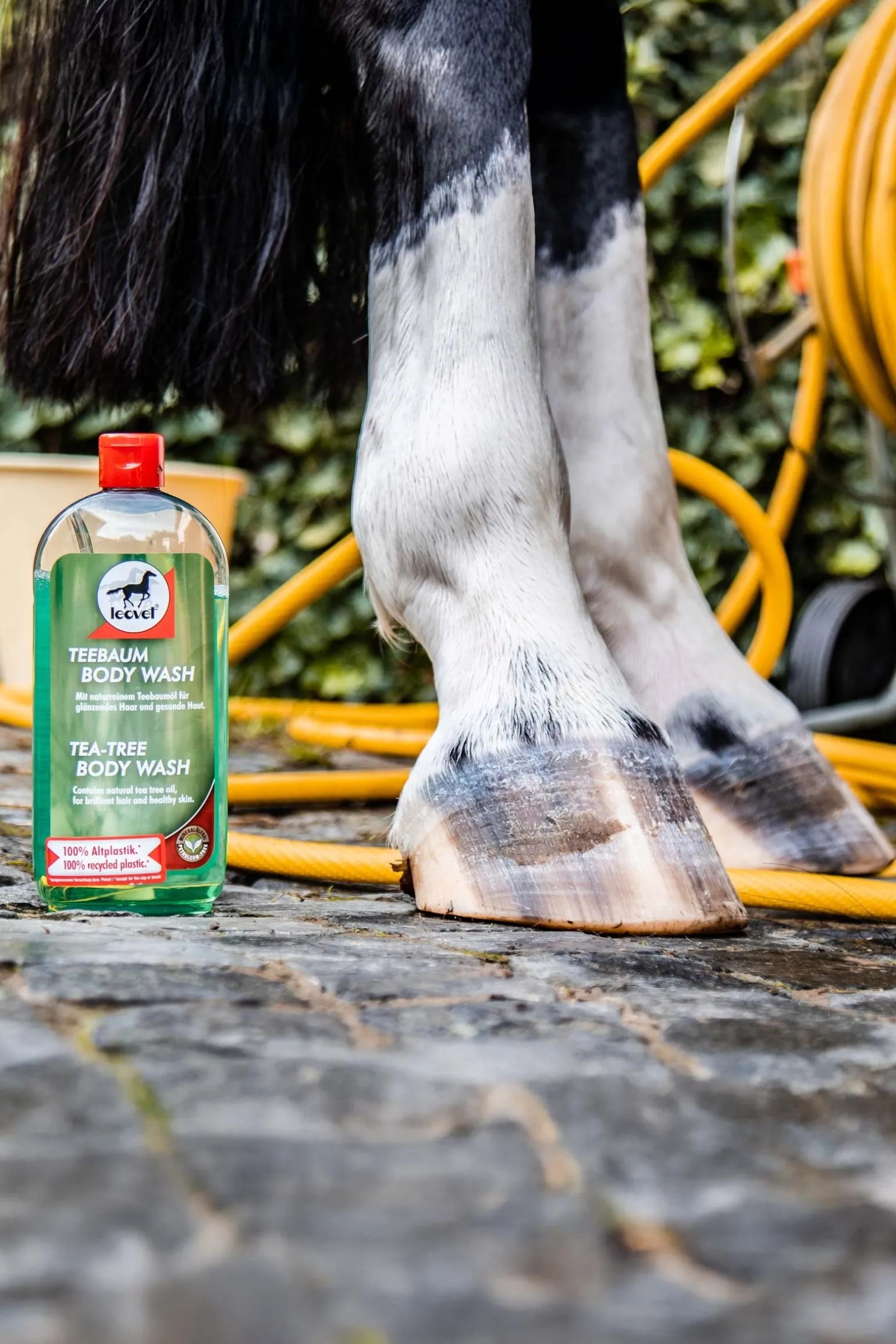 In das nasse Fell, Mähne und Schweif gründlich einmassieren und mit Wasser klarspülen.